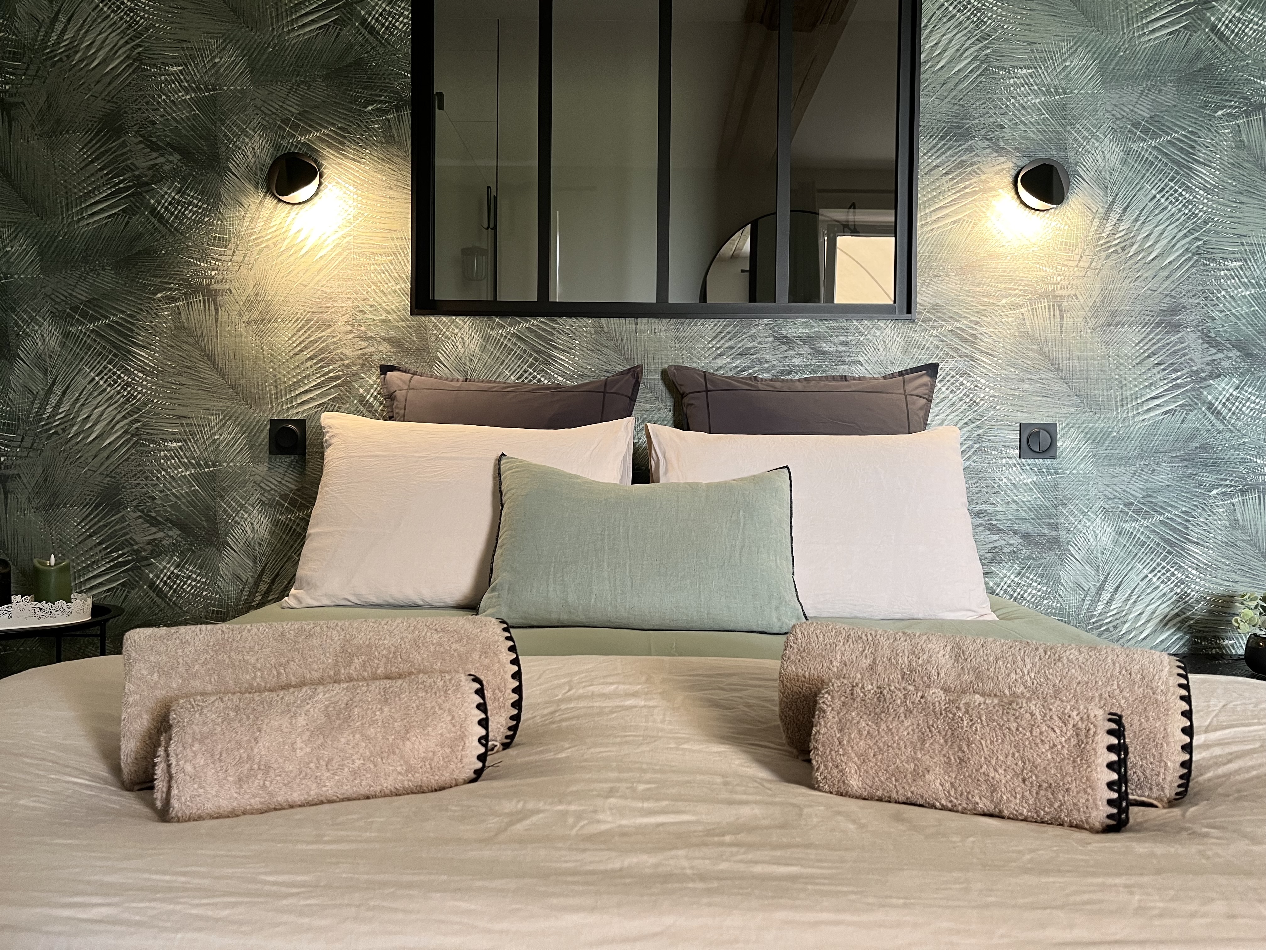 Côté chambre, pour des nuits reposantes, vous profiterez d’un lit Queen Size (160X200) de très bonne qualité. Les draps sont fournis.
