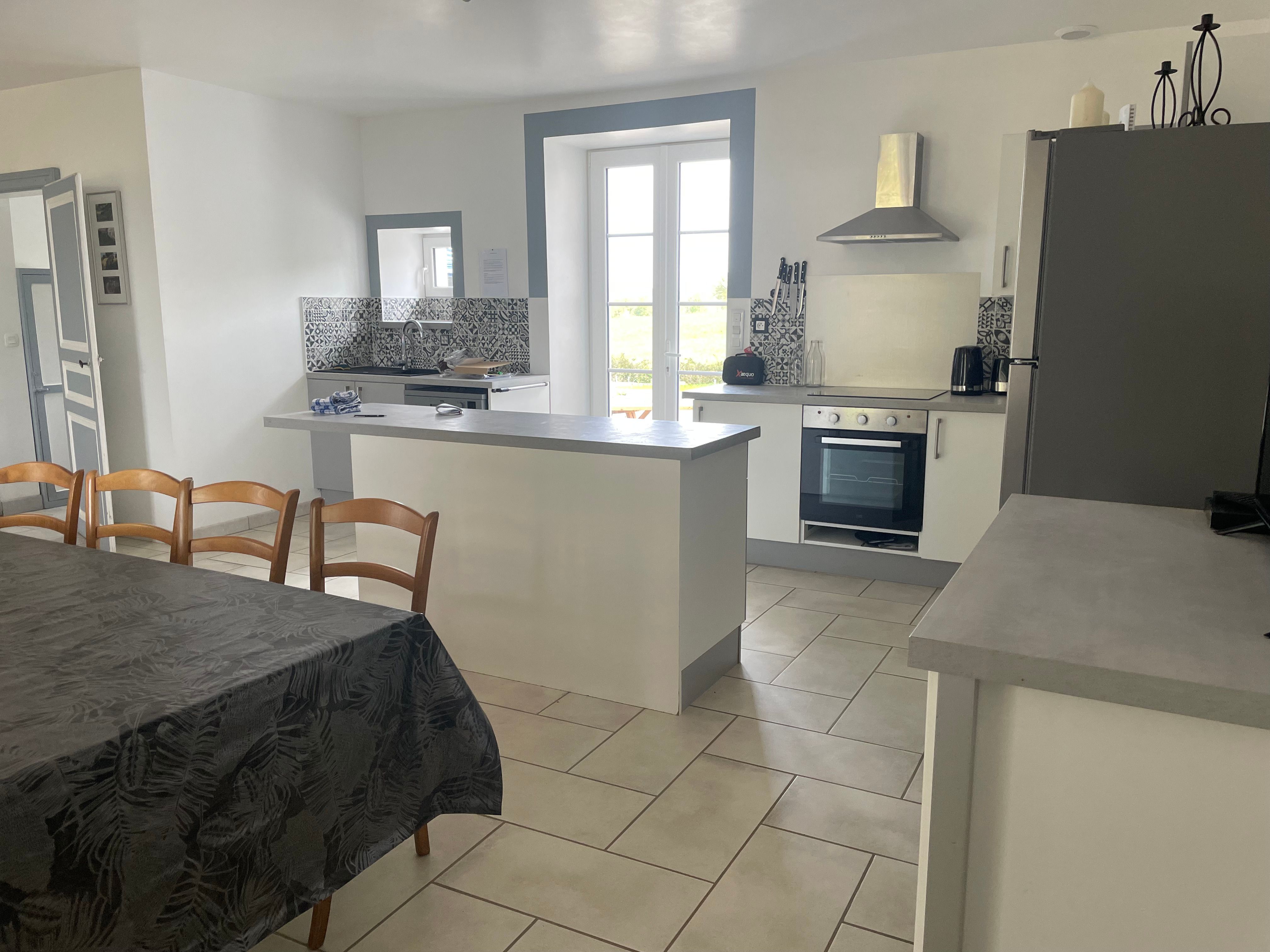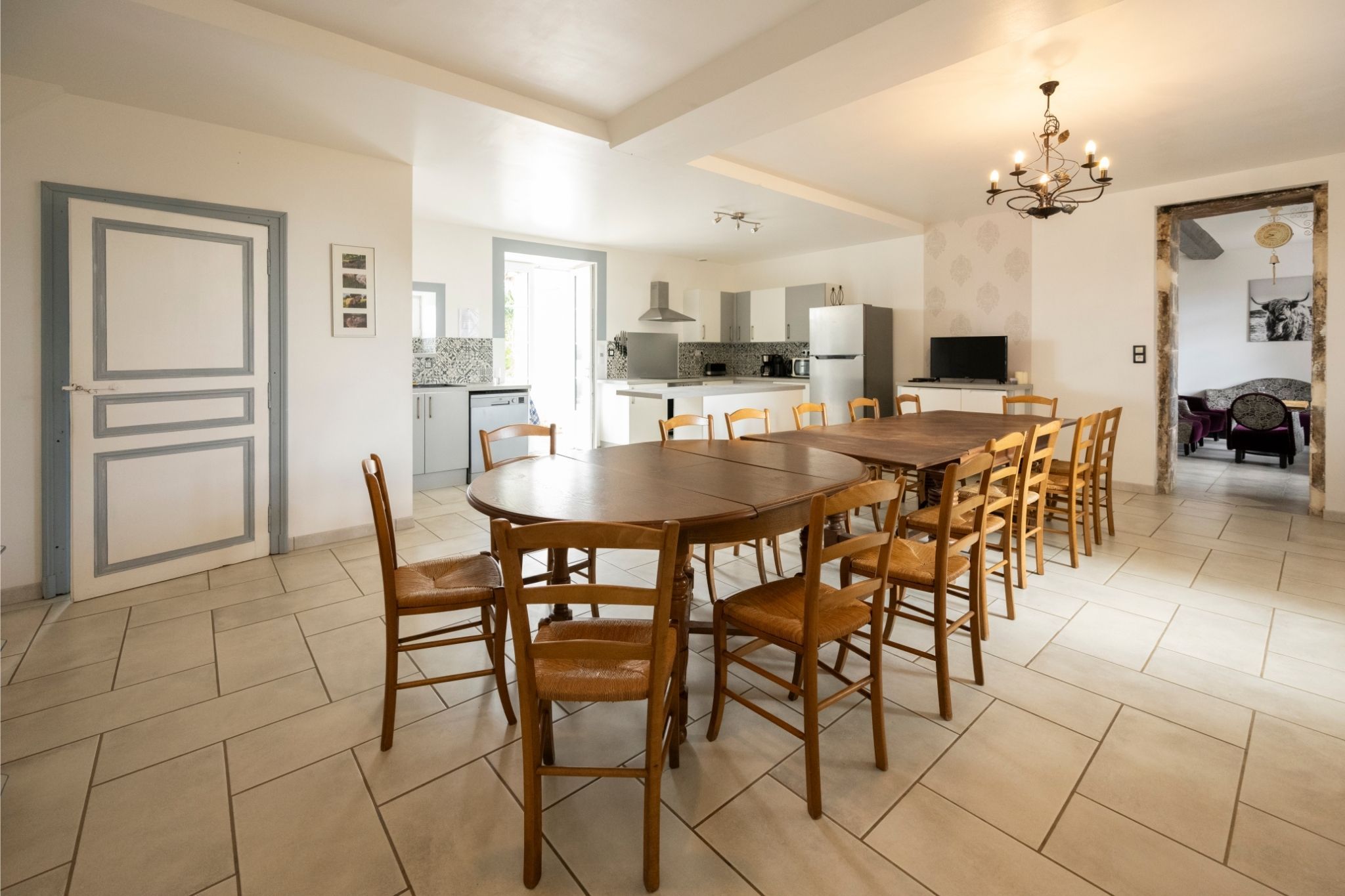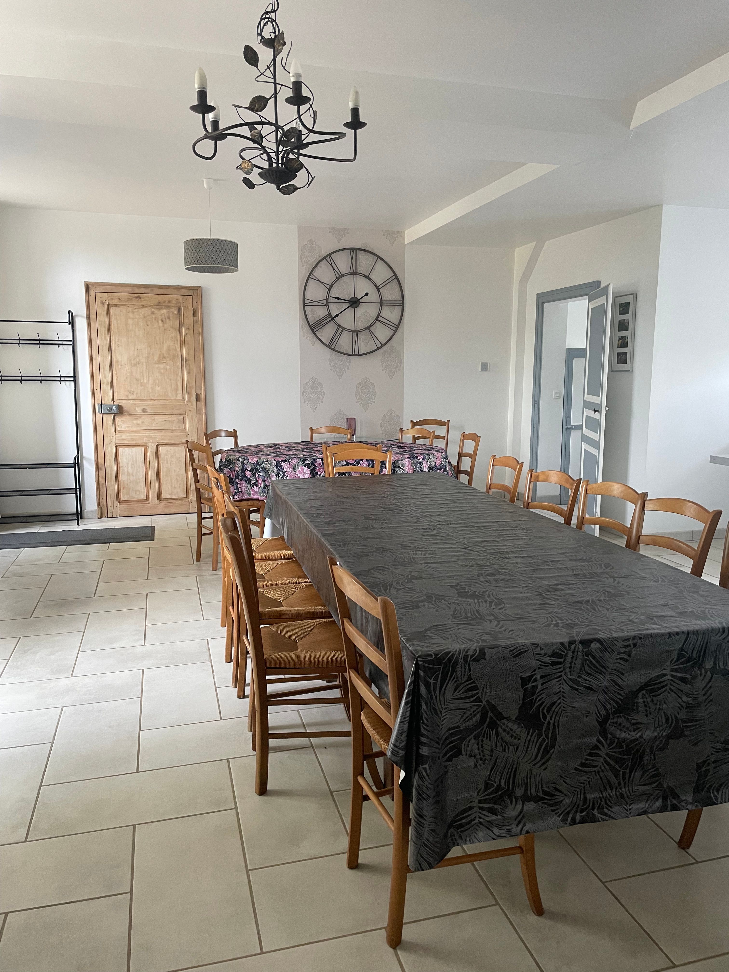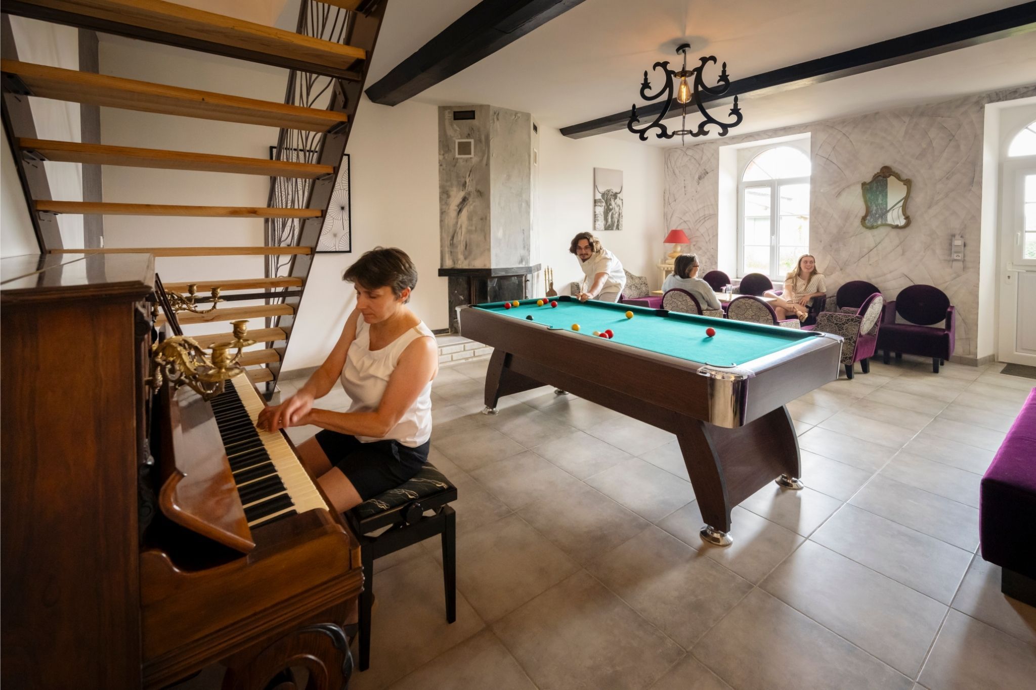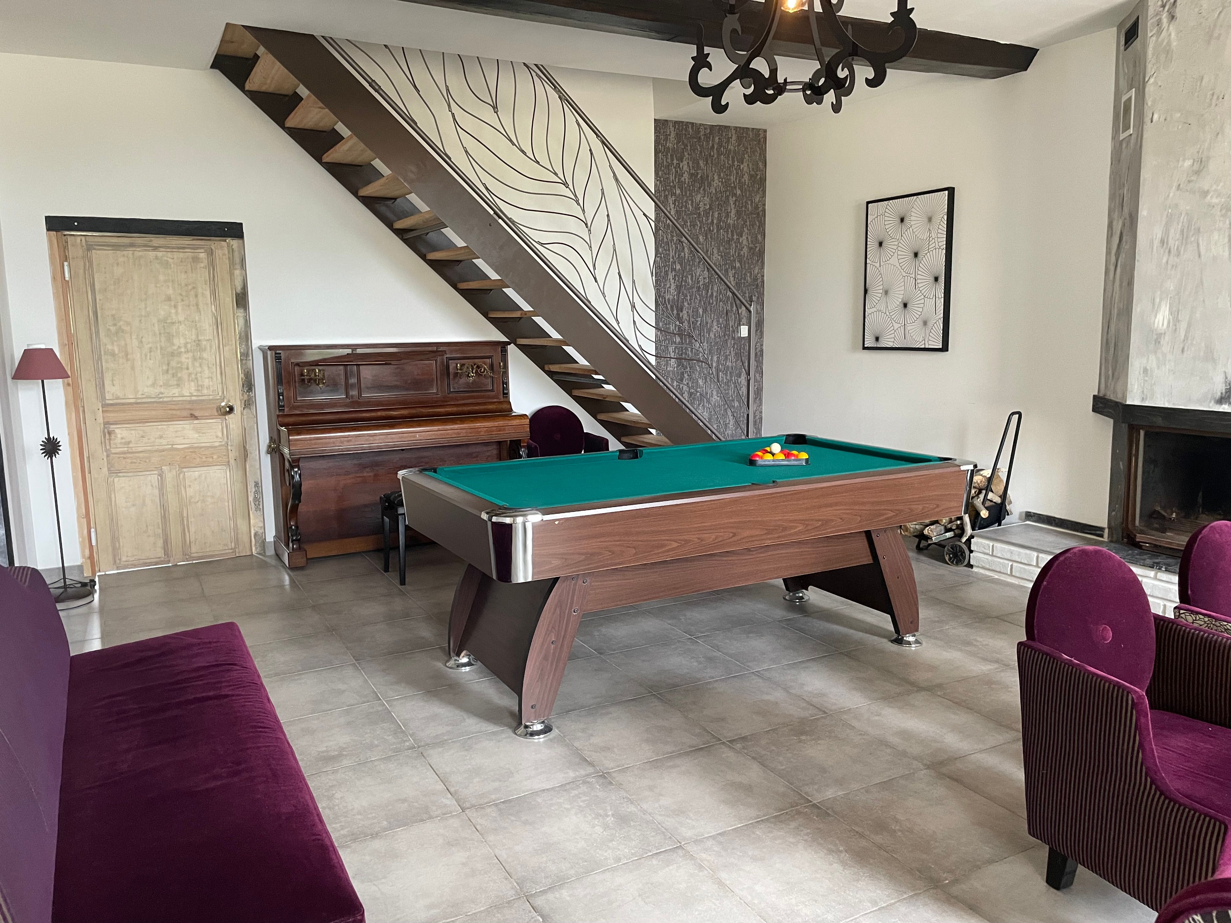 Au RDC, grand salon avec billard, écran plat et cheminée. Une grande cuisine toute équipée avec espace repas. Chambre PMR avec 1 lit, salle d’eau et wc privatifs adaptés