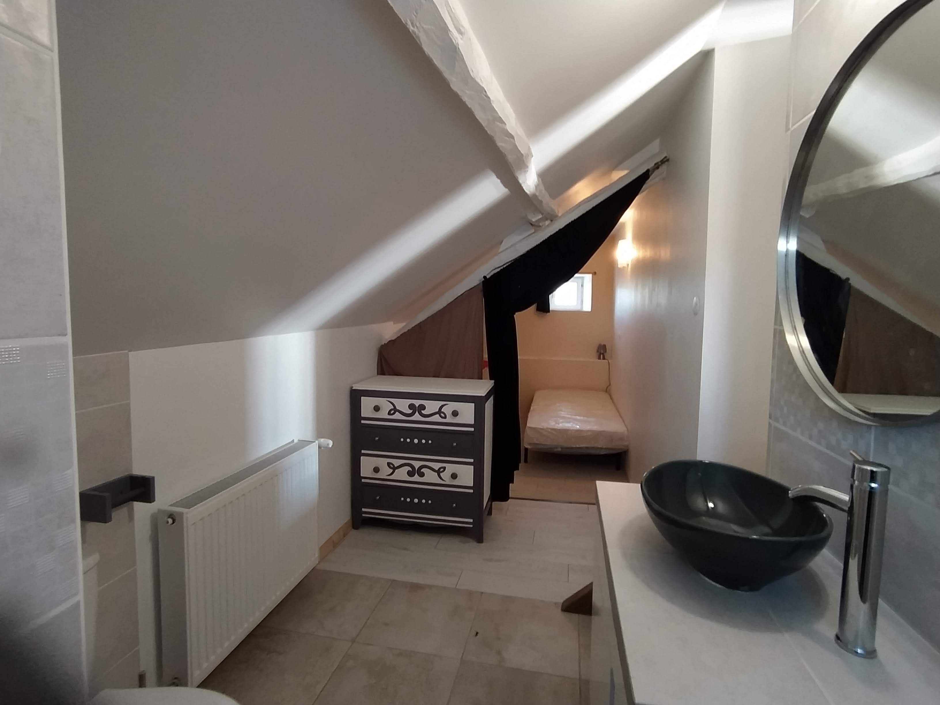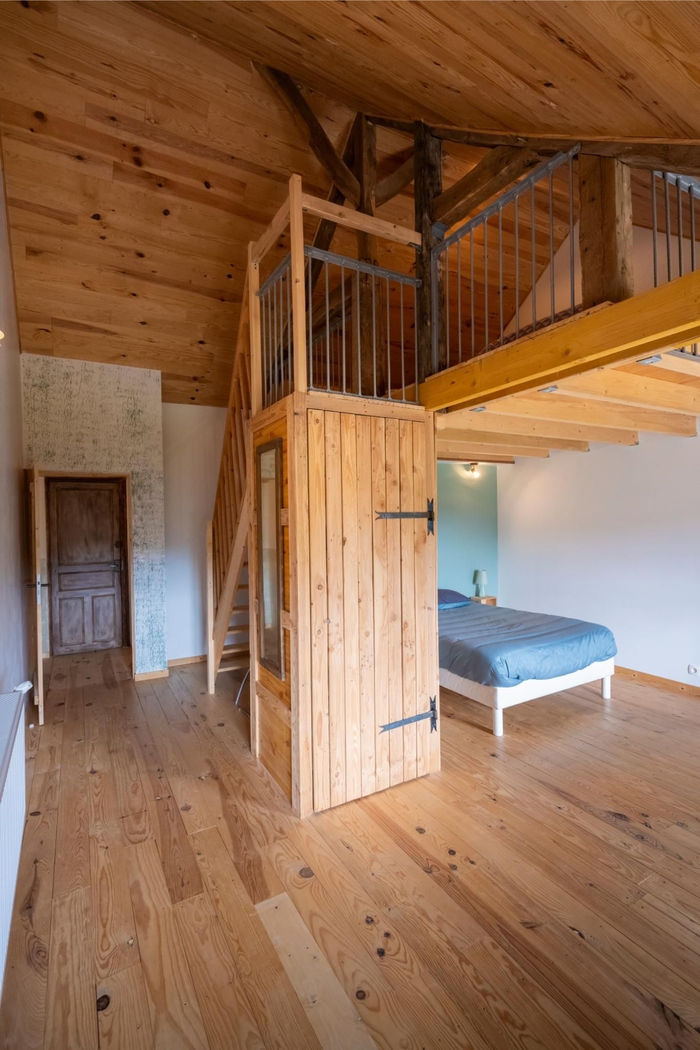 – 1 ch mezzanine avec 1 lit 140 en partie basse et 2 lits 90 en partie haute, salle d’eau et wc privatif à la chambre.