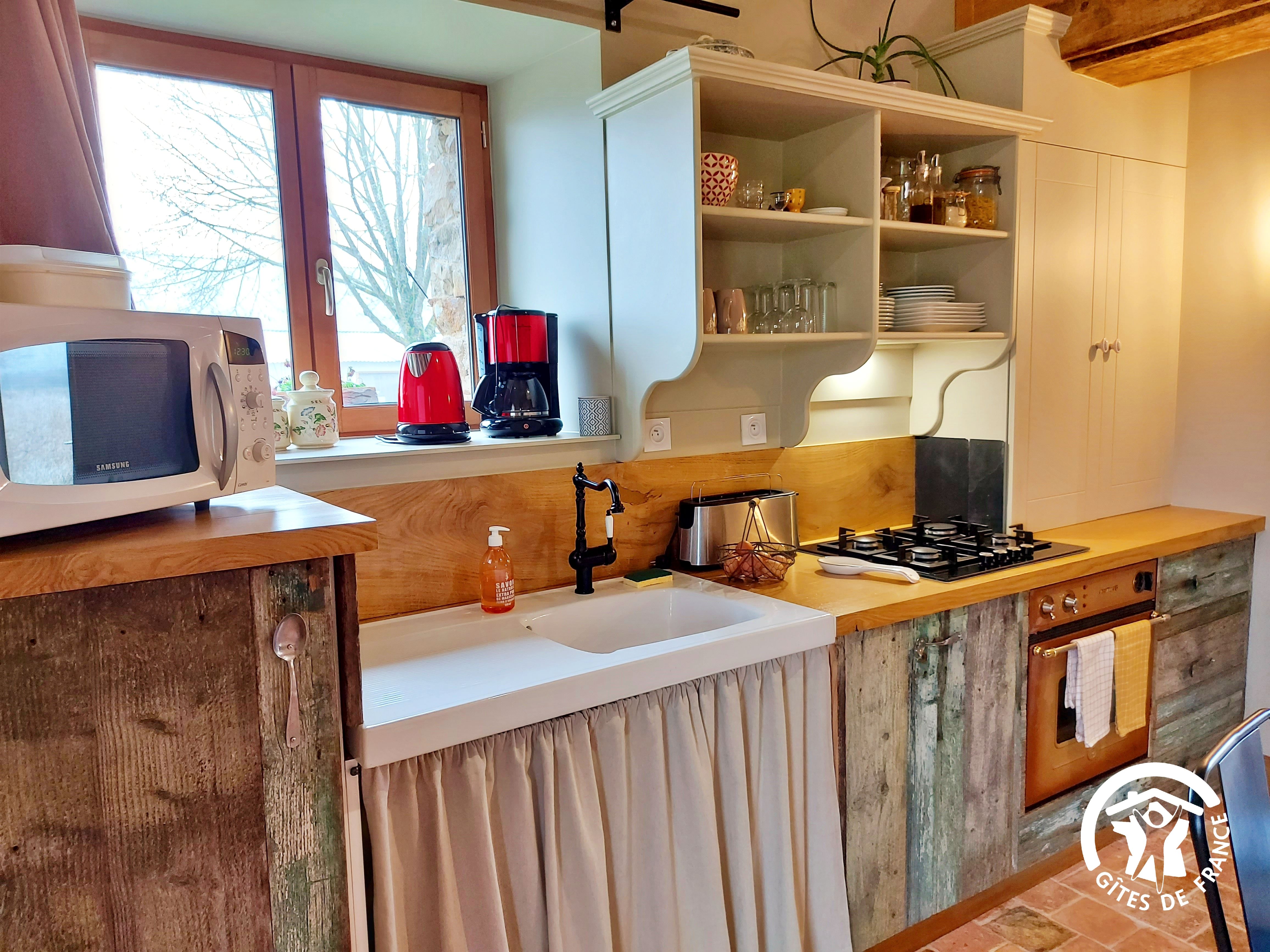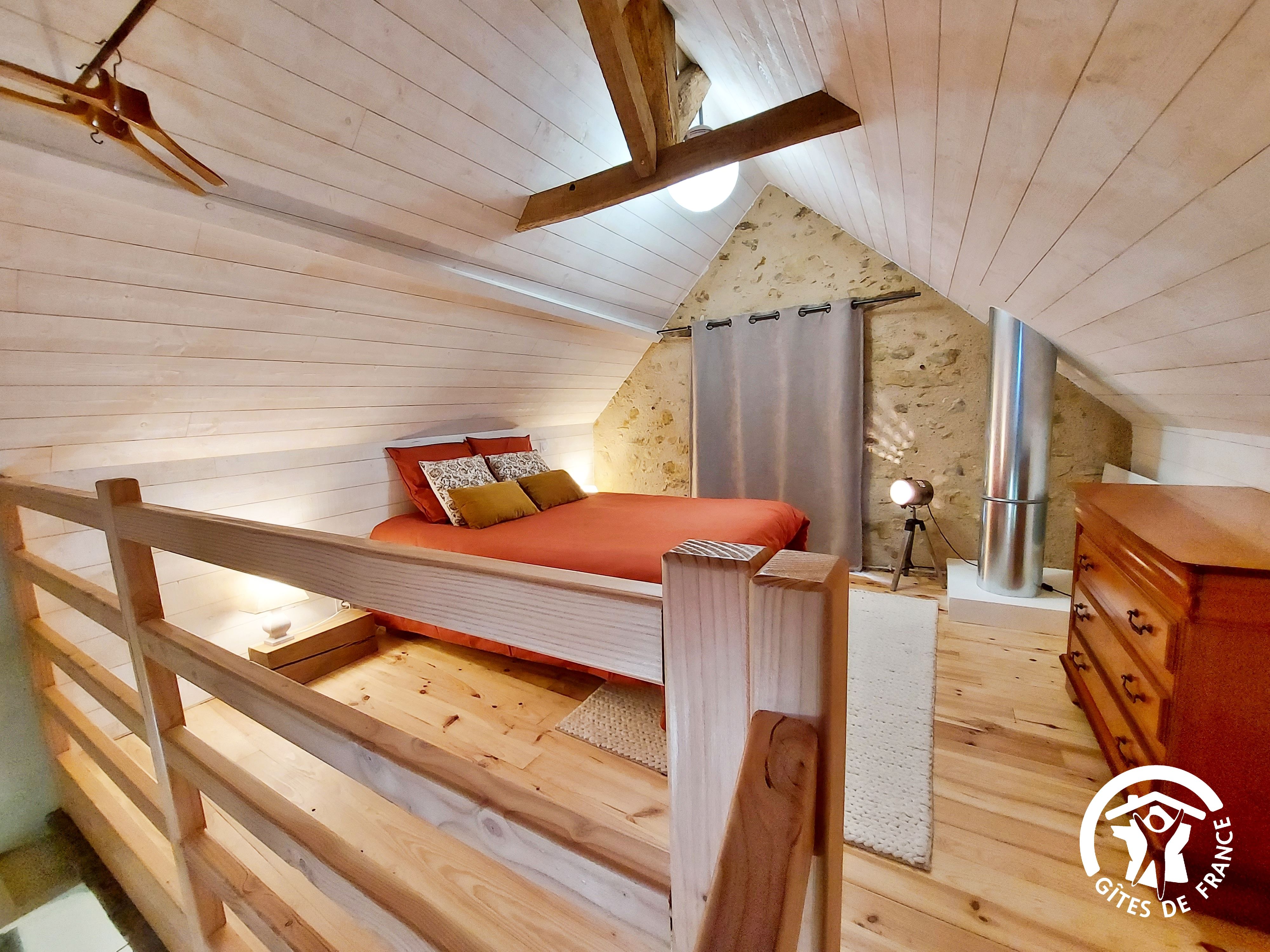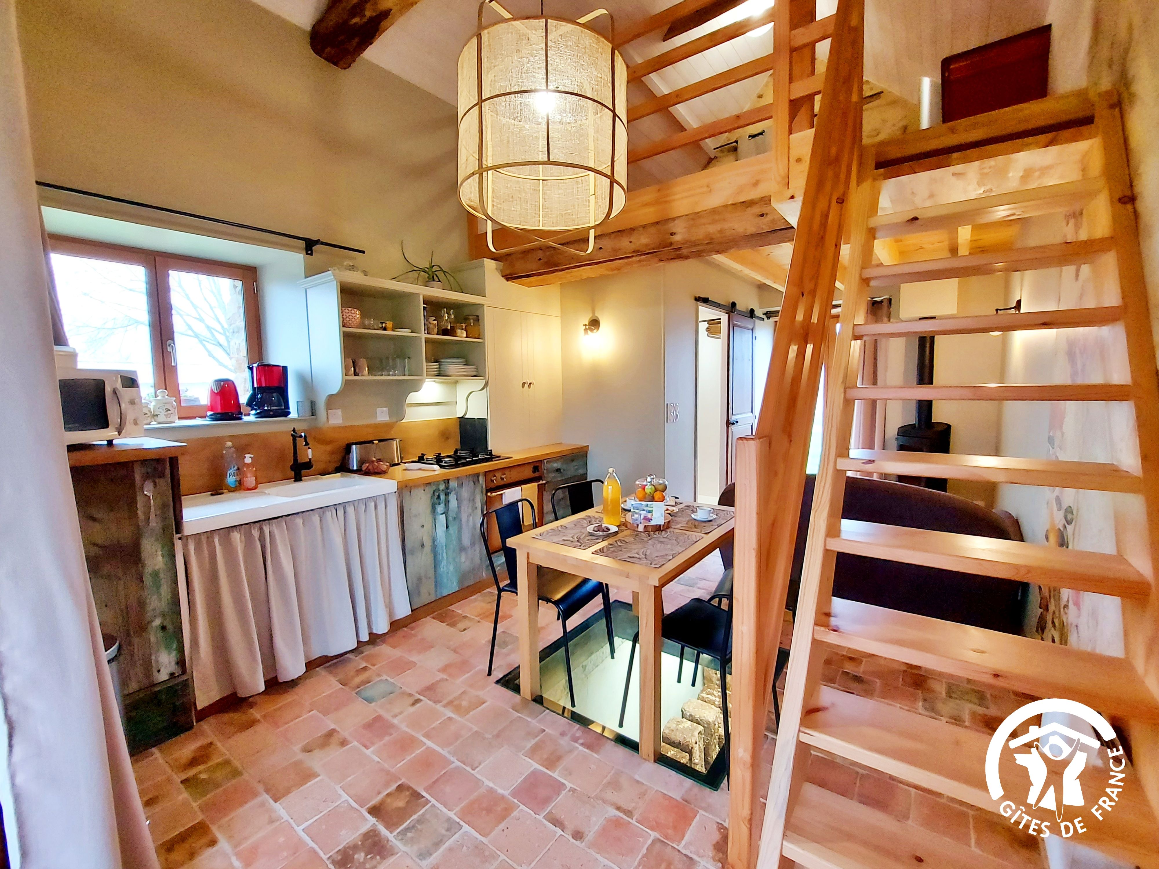 Besoin de vous ressourcer ? Ce gîte décoré avec beaucoup de goût et offrant tout le confort est idéal pour faire une coupure ! Entouré de prairies, sa terrasse abritée vous permet de vivre dedans et dehors. L’espace cuisine est au-dessus d’une cave de production de champignons, une vitre vous permet de les observer de début septembre jusqu’à fin juin. La chambre en mezzanine offre une belle vue sur la campagne.