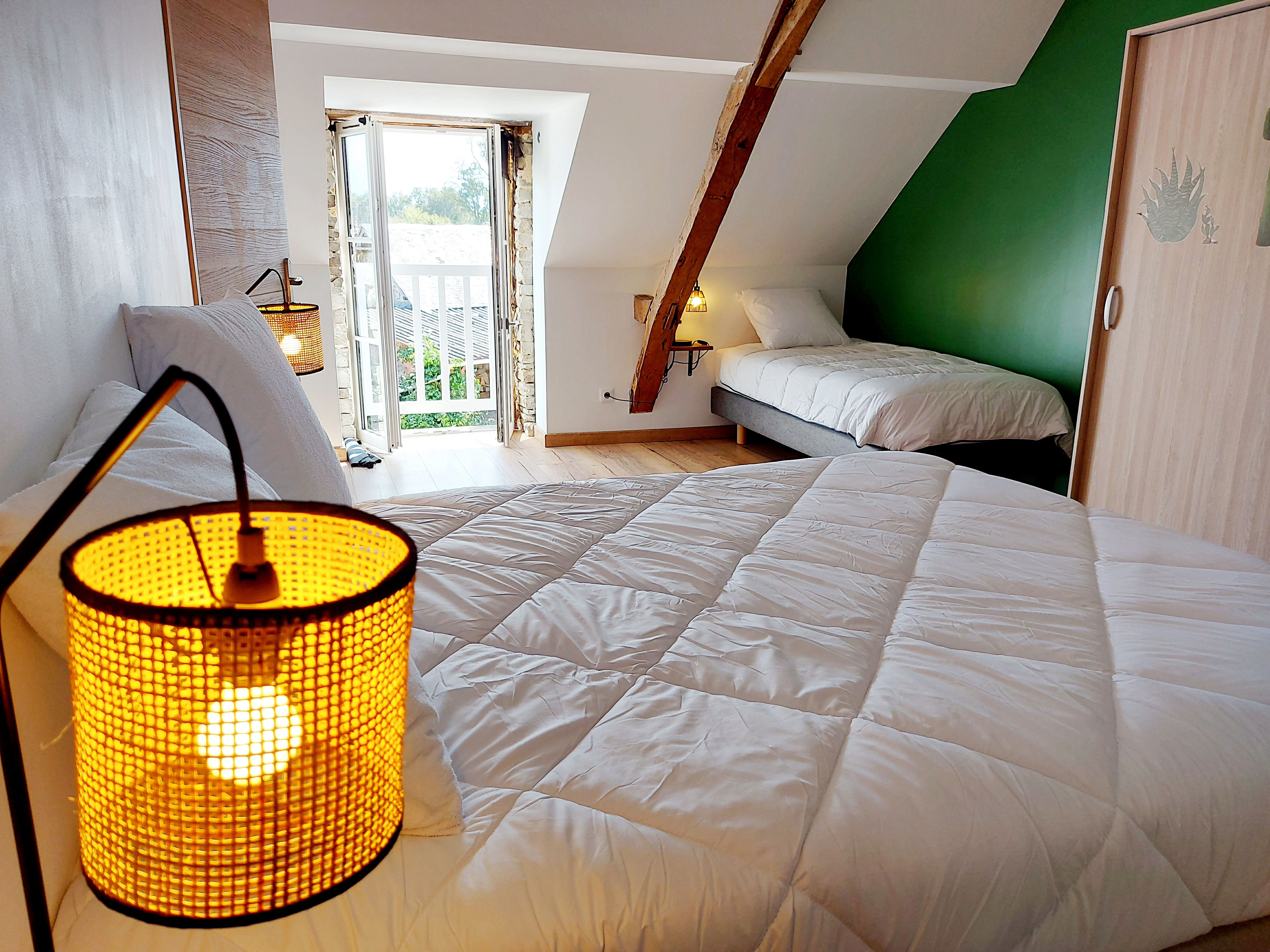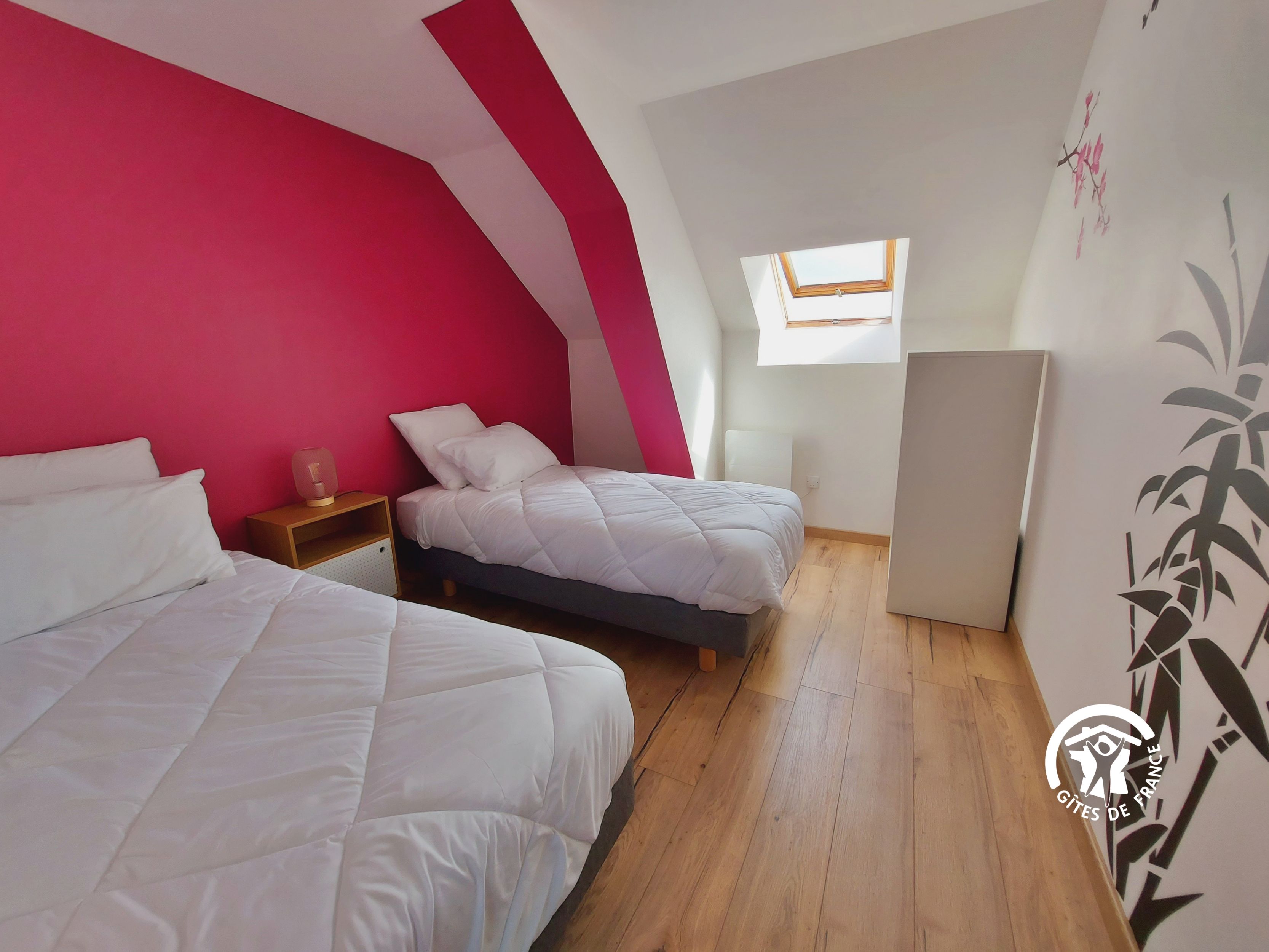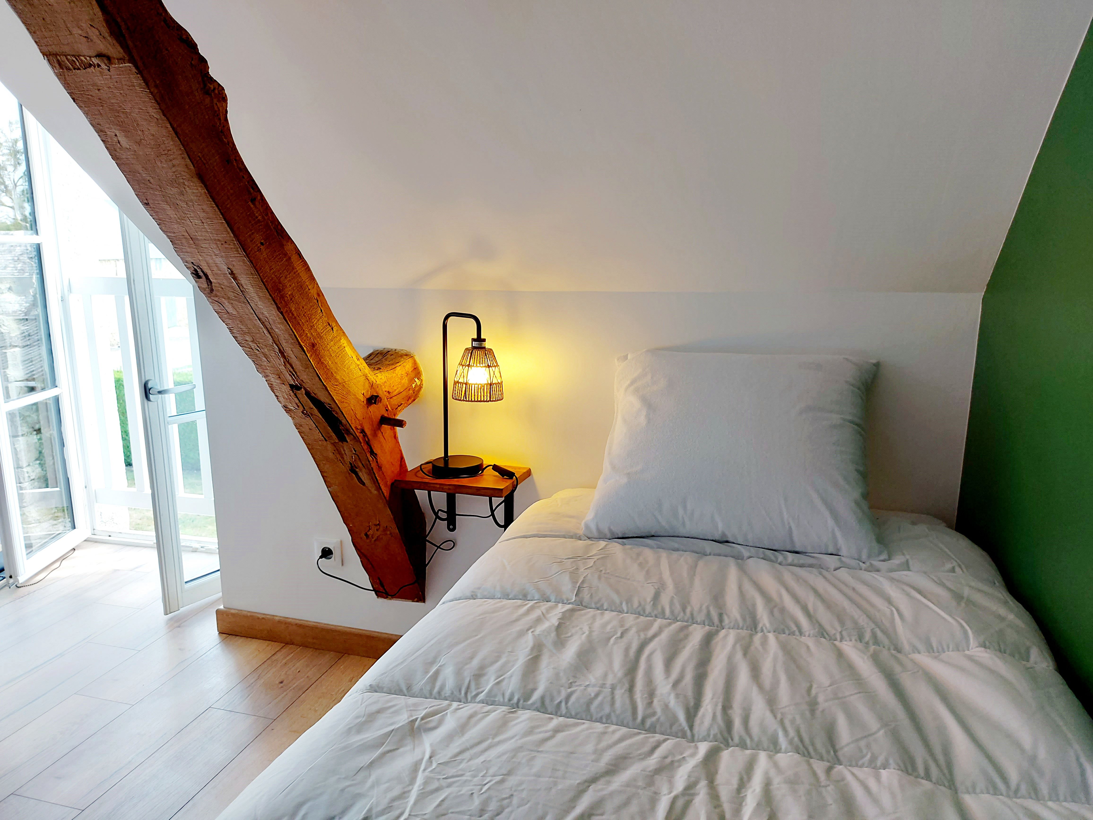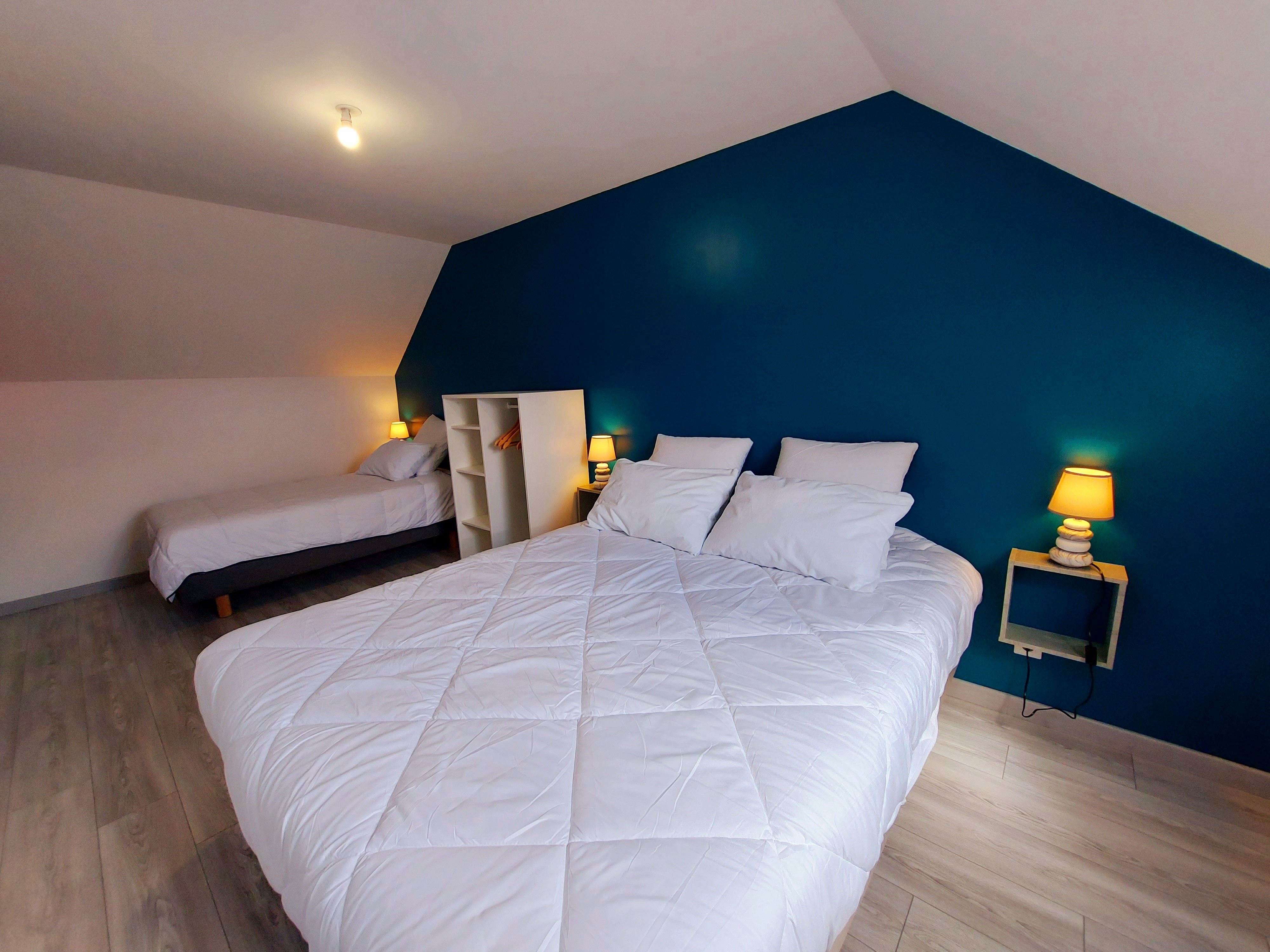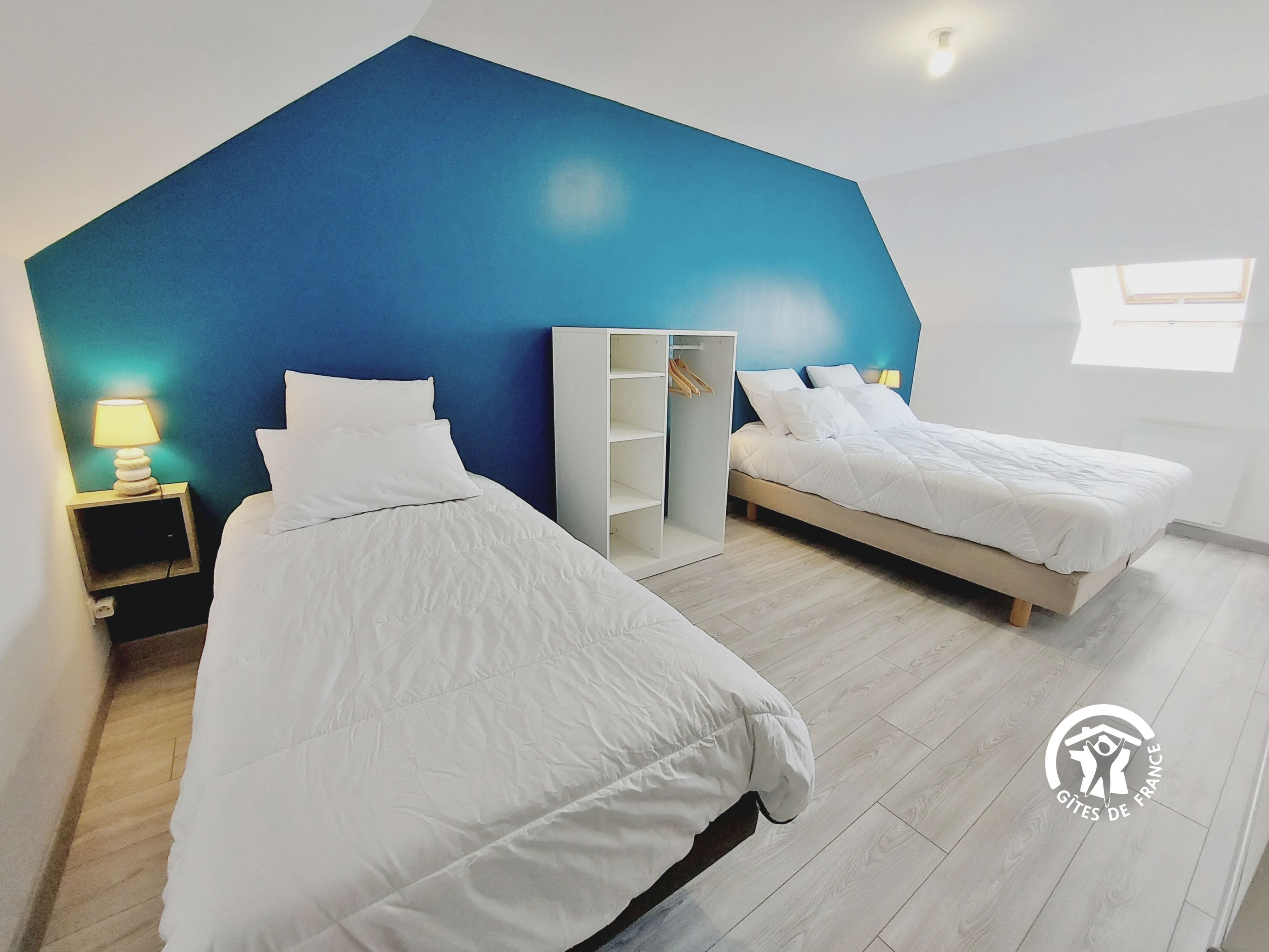A l’étage, 4 chambres, autant d’ambiances et de configurations : 1 avec 2 lits simples, 1 avec 1 lit double, 1 avec 1 lit simple et 1 lit double, et la dernière 2 lits simples et 1 lit double. Au total : 2 salles d’eau/de bain et 2 wc indépendants.