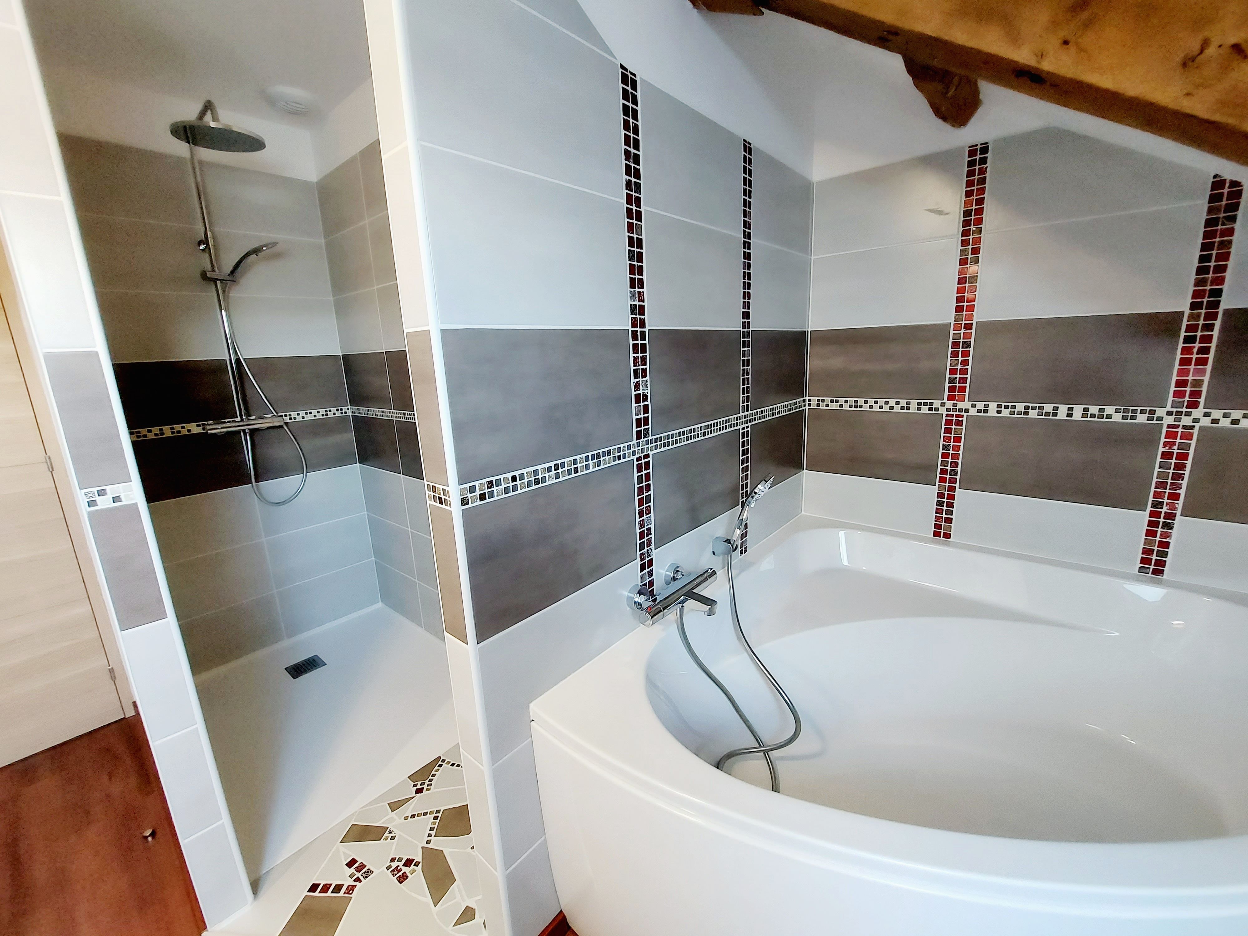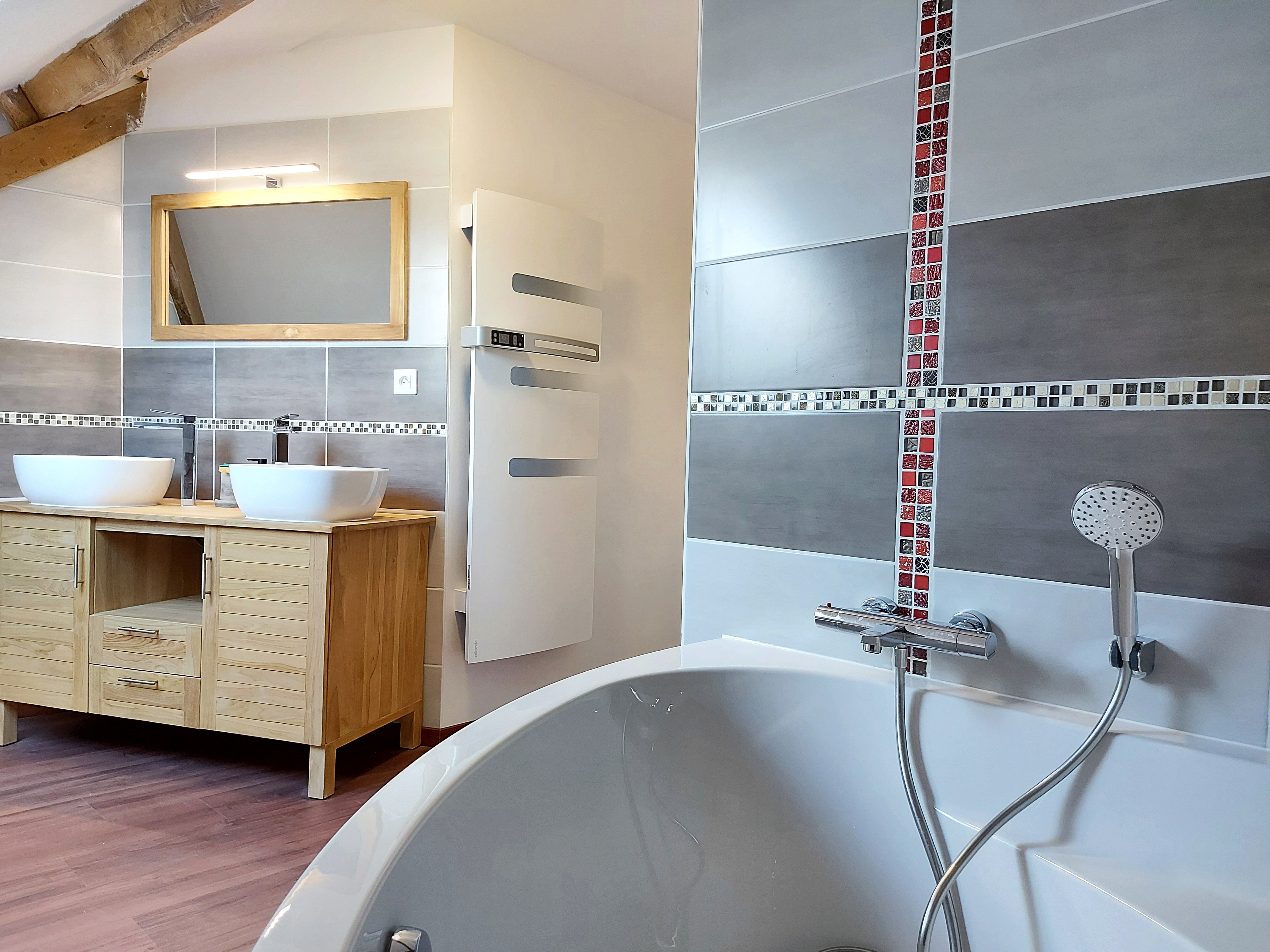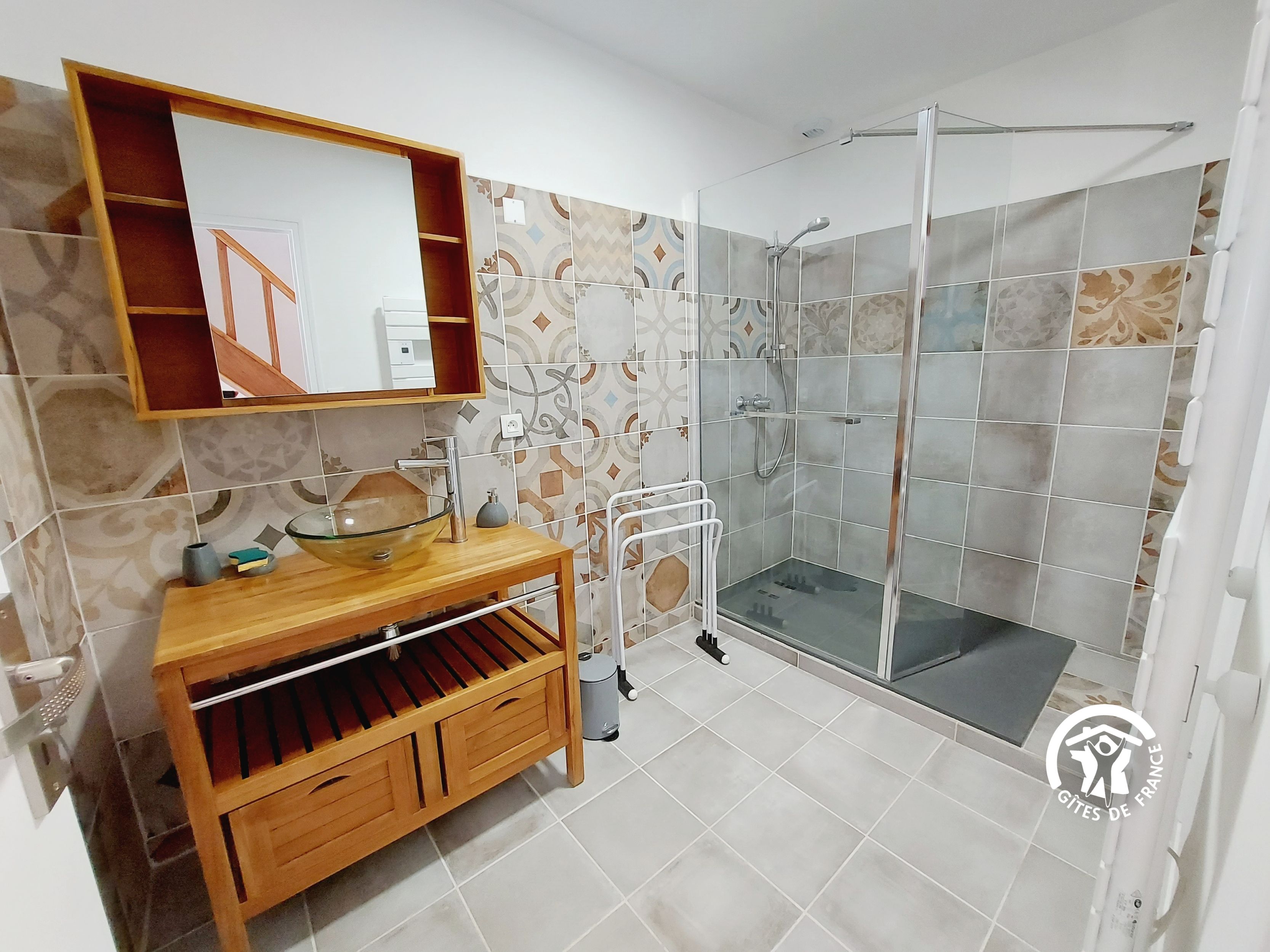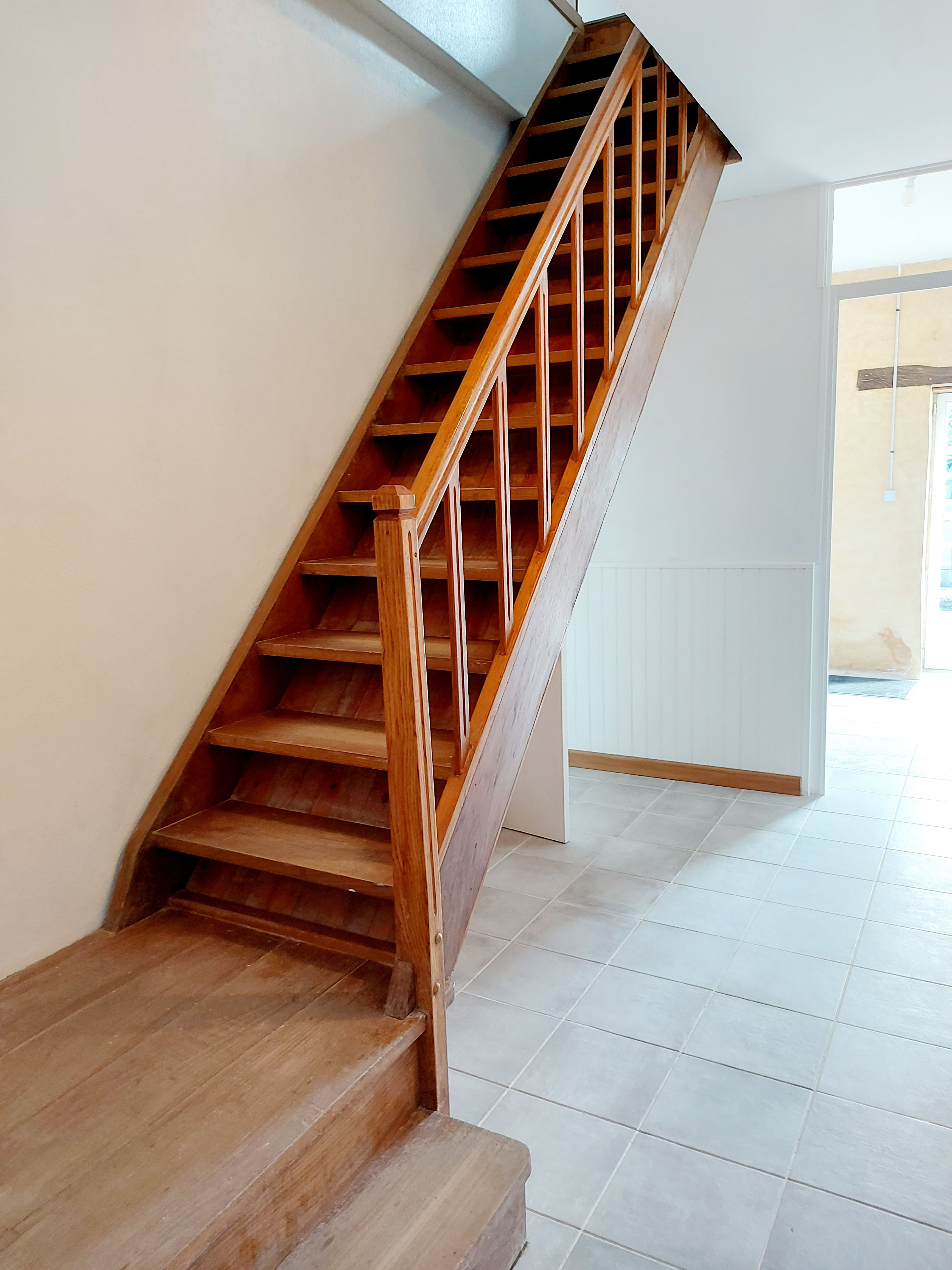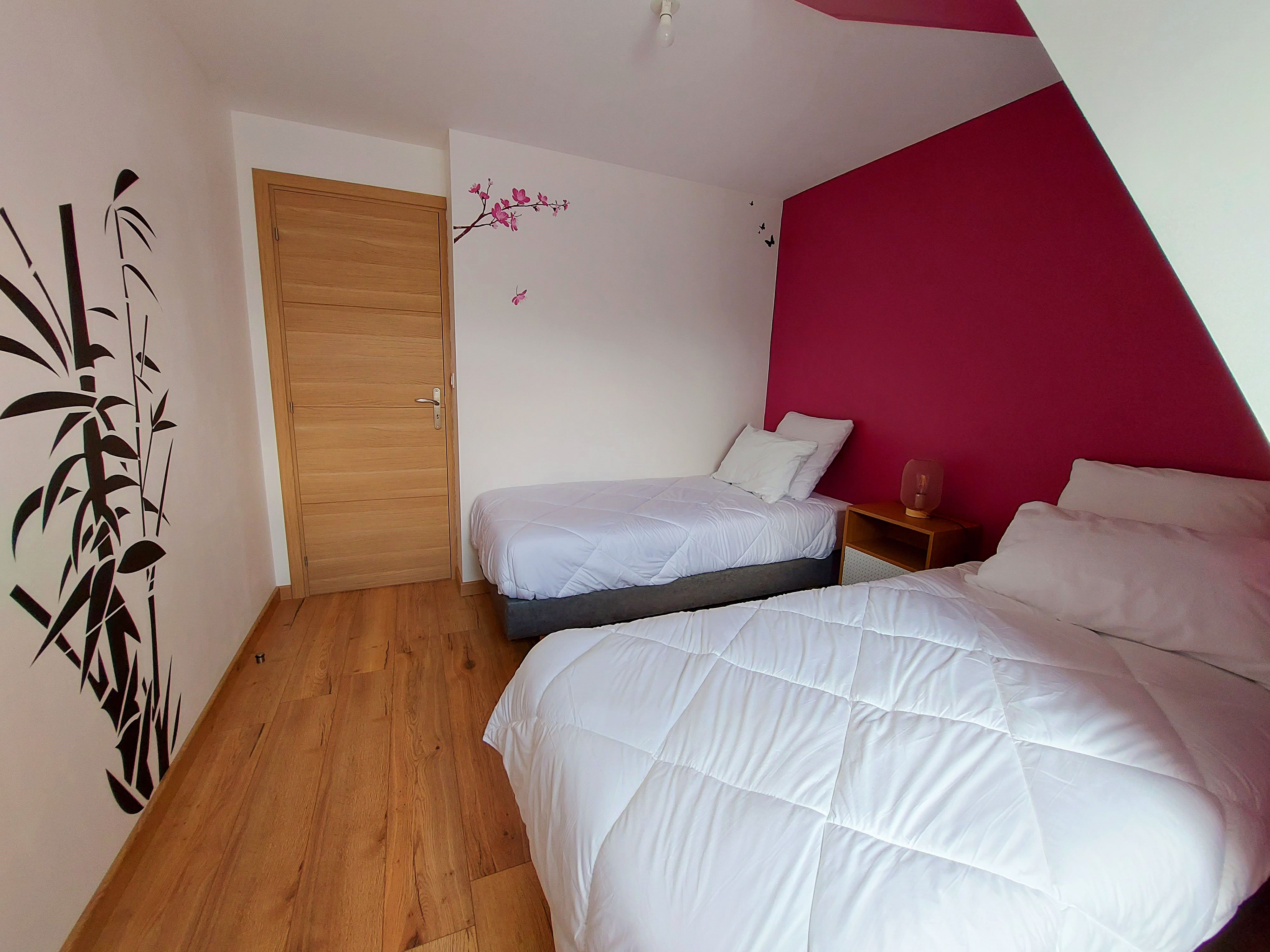 A l’étage, 4 chambres, autant d’ambiances et de configurations : 1 avec 2 lits simples, 1 avec 1 lit double, 1 avec 1 lit simple et 1 lit double, et la dernière 2 lits simples et 1 lit double. Au total : 2 salles d’eau/de bain et 2 wc indépendants.