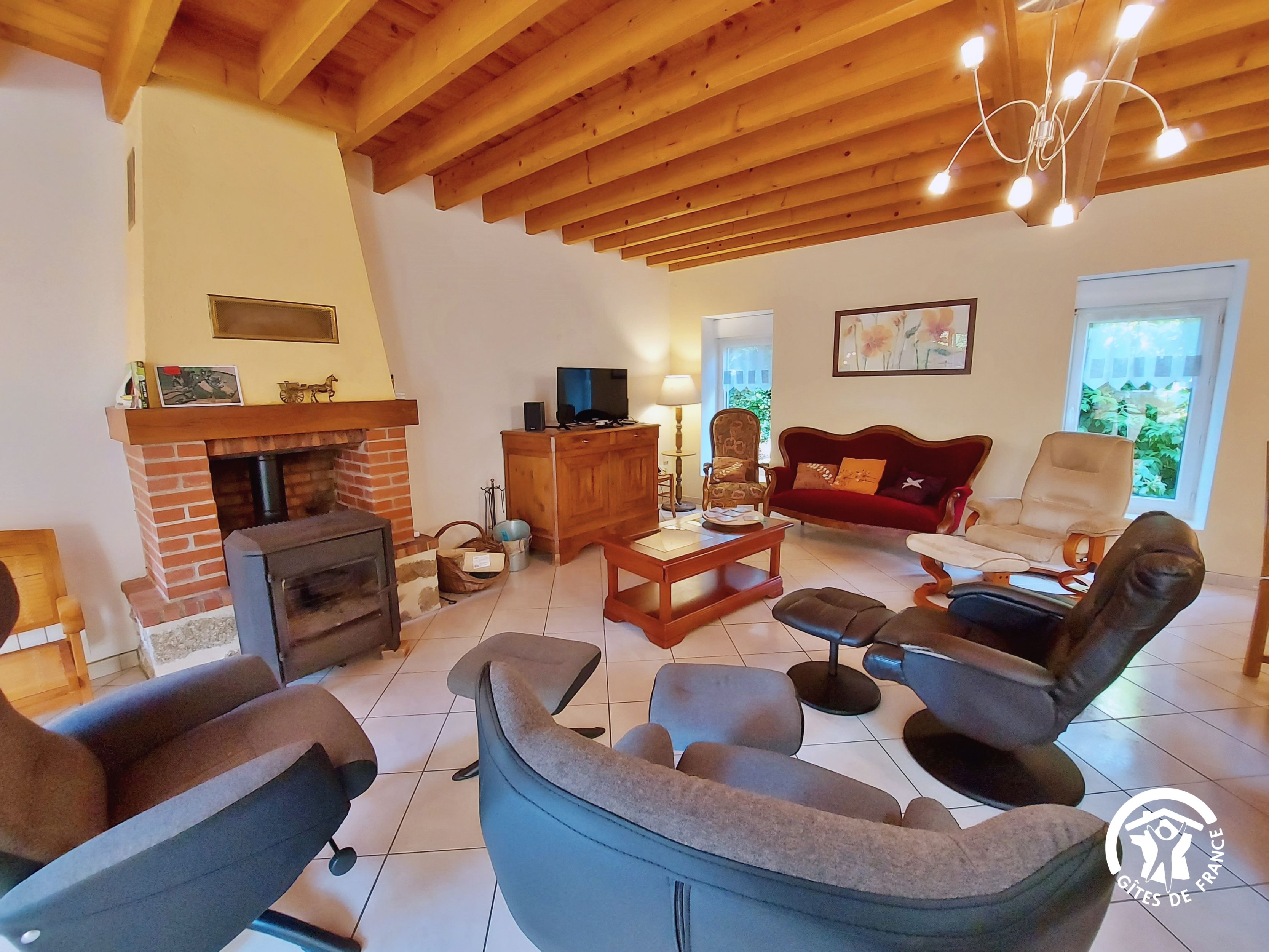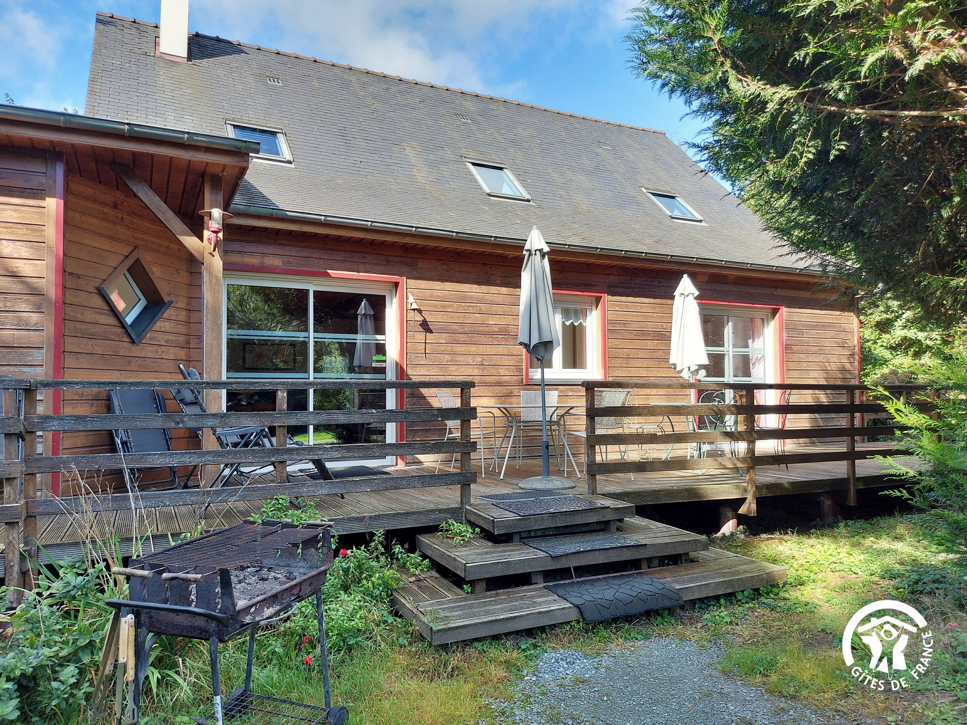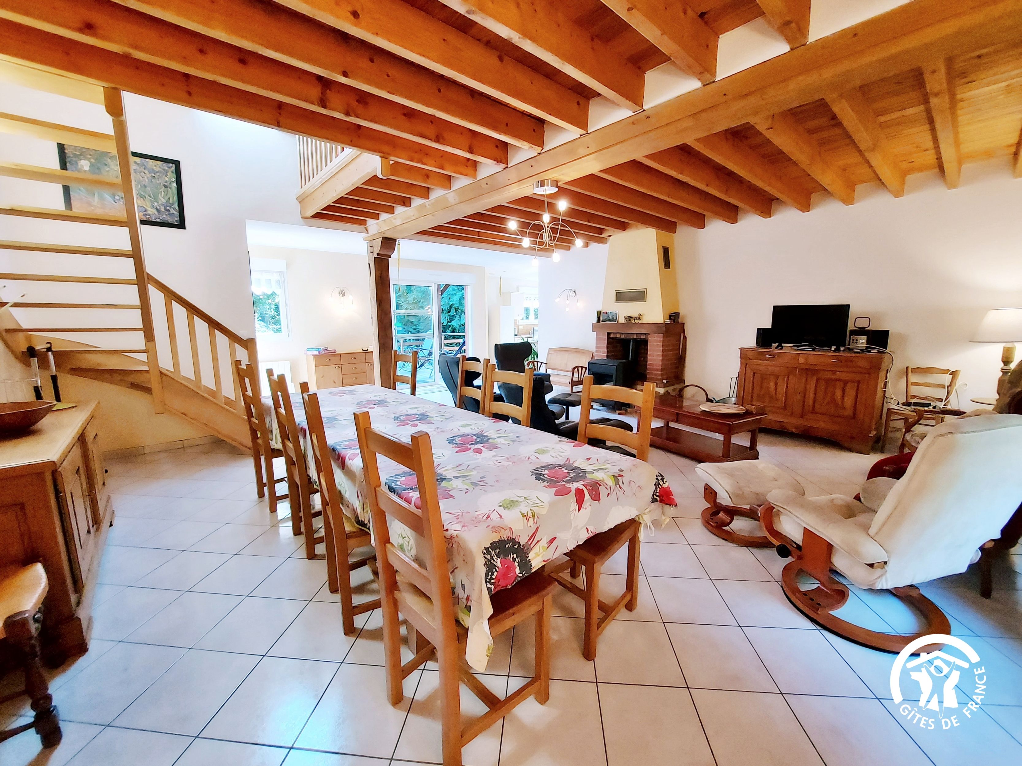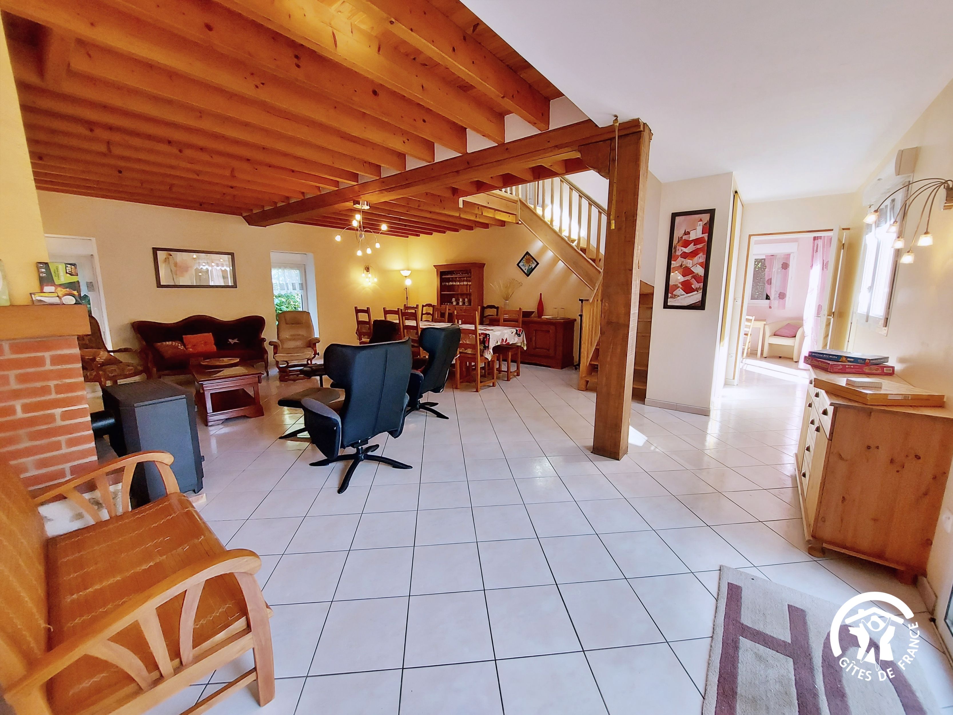 Conçu pour 8 personnes, le rez-de-chaussée est dévolu aux pièces de vie, cuisine et séjour, ainsi qu’une chambre avec sa salle d’eau et wc privatifs. Ce niveau avait été conçu pour les personnes à mobilité réduite : accès à la terrasse par une rampe, sans marche entre les pièces de vie. A l’étage, deux chambres supplémentaires, une salle de bain et un wc indépendant. Au total 4 lits de 90*190 (dont 1 lit pliant) et 3 lits 140*190. Le poêle à bois offre une chaleur agréable en inter-saison et l’hiver (bois inclus). Longue terrasse en surplomb, avec mobilier de jardin et garage avec table de ping-pong.