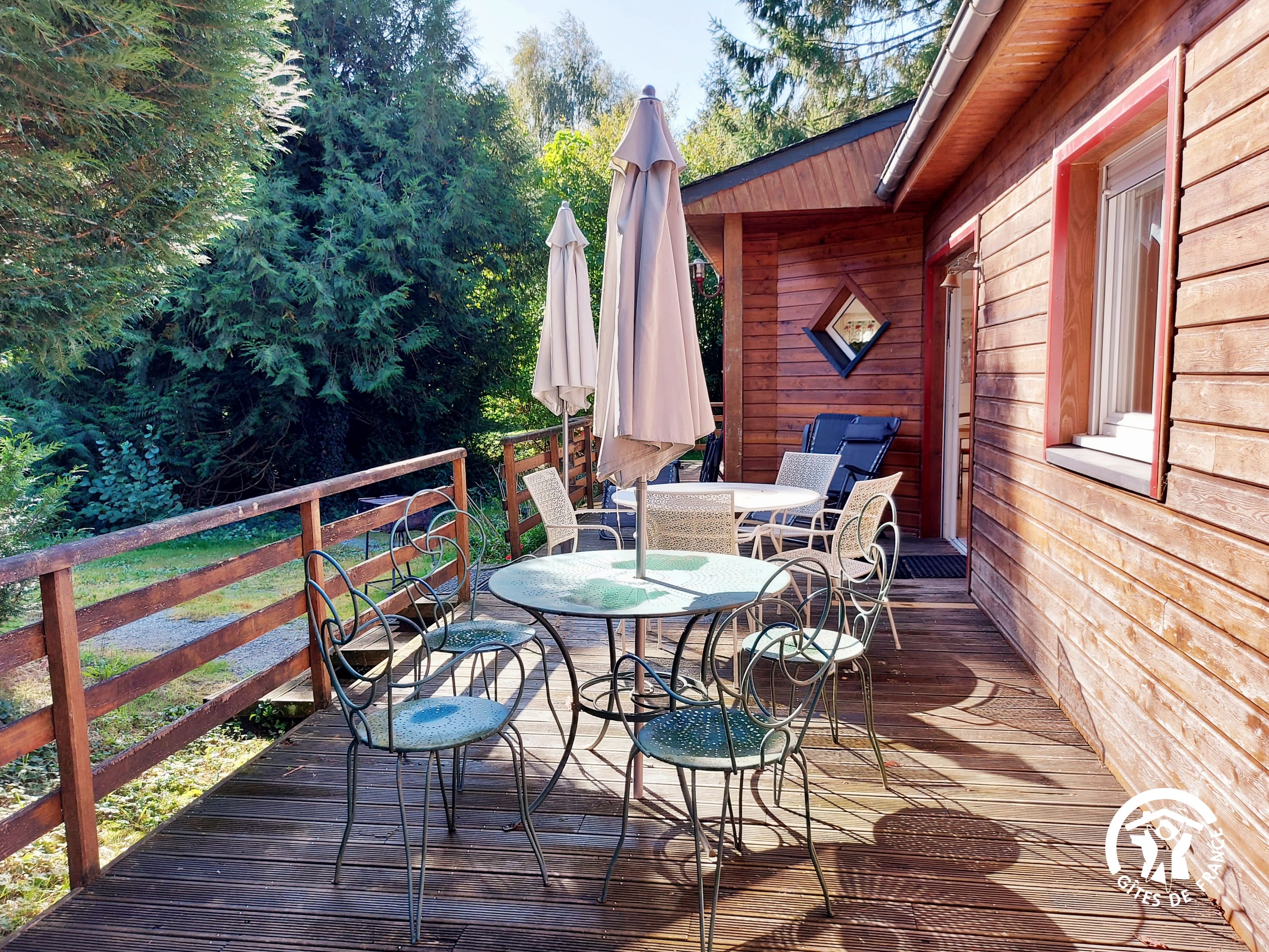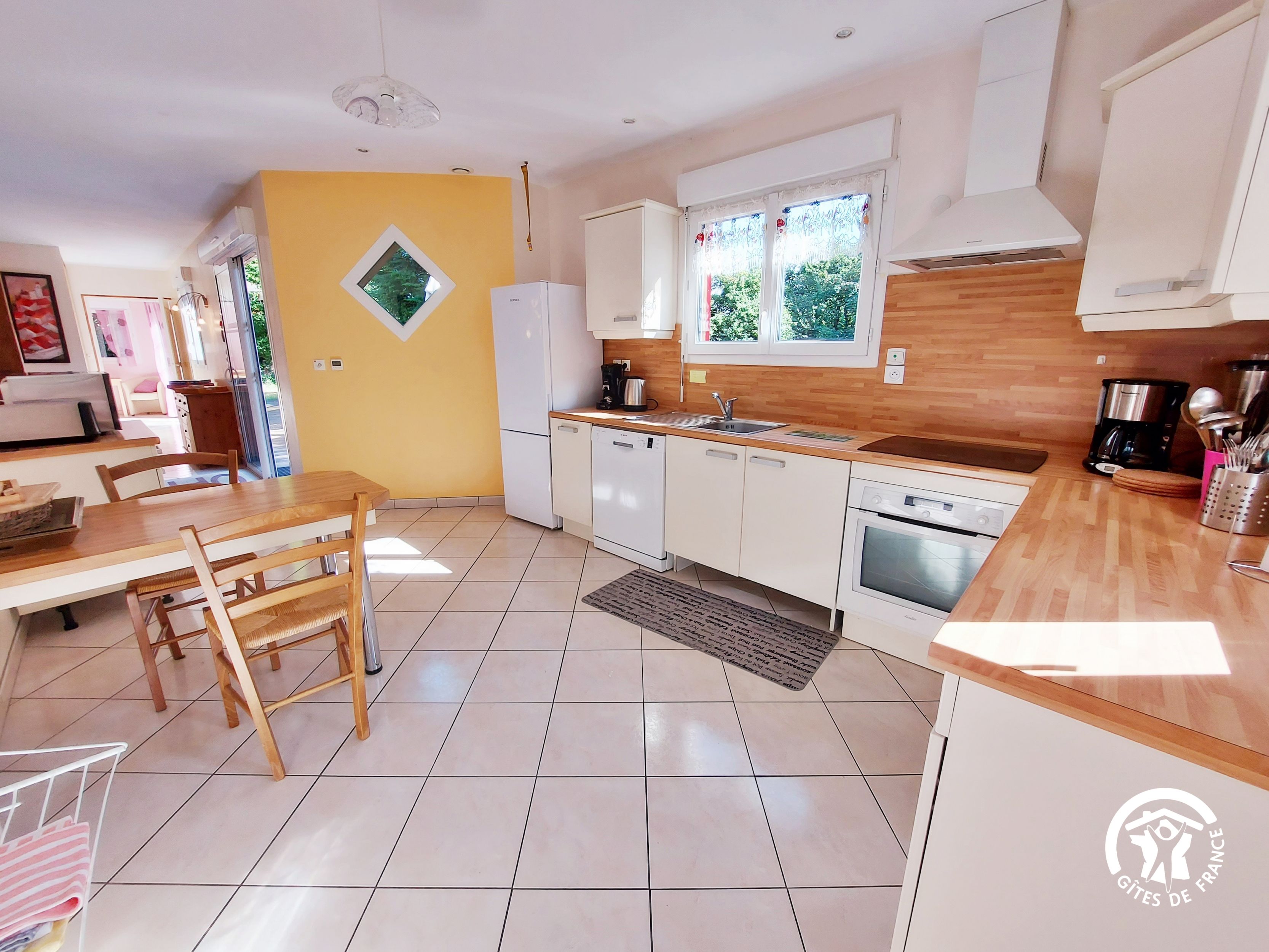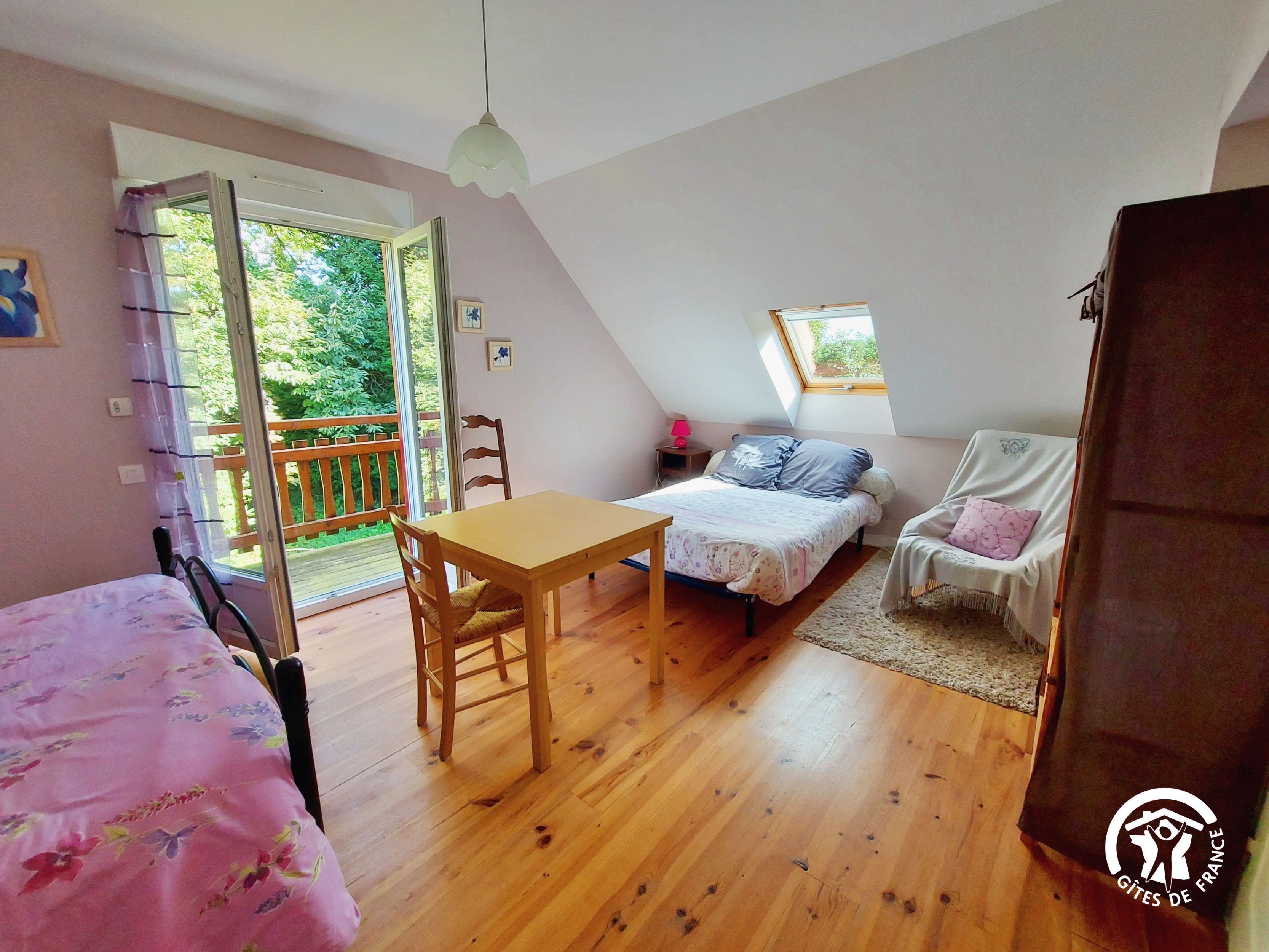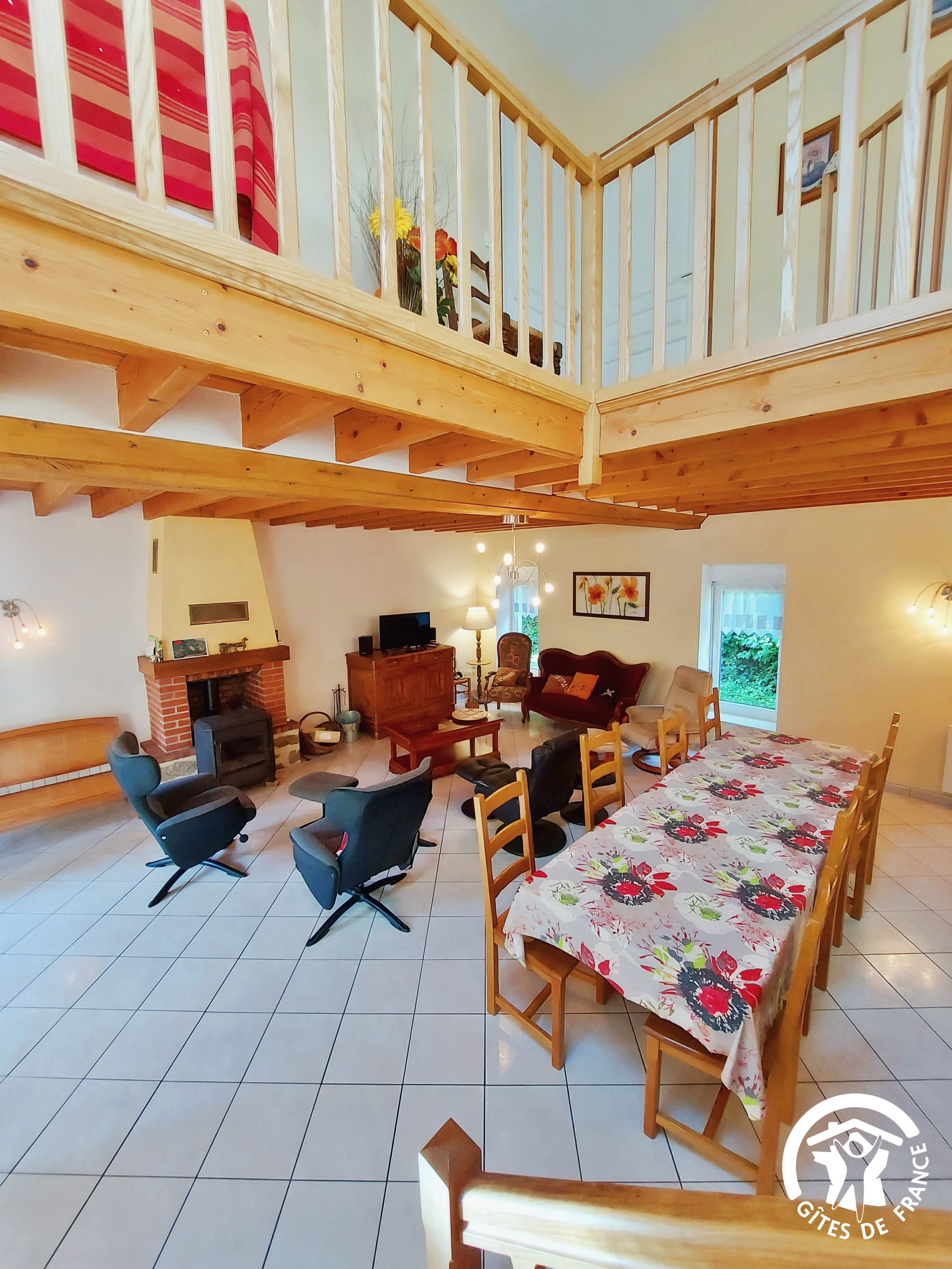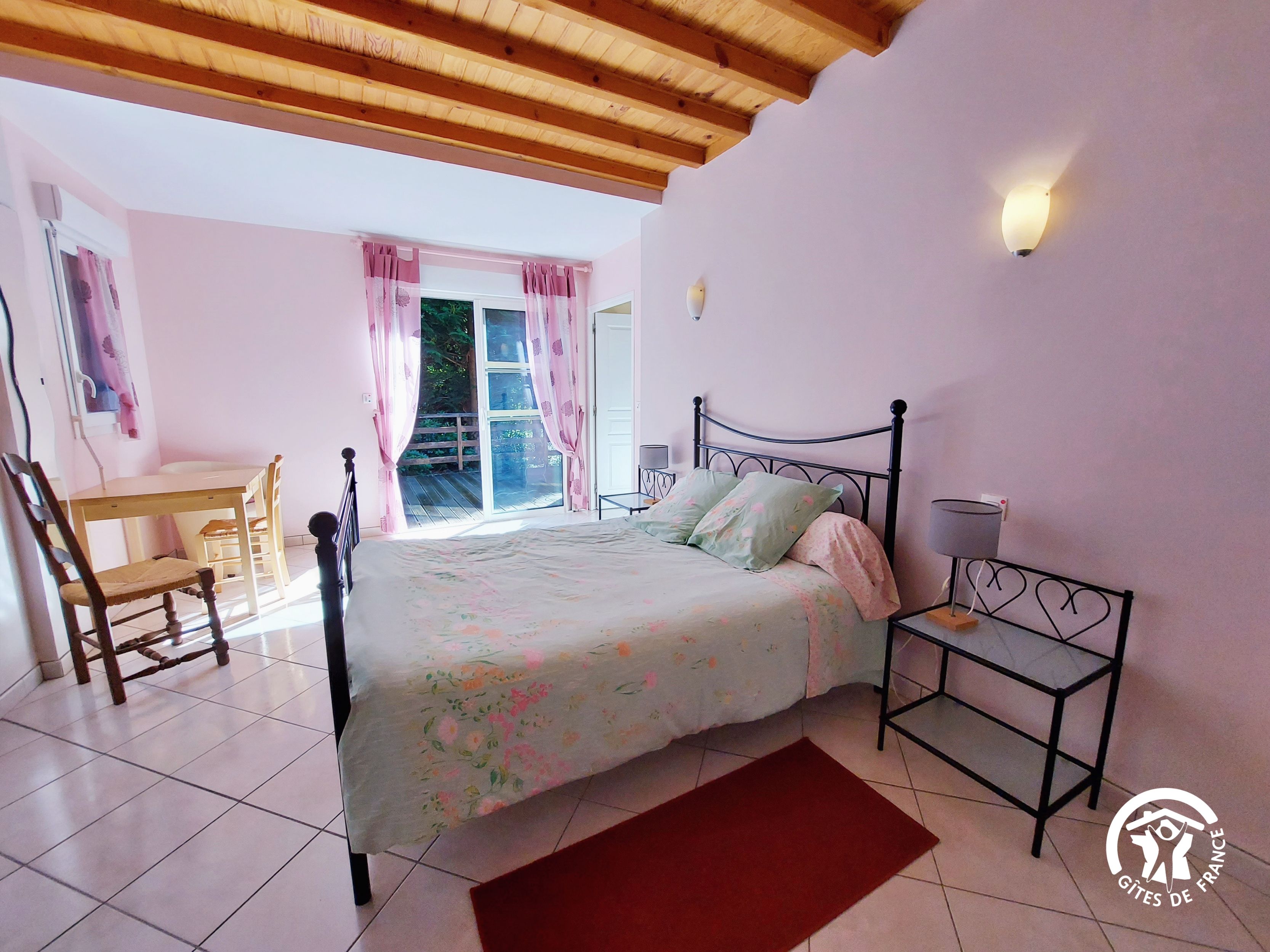 Conçu pour 8 personnes, le rez-de-chaussée est dévolu aux pièces de vie, cuisine et séjour, ainsi qu’une chambre avec sa salle d’eau et wc privatifs. Ce niveau avait été conçu pour les personnes à mobilité réduite : accès à la terrasse par une rampe, sans marche entre les pièces de vie. A l’étage, deux chambres supplémentaires, une salle de bain et un wc indépendant. Au total 4 lits de 90*190 (dont 1 lit pliant) et 3 lits 140*190. Le poêle à bois offre une chaleur agréable en inter-saison et l’hiver (bois inclus). Longue terrasse en surplomb, avec mobilier de jardin et garage avec table de ping-pong.