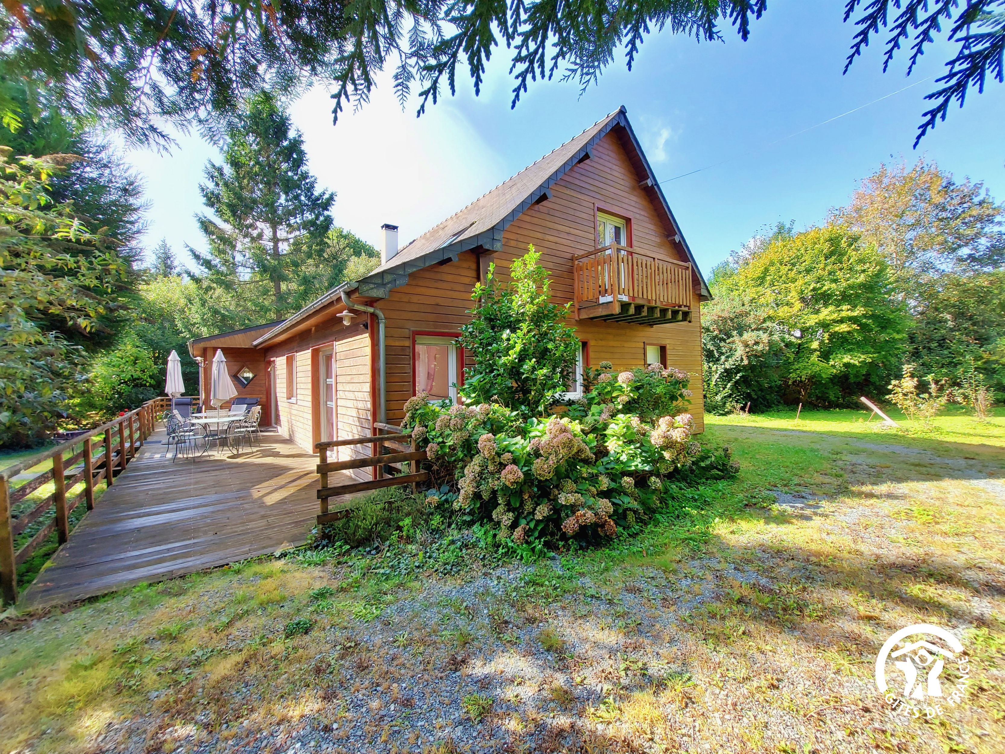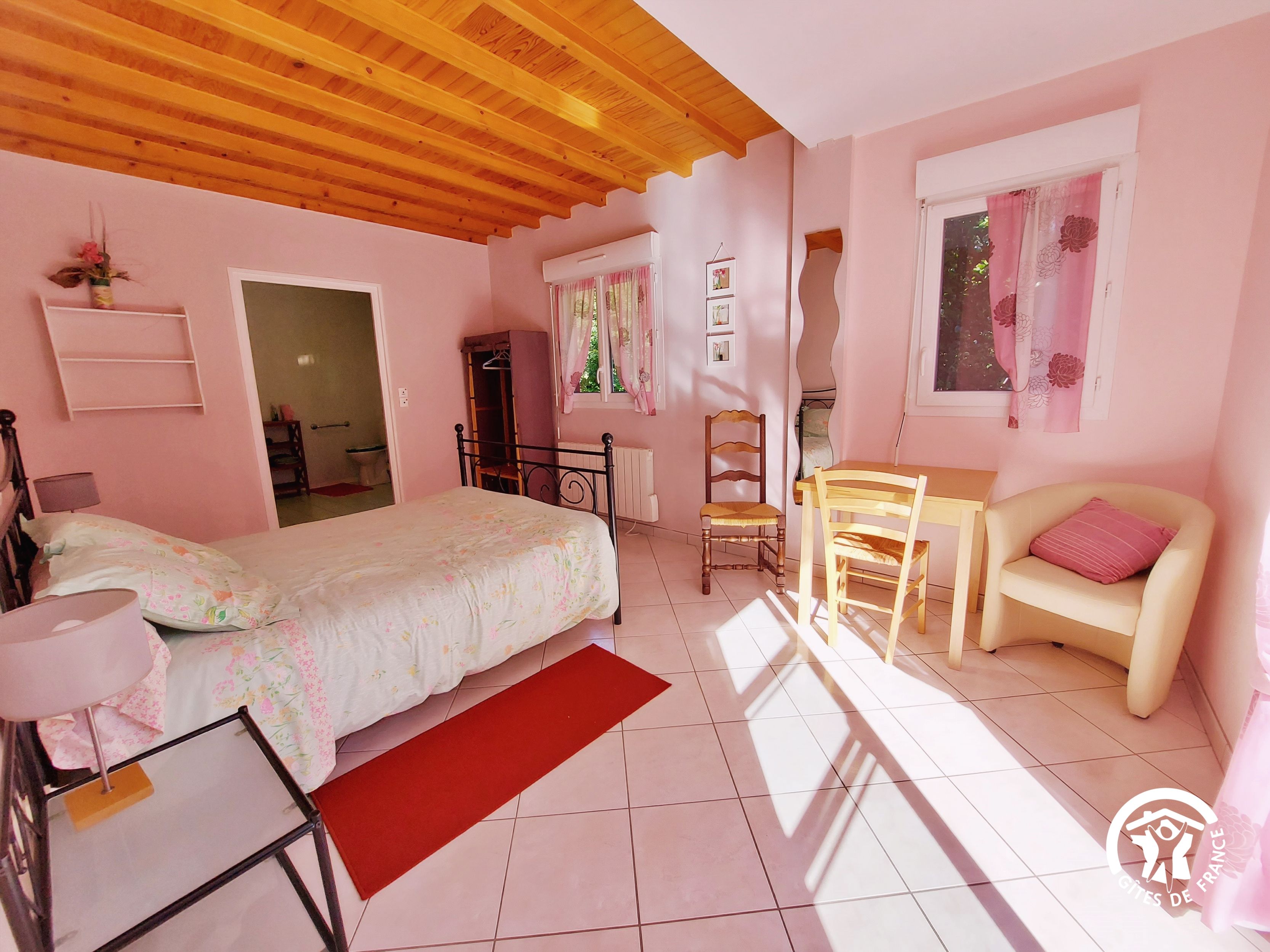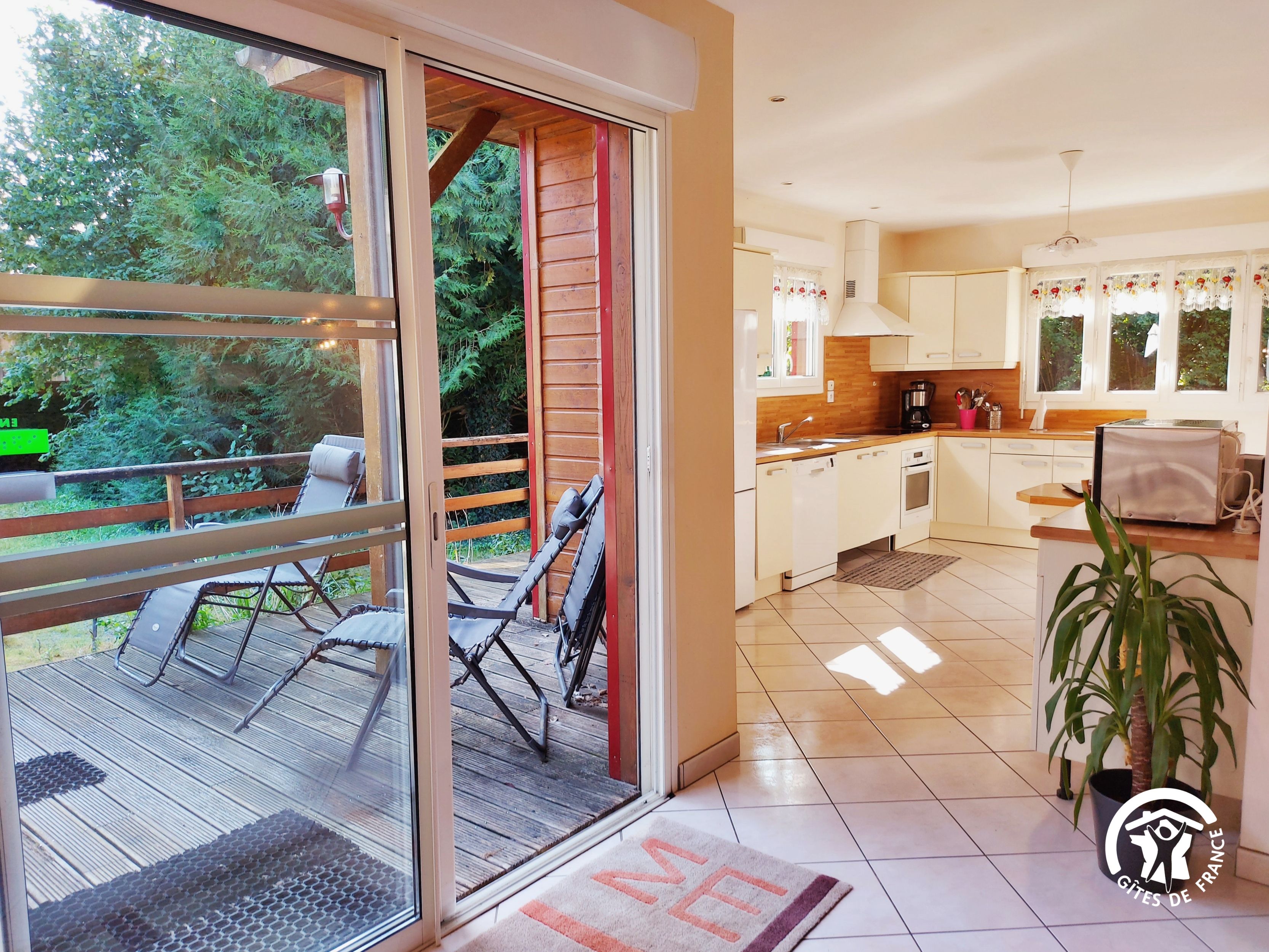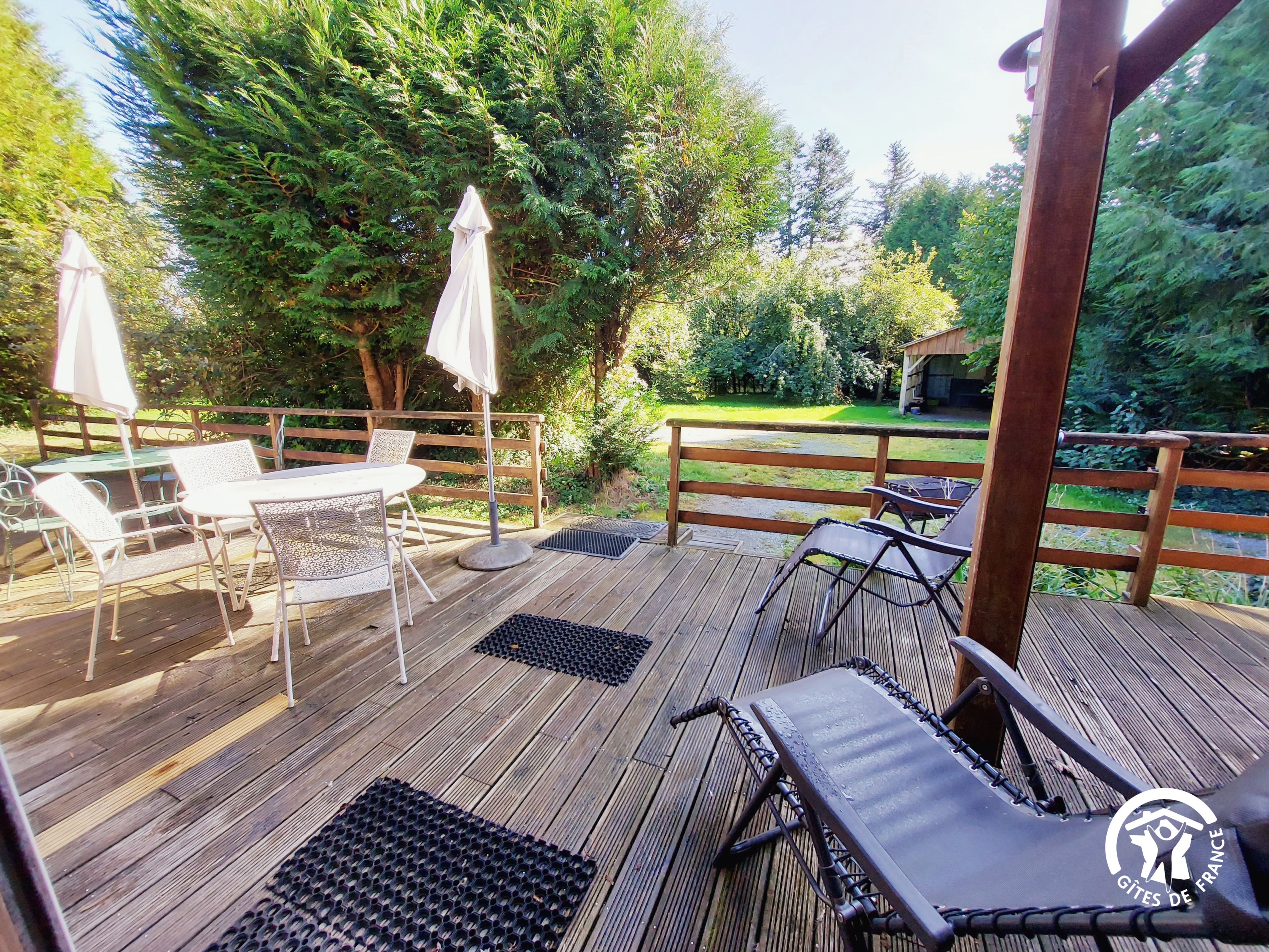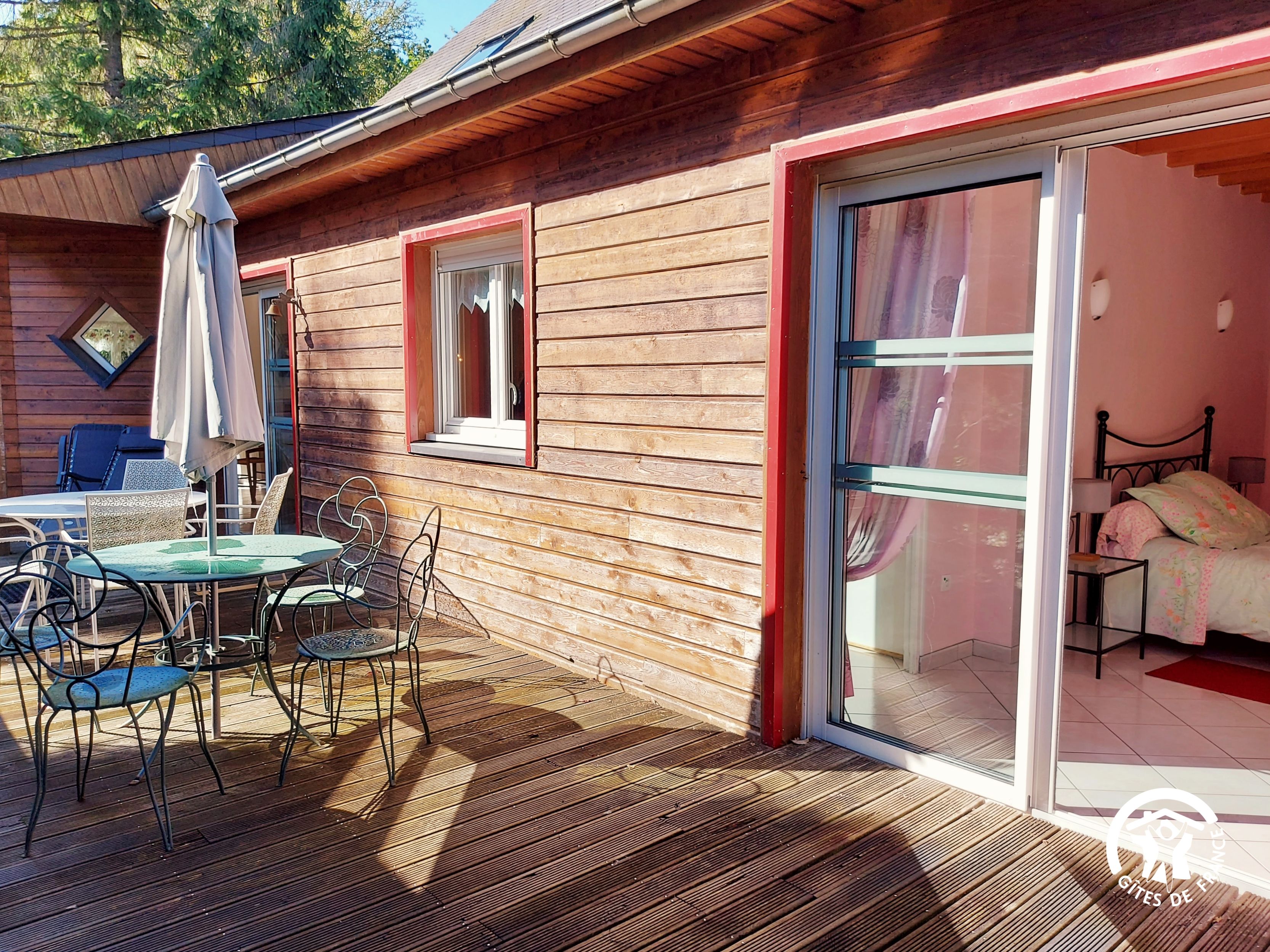 Conçu pour 8 personnes, le rez-de-chaussée est dévolu aux pièces de vie, cuisine et séjour, ainsi qu’une chambre avec sa salle d’eau et wc privatifs. Ce niveau avait été conçu pour les personnes à mobilité réduite : accès à la terrasse par une rampe, sans marche entre les pièces de vie. A l’étage, deux chambres supplémentaires, une salle de bain et un wc indépendant. Au total 4 lits de 90*190 (dont 1 lit pliant) et 3 lits 140*190. Le poêle à bois offre une chaleur agréable en inter-saison et l’hiver (bois inclus). Longue terrasse en surplomb, avec mobilier de jardin et garage avec table de ping-pong.