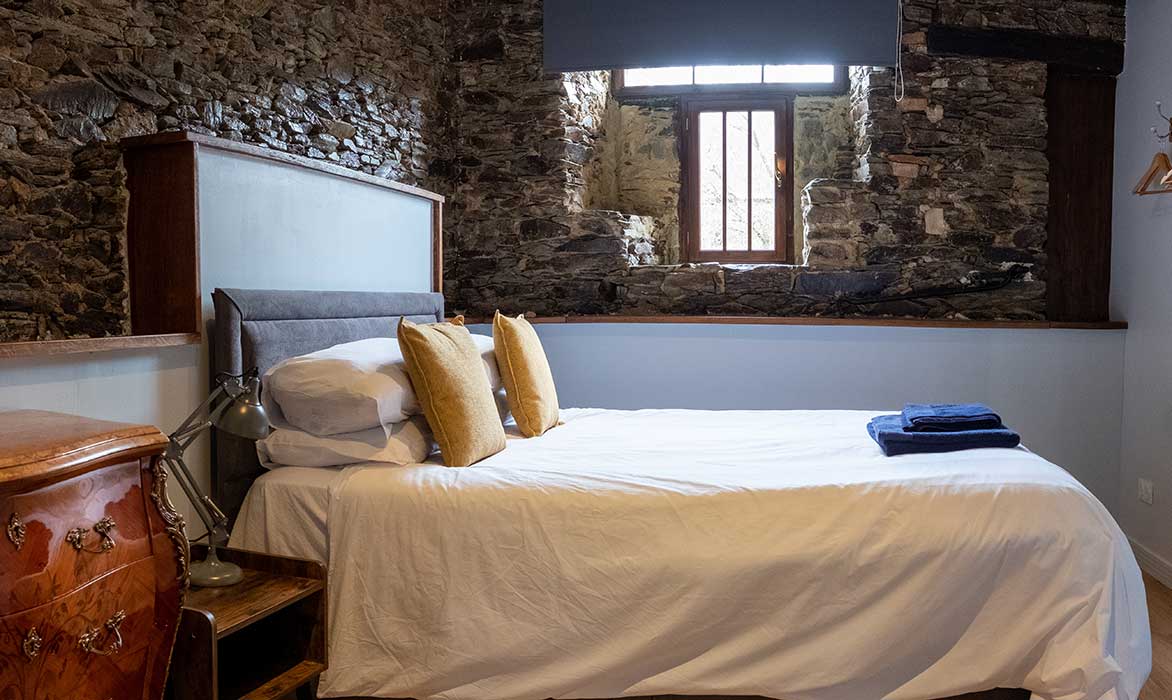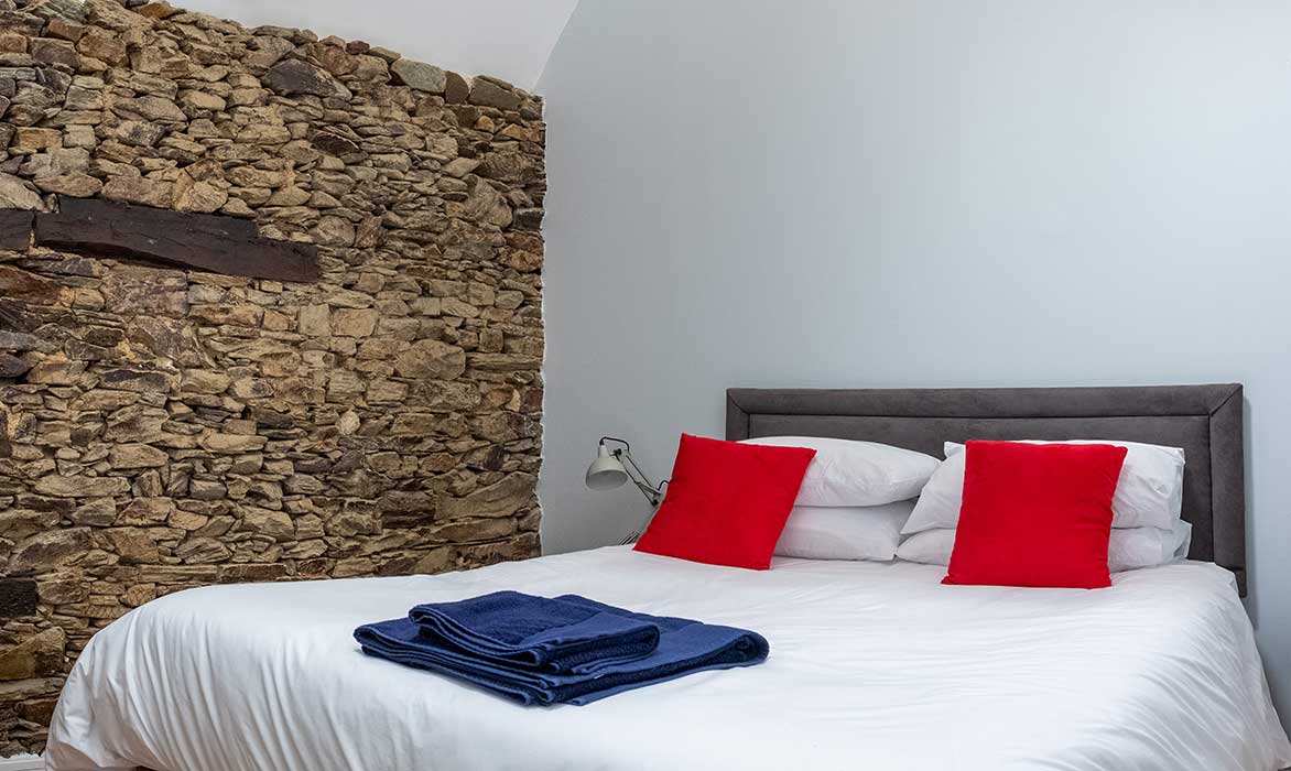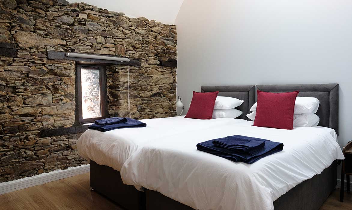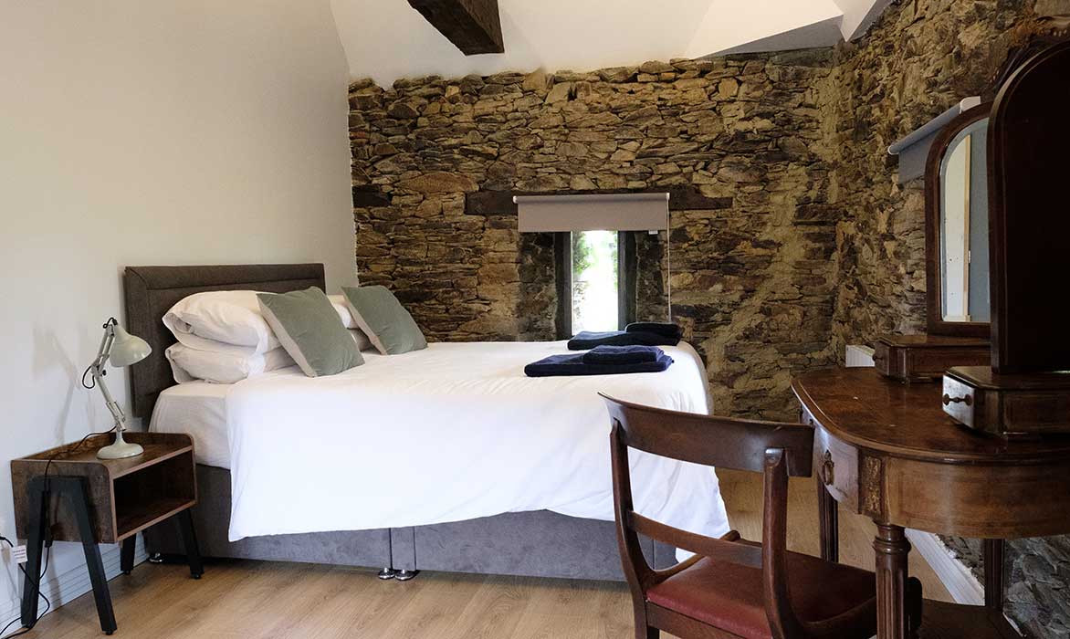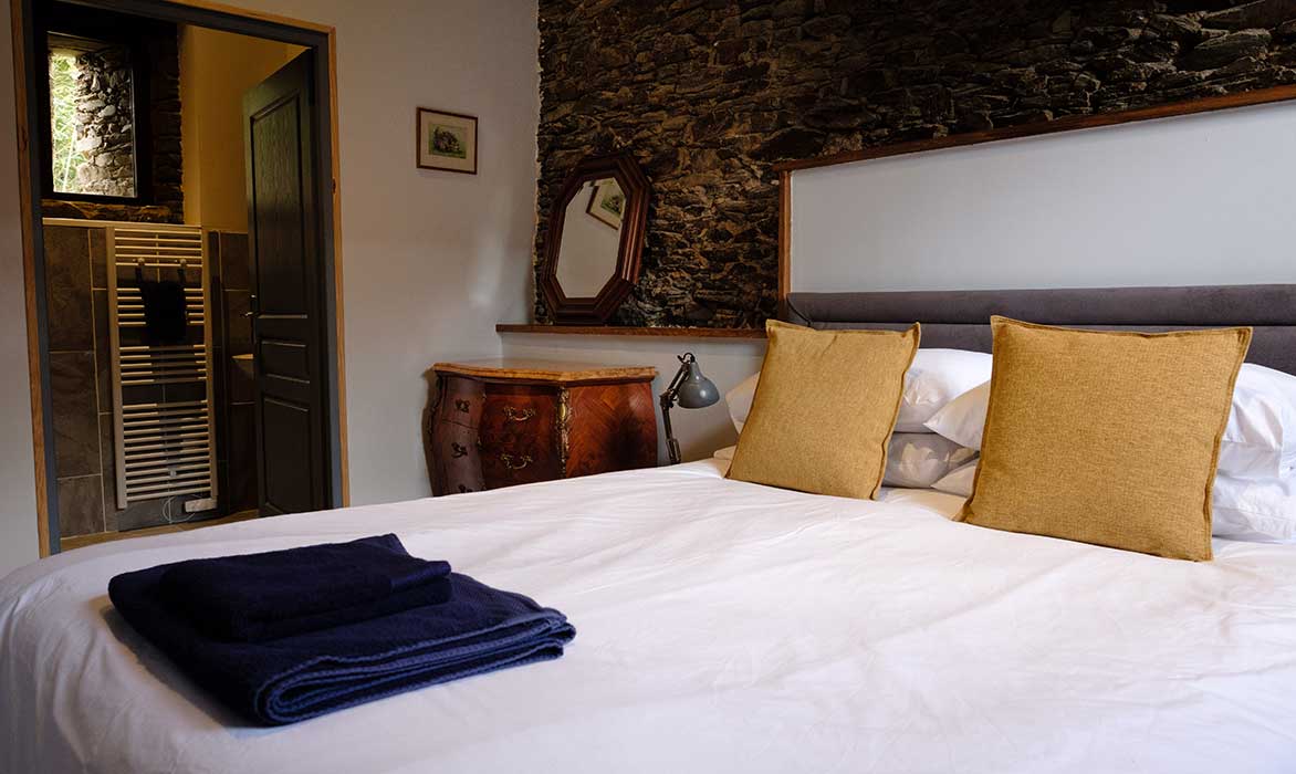 Menant du salon se trouve également la chambre 1 qui a été adaptée pour une utilisation PMR. La porte a une largeur de 90 cm. La chambre a un lit king-size (160cm), des tables de chevet et des lampes, une commode et des crochets. La salle de douche attenante est une salle d’eau avec un lavabo, un sèche-serviettes et des toilettes. Cette chambre ne peut pas accueillir de lit d’appoint. Les escaliers du salon mènent à 4 autres chambres, deux chambres king-size avec salle de bains, une autre chambre king-size et une chambre à deux lits.