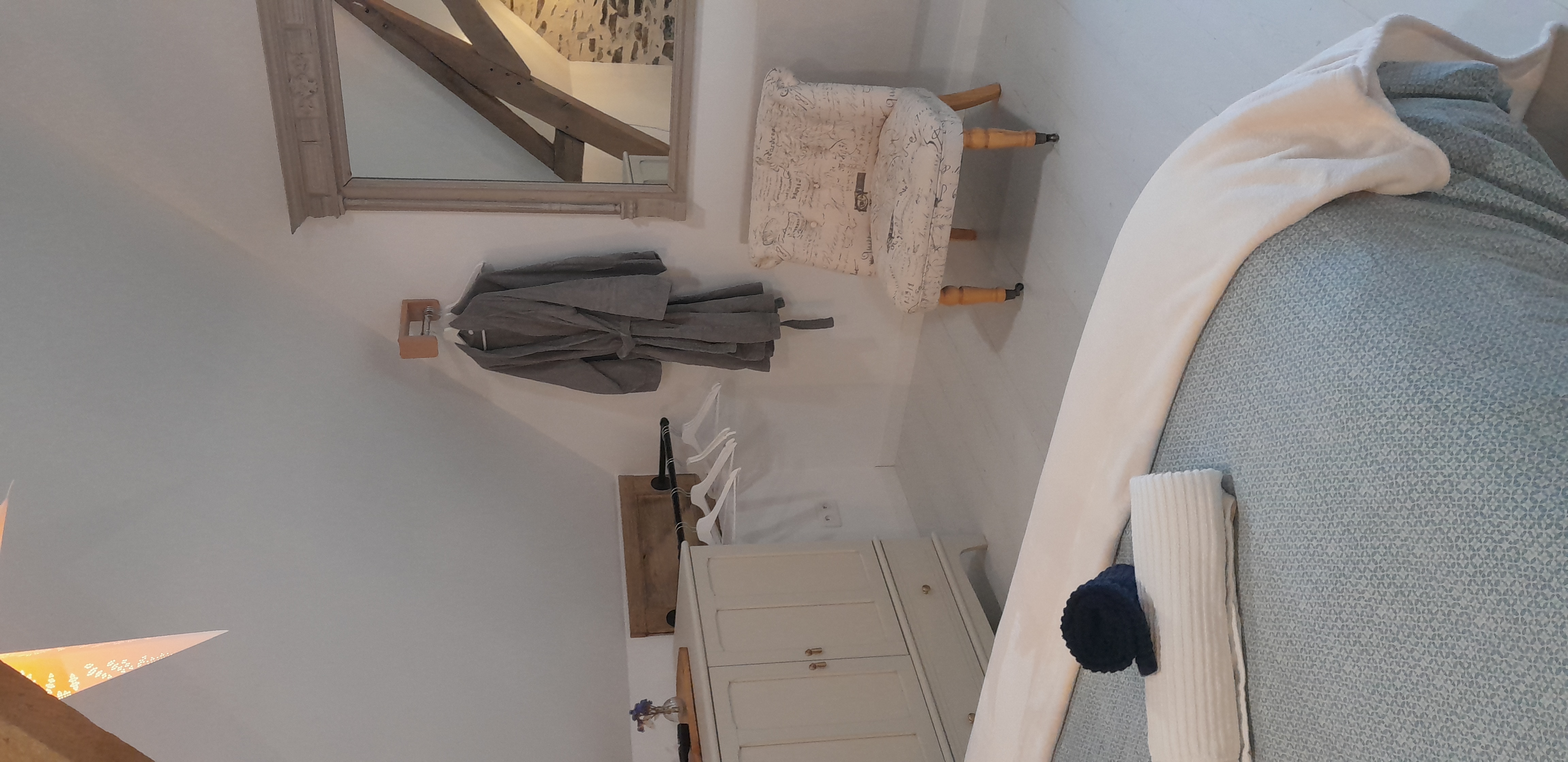 Chambre ouverte sur l’escalier avec un lit Queen Size (160*200 cm) et une TV connectée.
