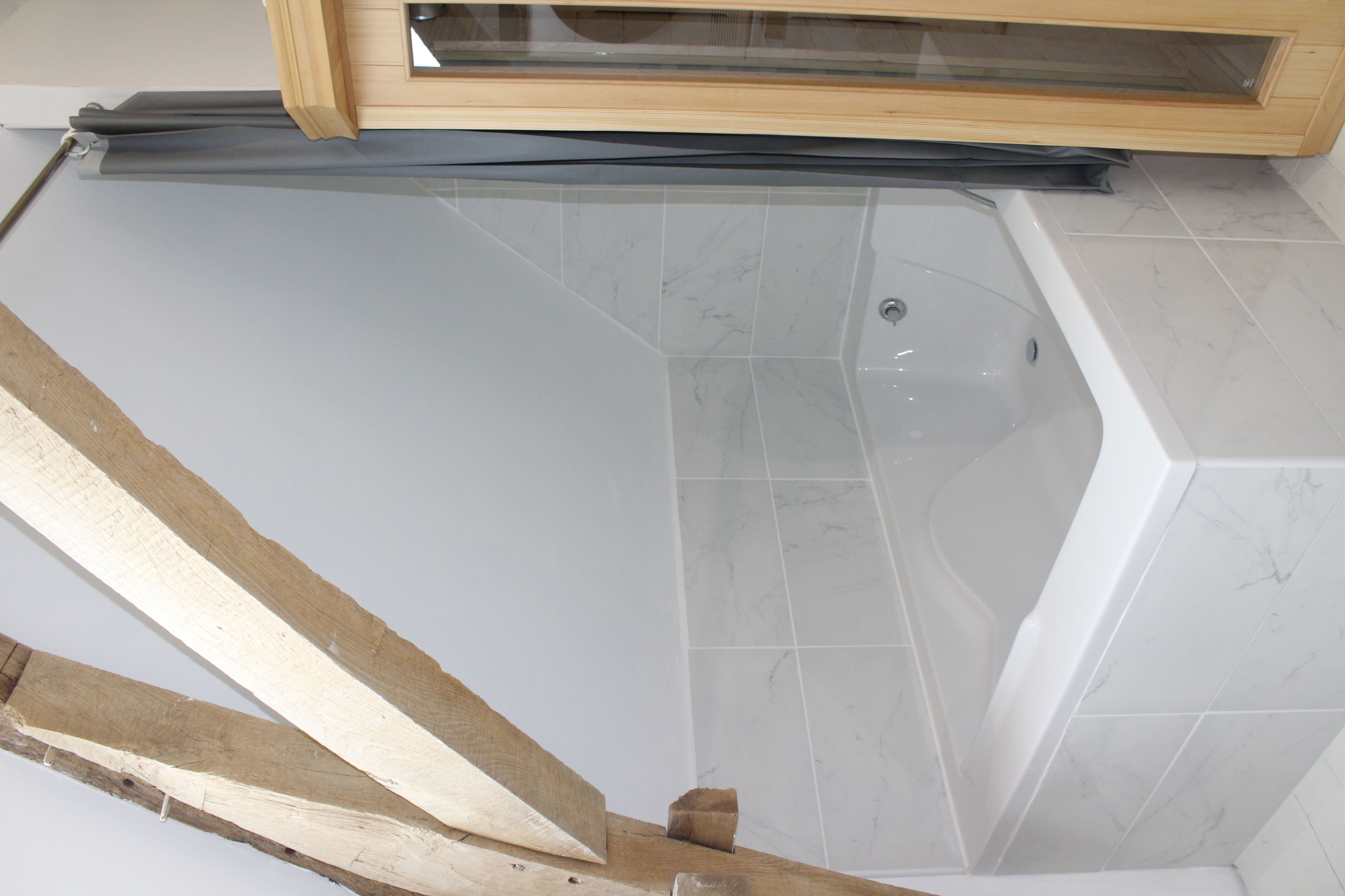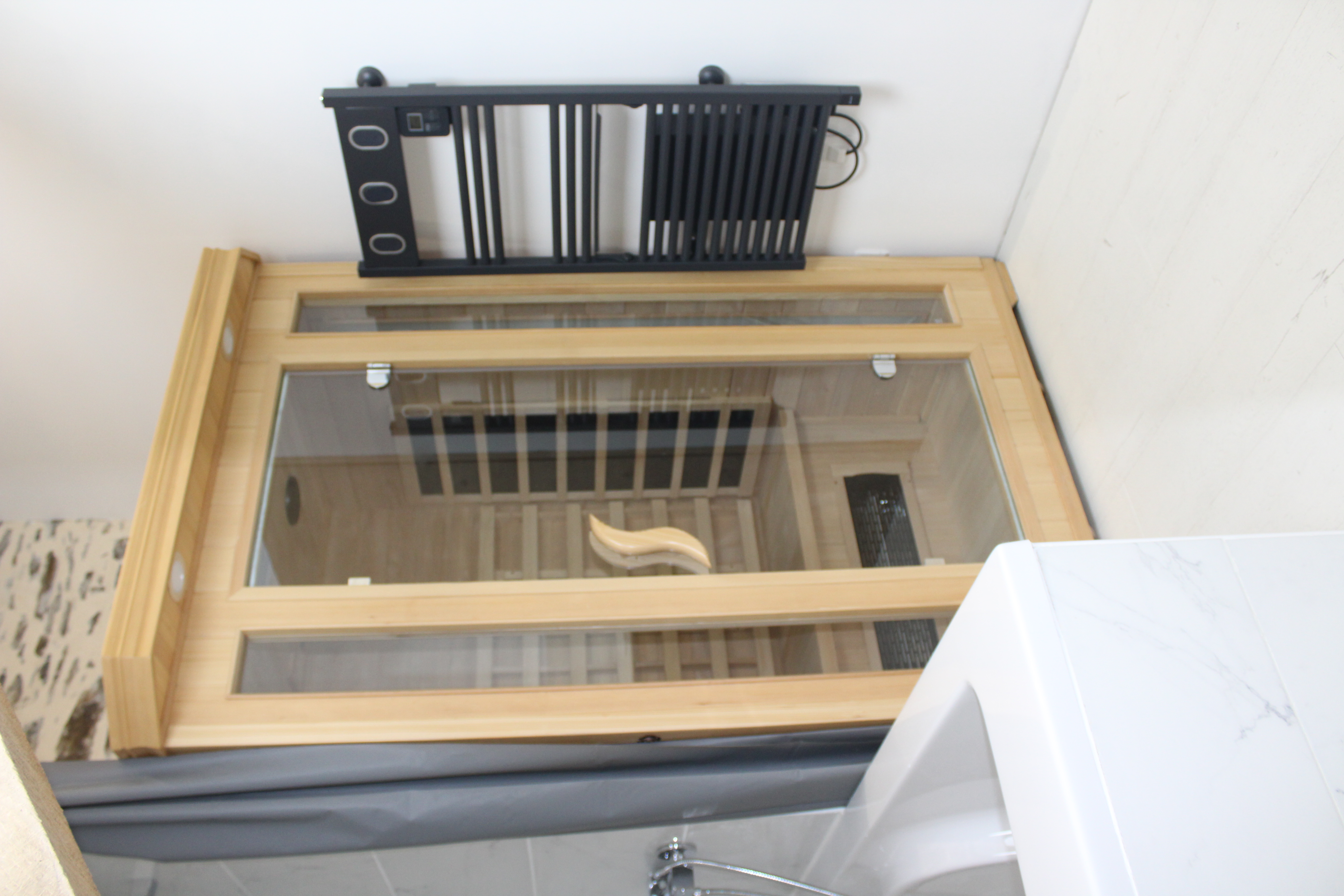 Salle de bain avec Sauna (2 places assises) et Baignoire 2 places sous pente.