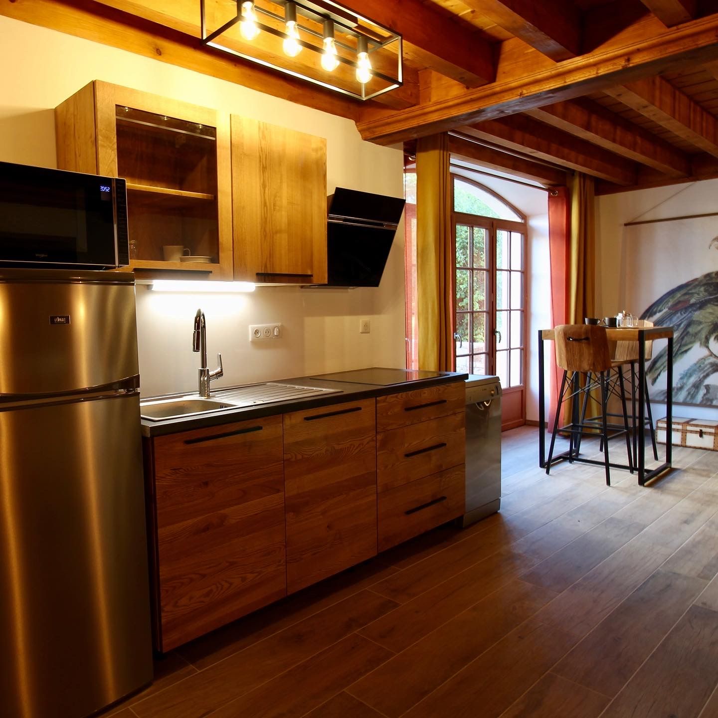 Un gîte face à la roue du moulin pouvant accueillir jusqu’à 2 pers. Gîte de plein pied avec pièce de vie espace cuisine toute équipée, espace salle à manger et salon. Coin nuit avec 1 lit 160. Salle de bain avec douche à l’italienne et wc. Lit fait à l’arrivée.