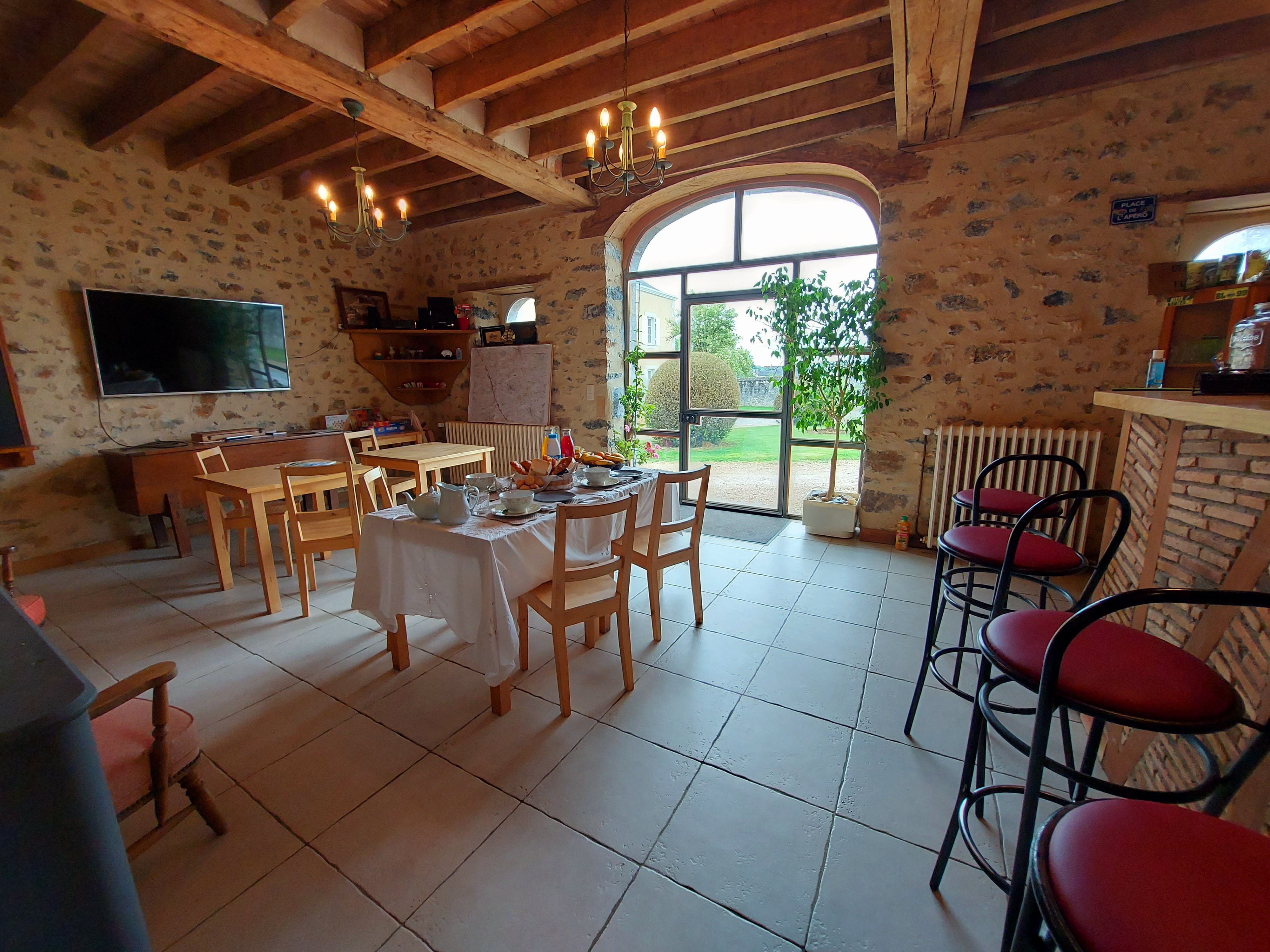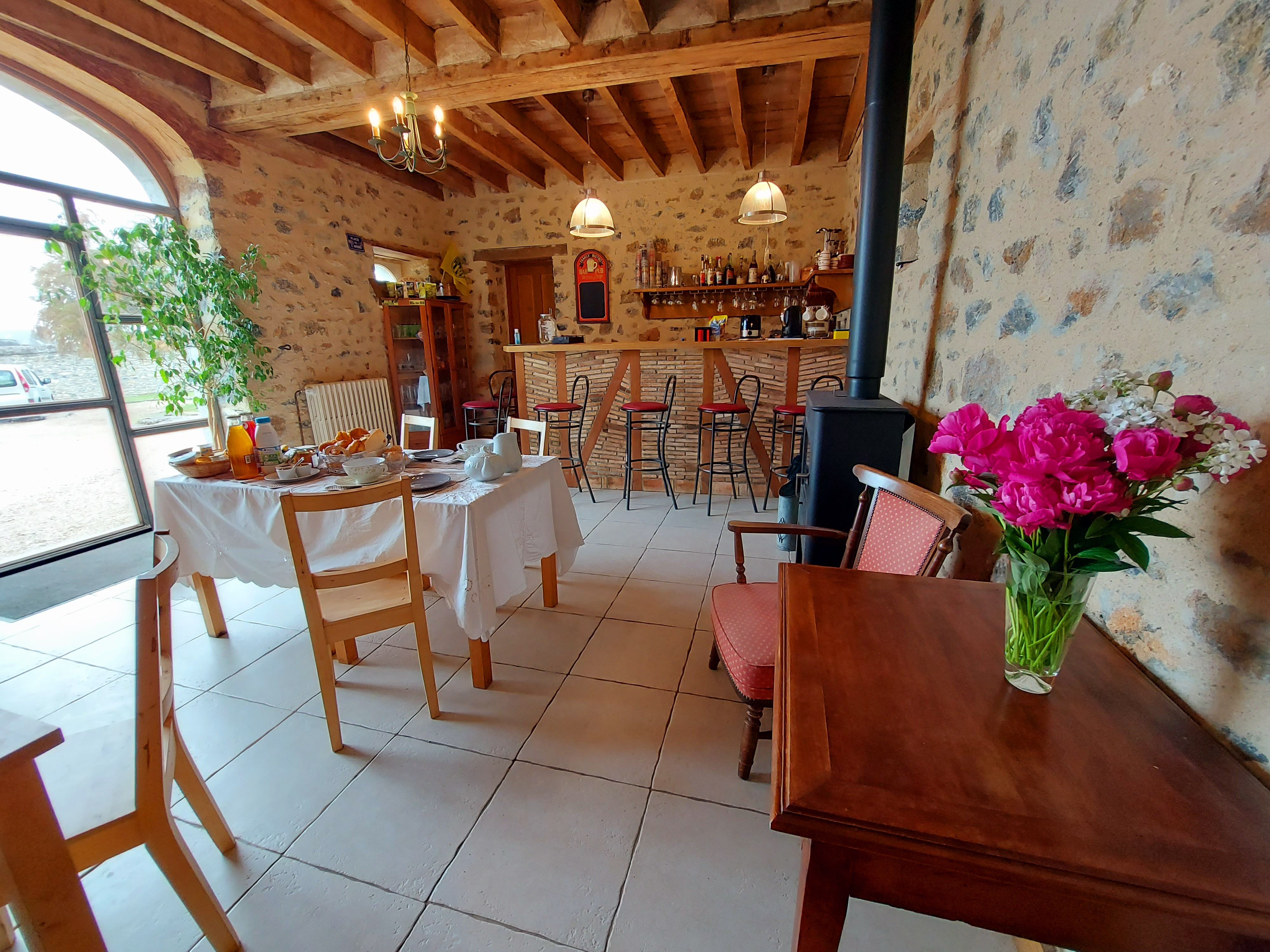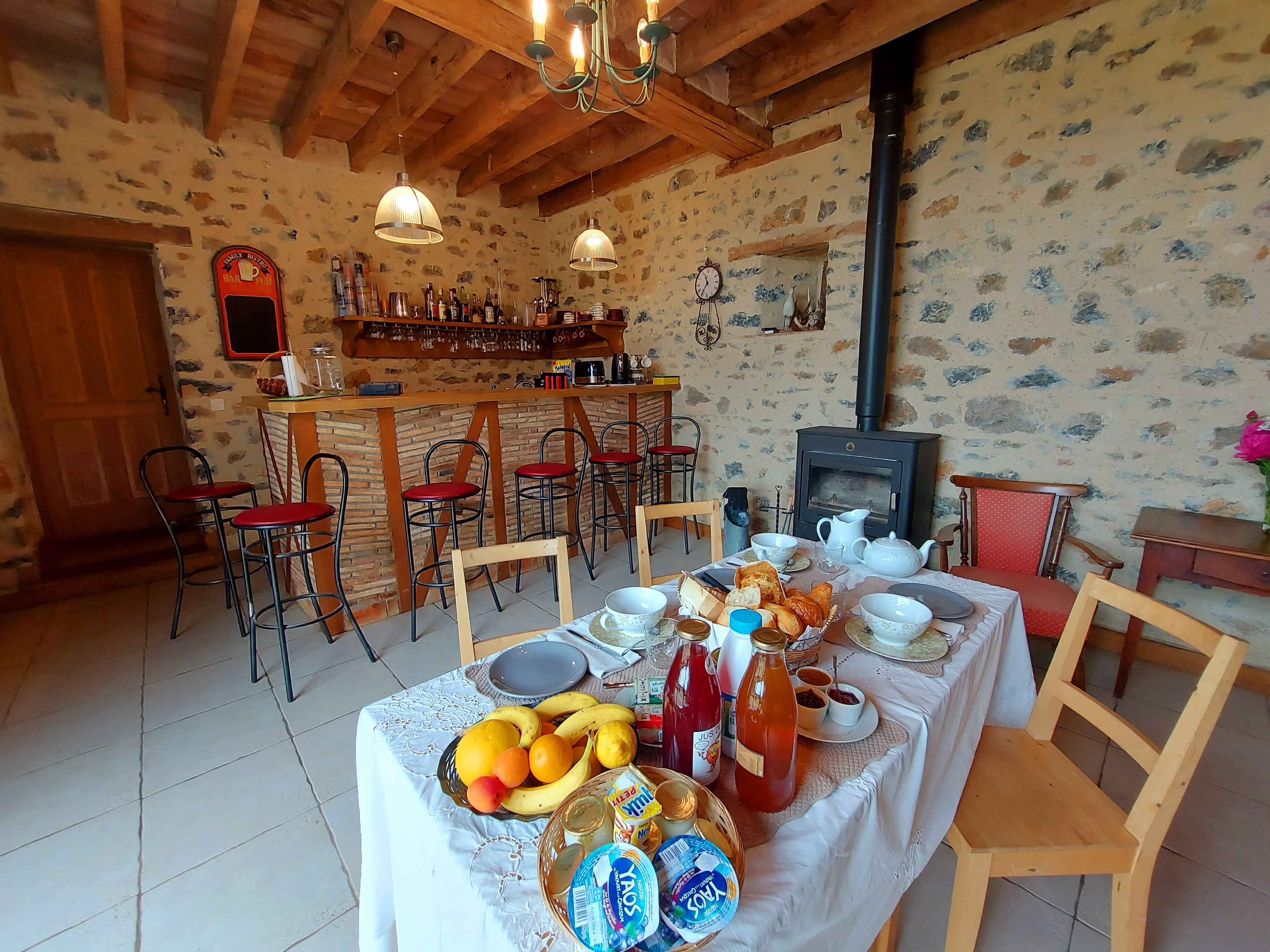 Pour vos repas, vous pourrez profiter d’une salle équipée d’un bar, d’un espace restauration avec un coin cuisine (mini-four, plaque de gaz, micro ondes, réfrigérateur…), d’un grand écran TV, Wifi, jeux et poêle à bois. Des plateaux repas du restaurant le Petit comptoir du village peuvent être commandés et livrés.