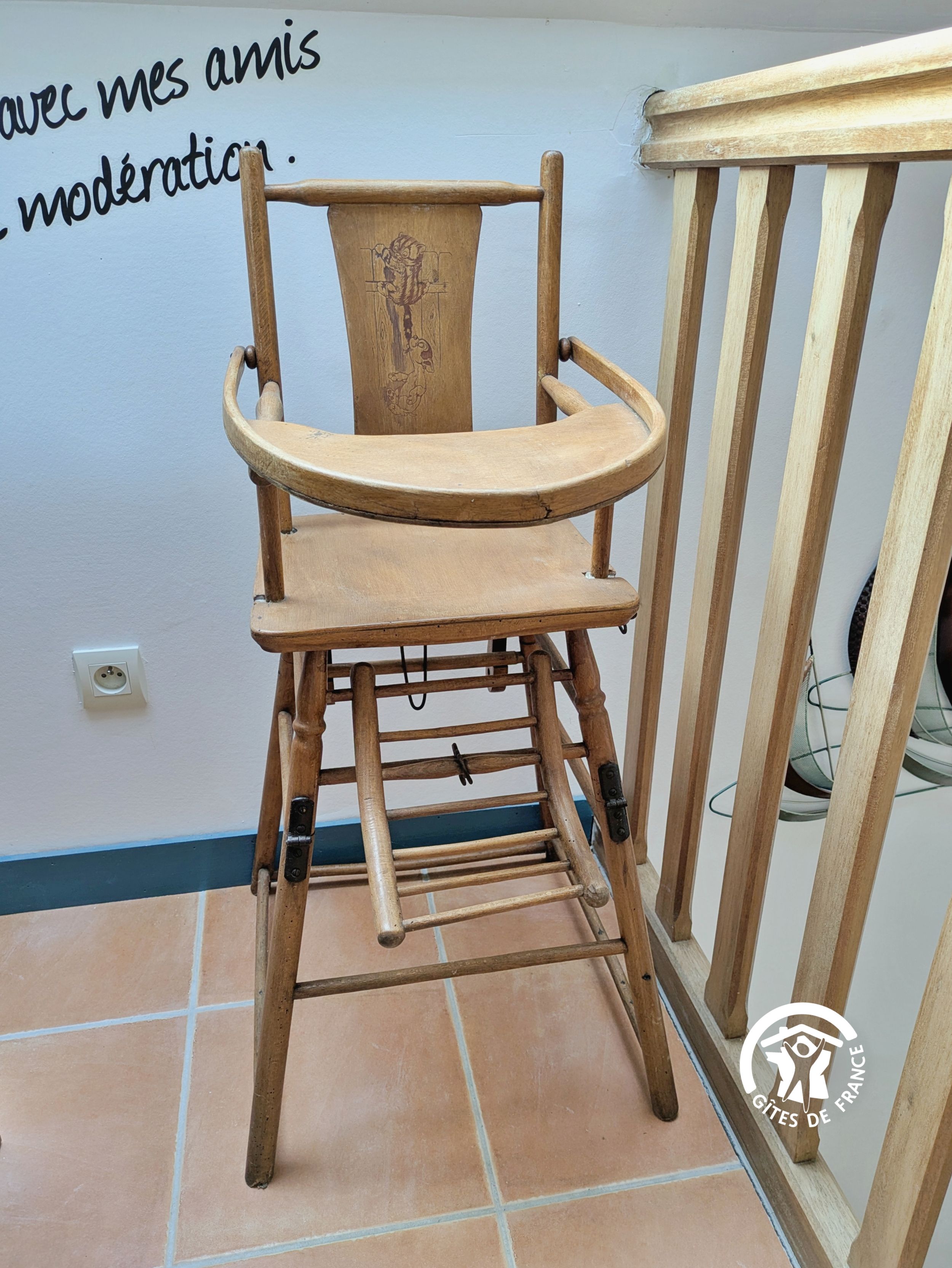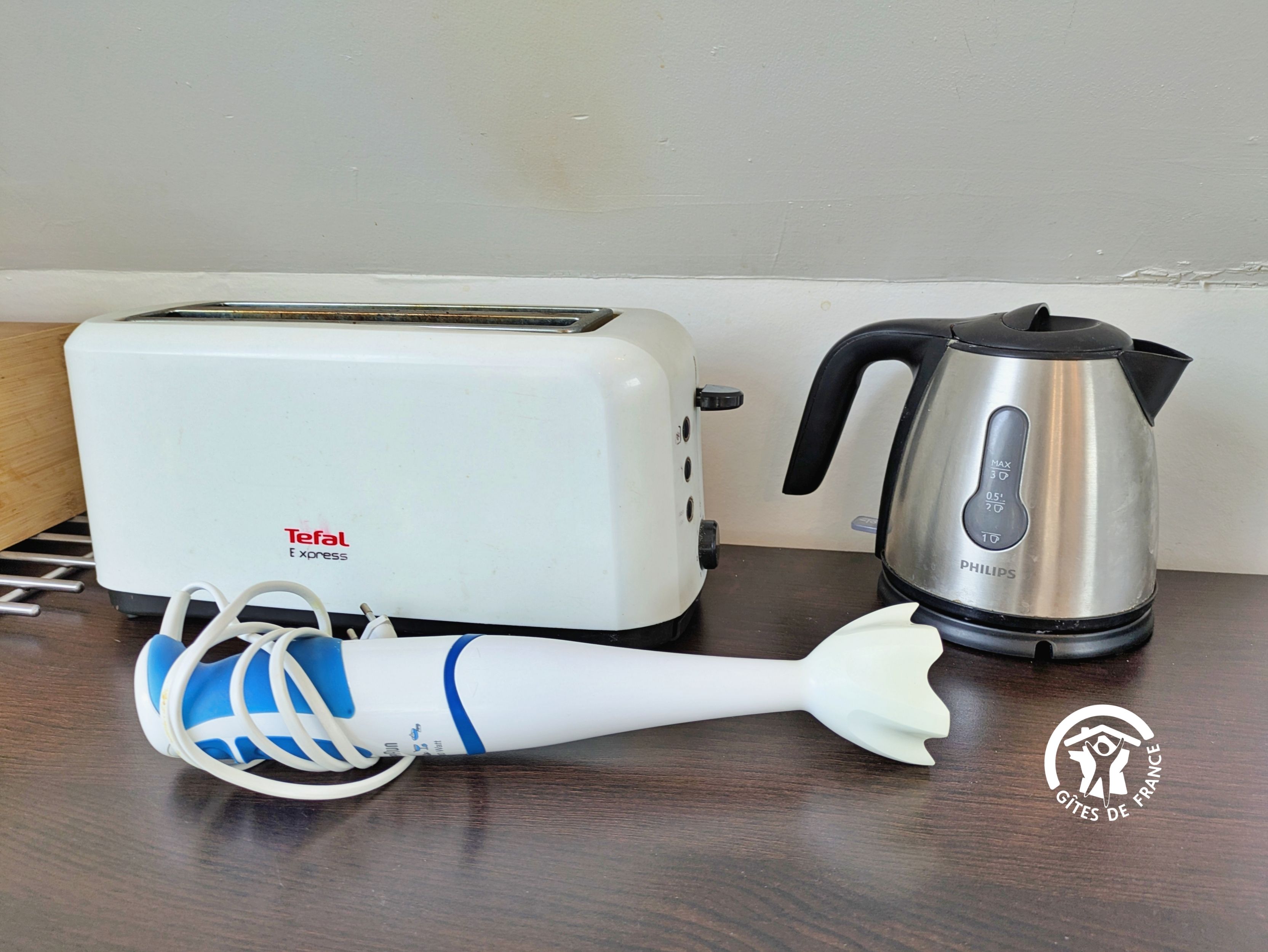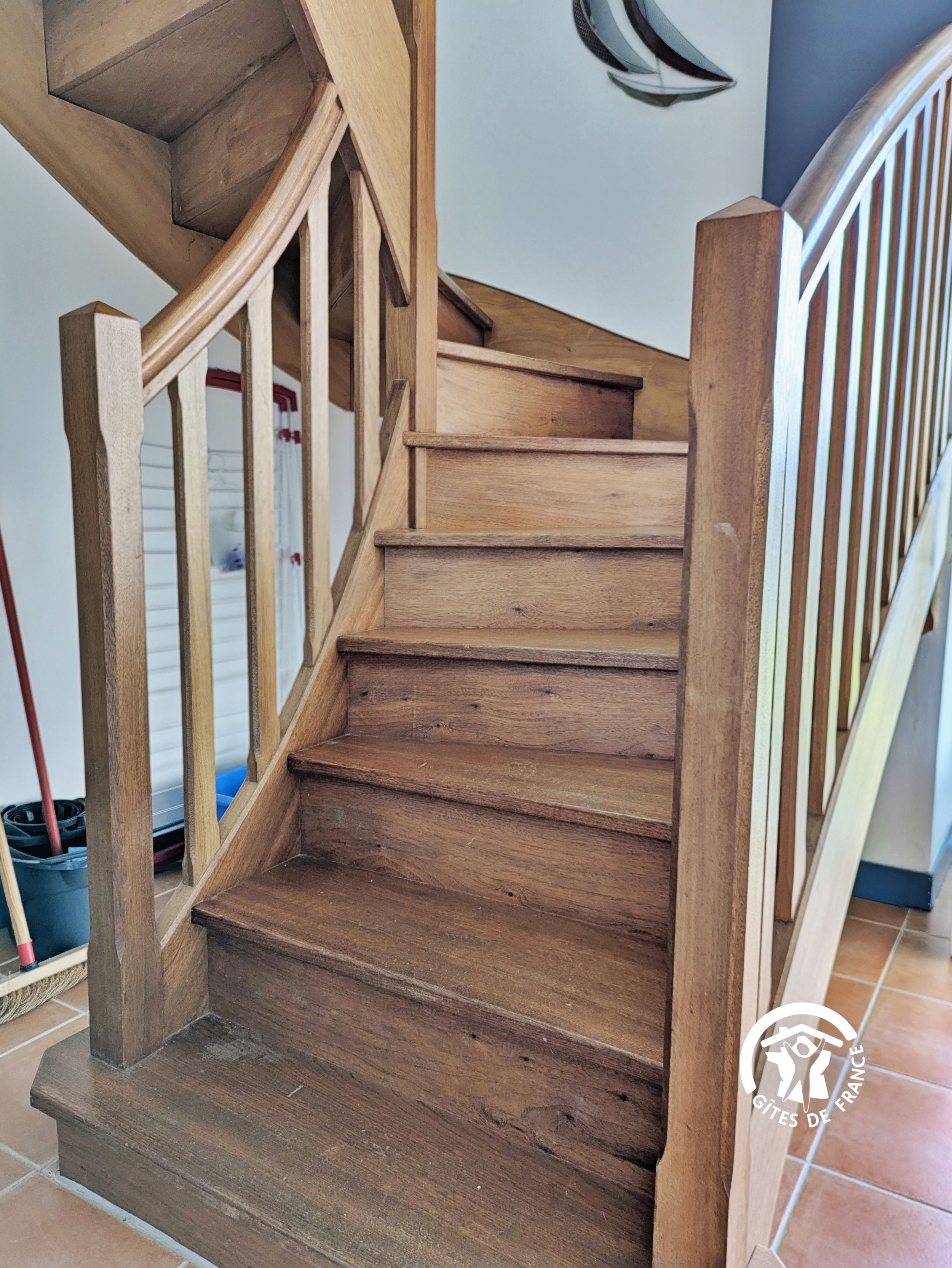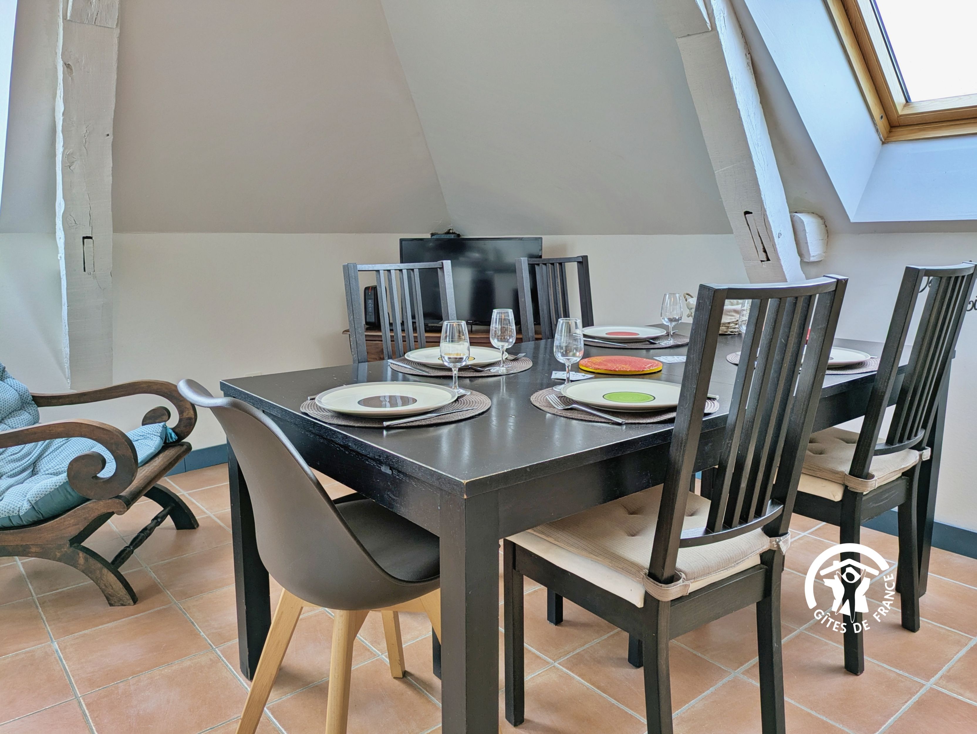 Gîte à l’étage, découvrez une pièce de vie combinant cuisine équipée et coin repas.