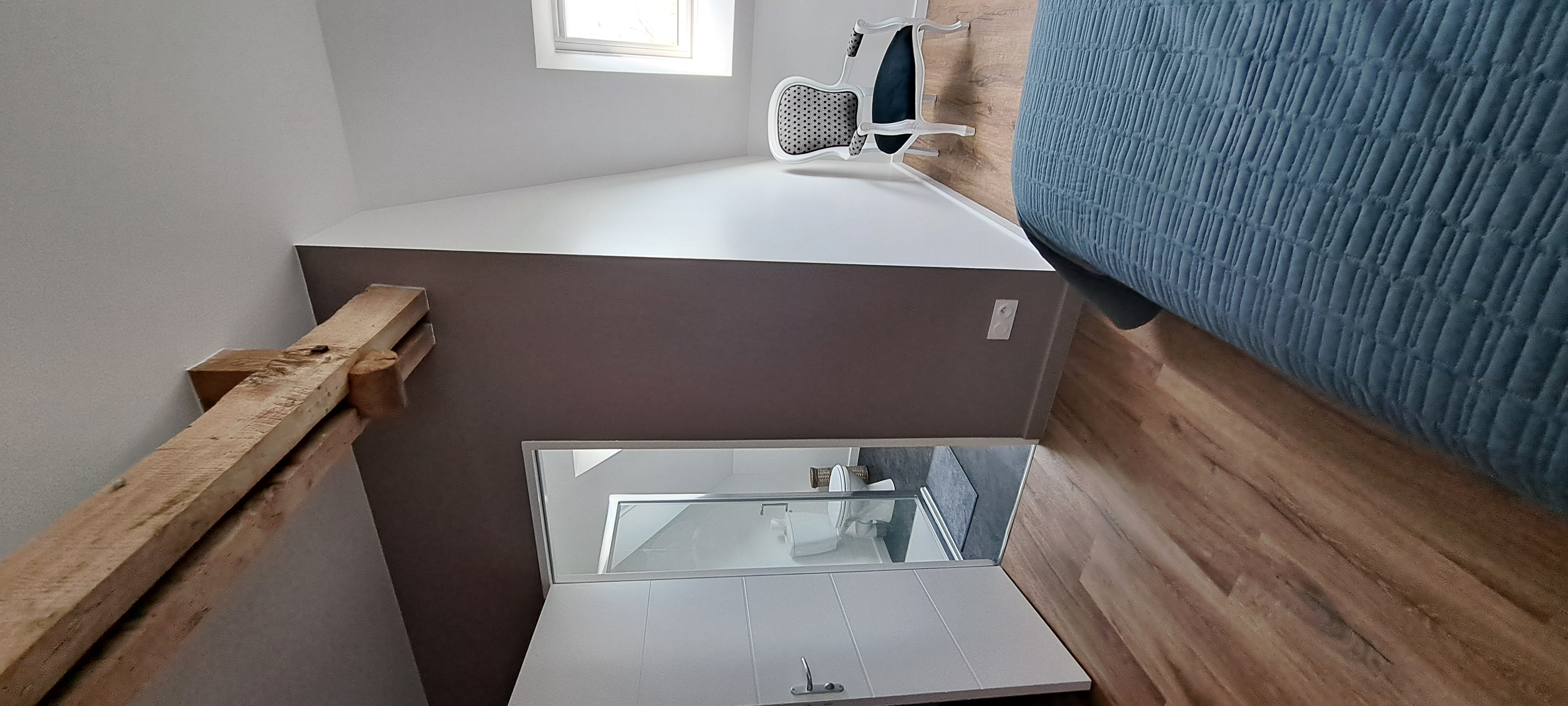 – Un escalier de type échelle de meunier mène à une chambre composée d’un lit de 160 cm, d’une baignoire et de WC