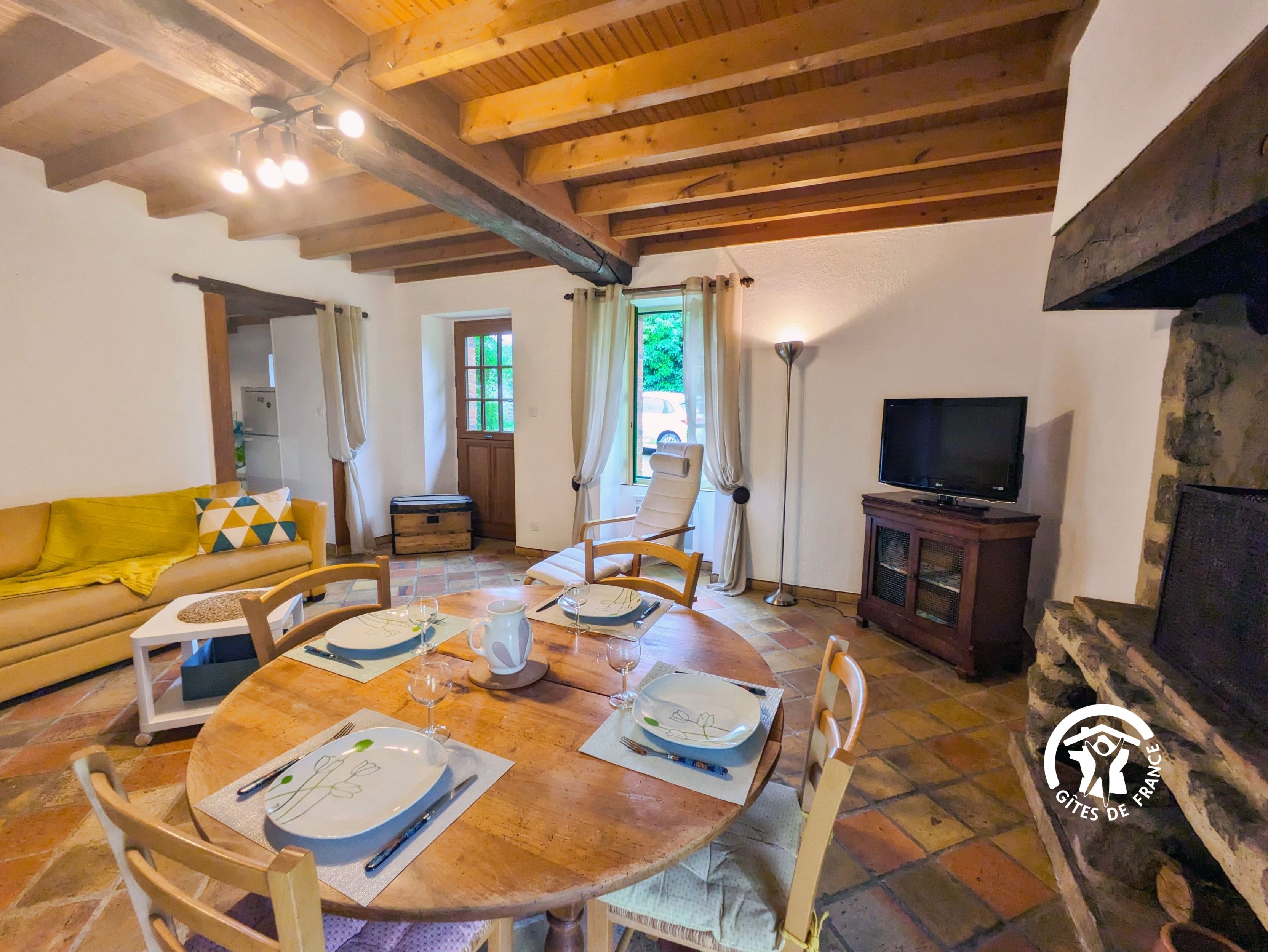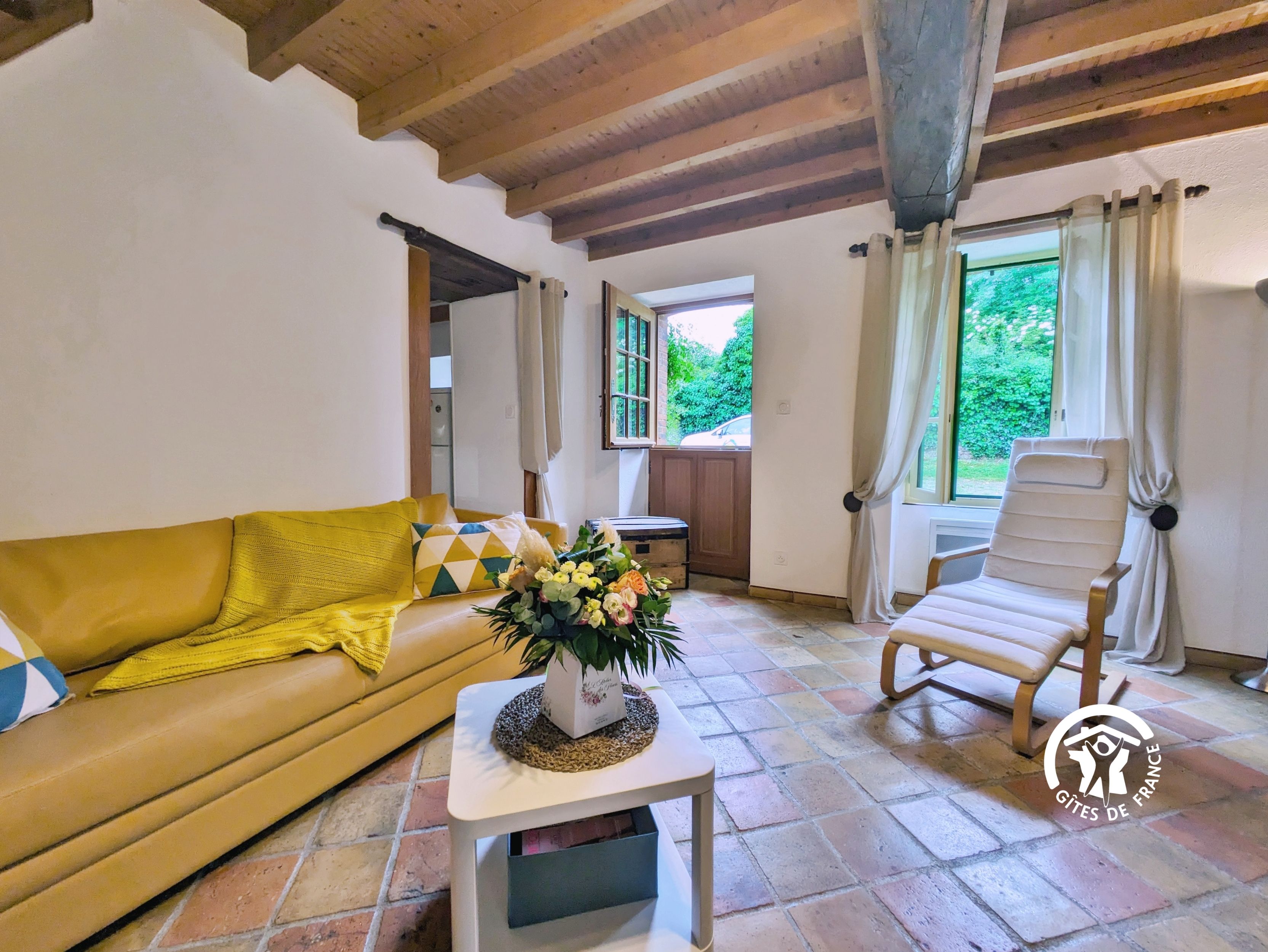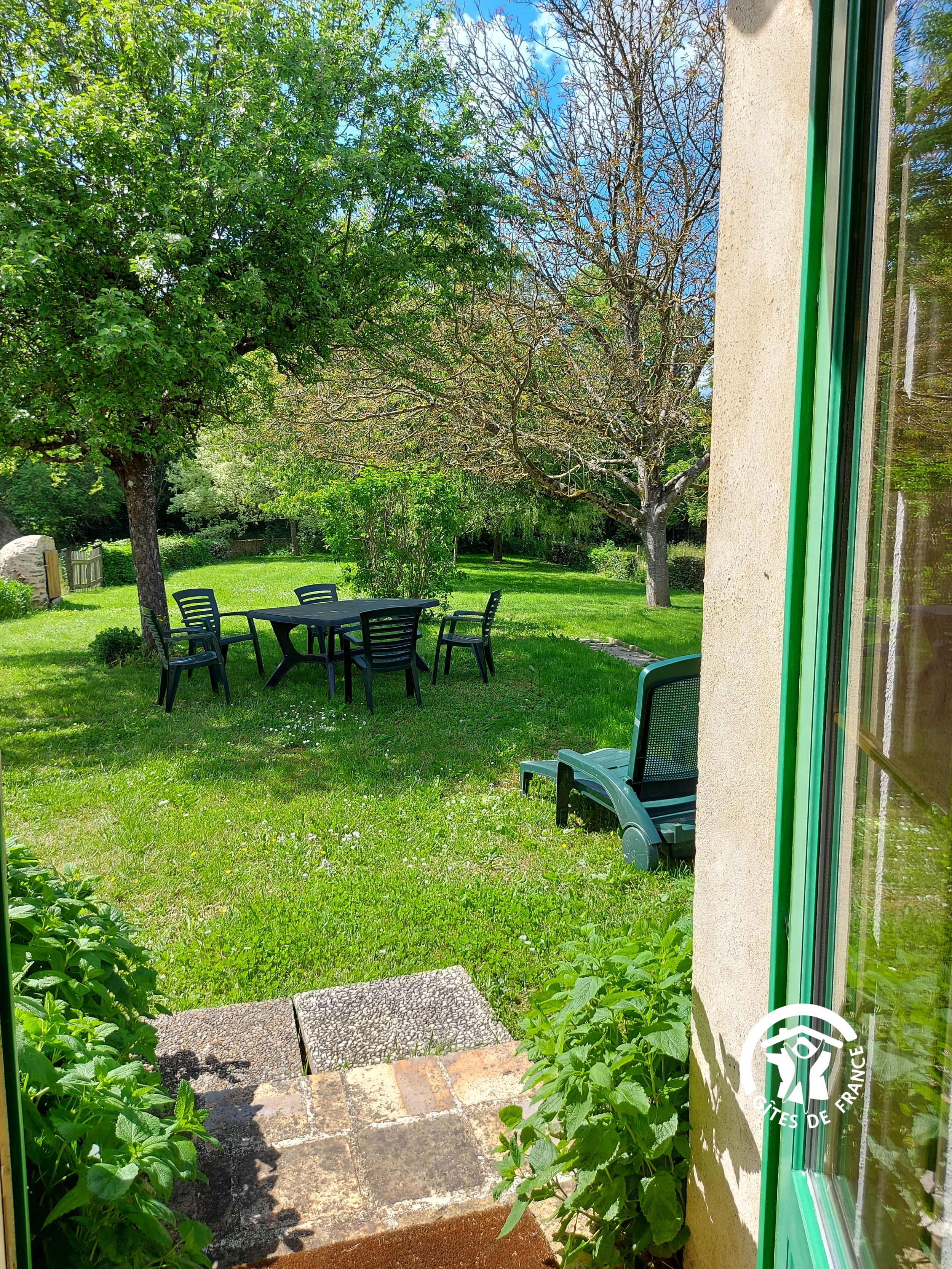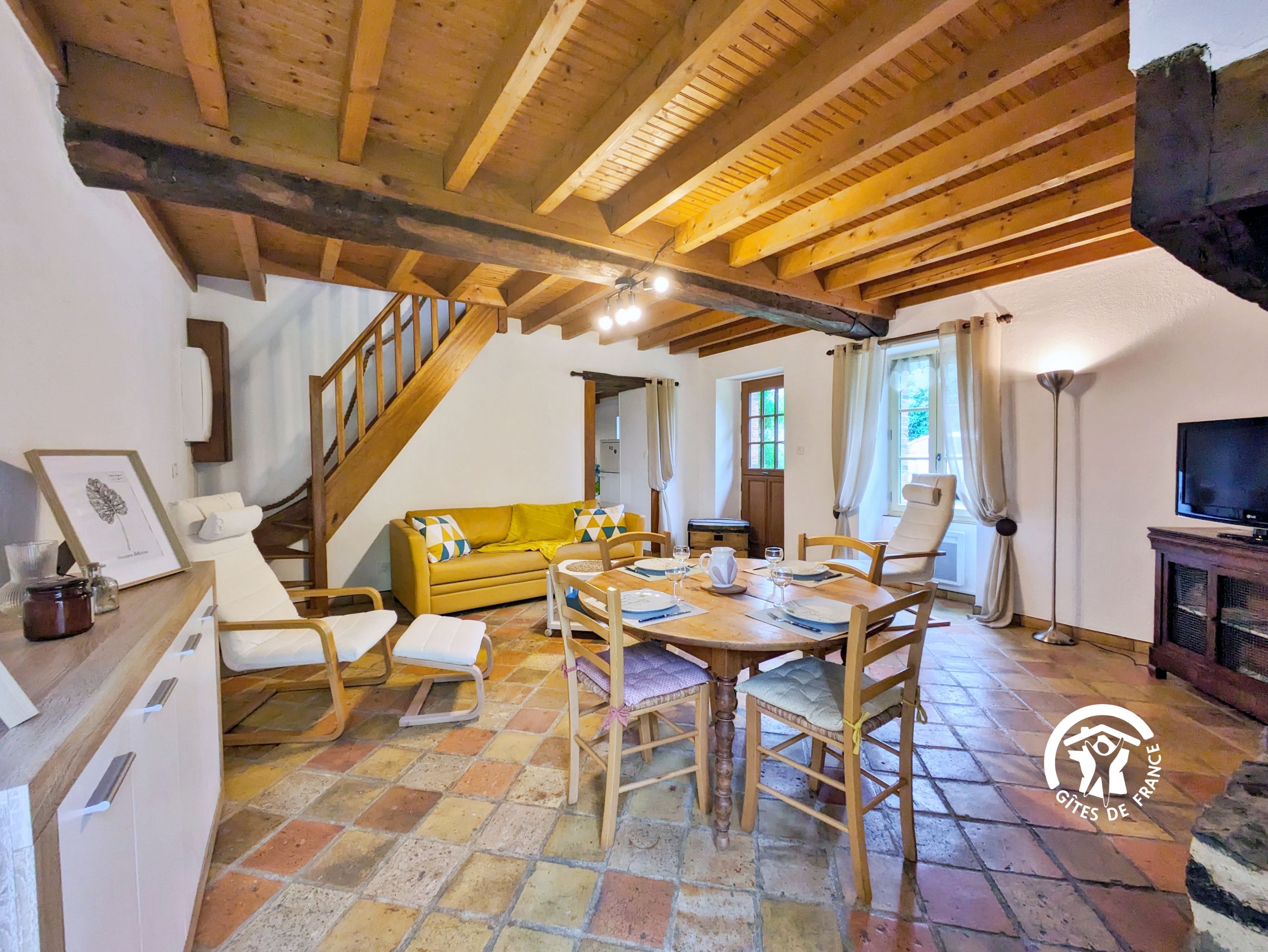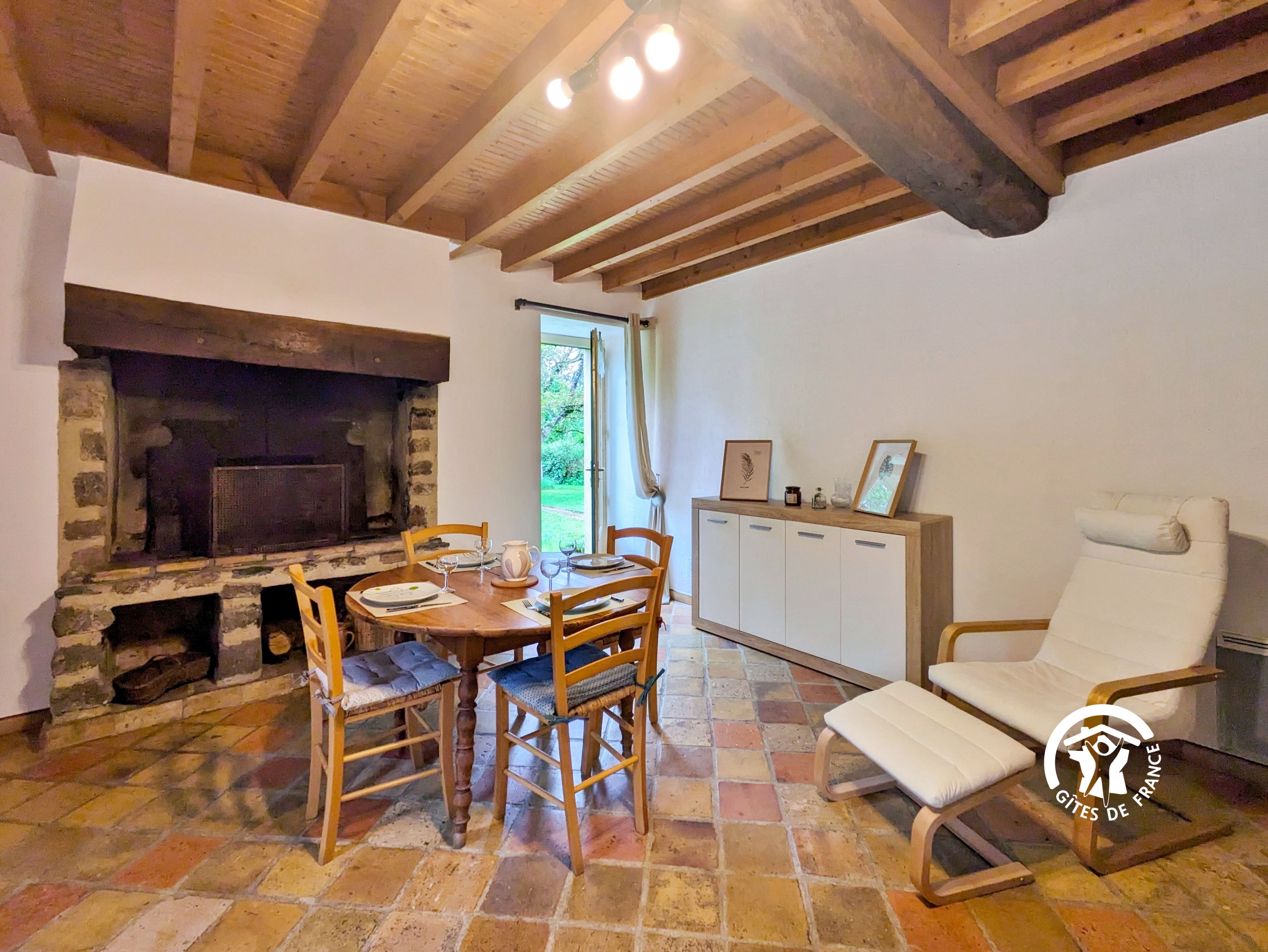 Authentique maison de campagne avec un jardin clos. À l’intérieur, le charme des poutres apparentes et la cheminée créent une atmosphère chaleureuse. Profitez des 1 000m² de terrain arboré, verdoyant et au calme. Dégustez le pain du boulanger paysan cuit au feu de bois à 300 mètres.