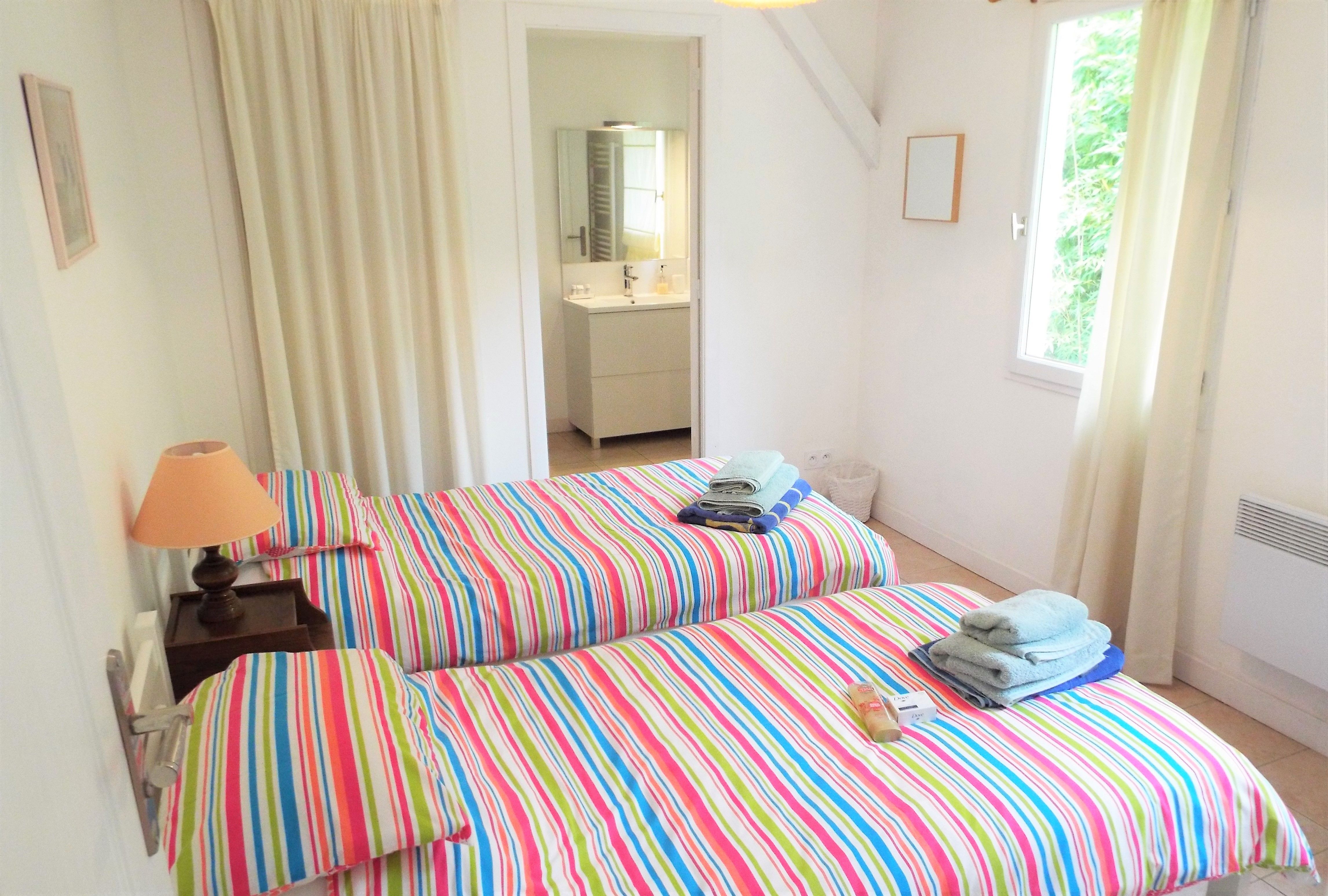 Chambre 1: 2 lits simples Chambre 2: lit double Kitchenette, micro-onde, grille pain, réfrigérateur et bouilloire. Salle de bains privative à chaque chambre avec douche, toilettes et lavabo. Tarifs tout compris (chauffage, wifi, piscine).