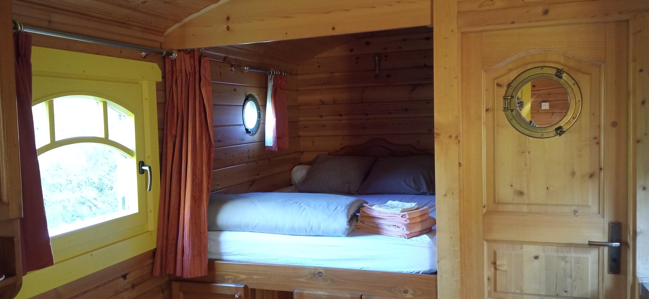 En Vallée de la Sarthe, dans un cadre bucolique plein de charme, au coeur de l’exploitation familiale (volailles), 2 jolies roulottes en bois vous attendent. Terrain non-clos de 200 m² avec terrasse. Coin salon (2 banquettes-tiroirs 90×190) avec coin cuisine, ch. en alcôve (1 lit 140×190), s.d.e/wc. Equip. suppl.: congél. Compris: électricité, draps, linge de…