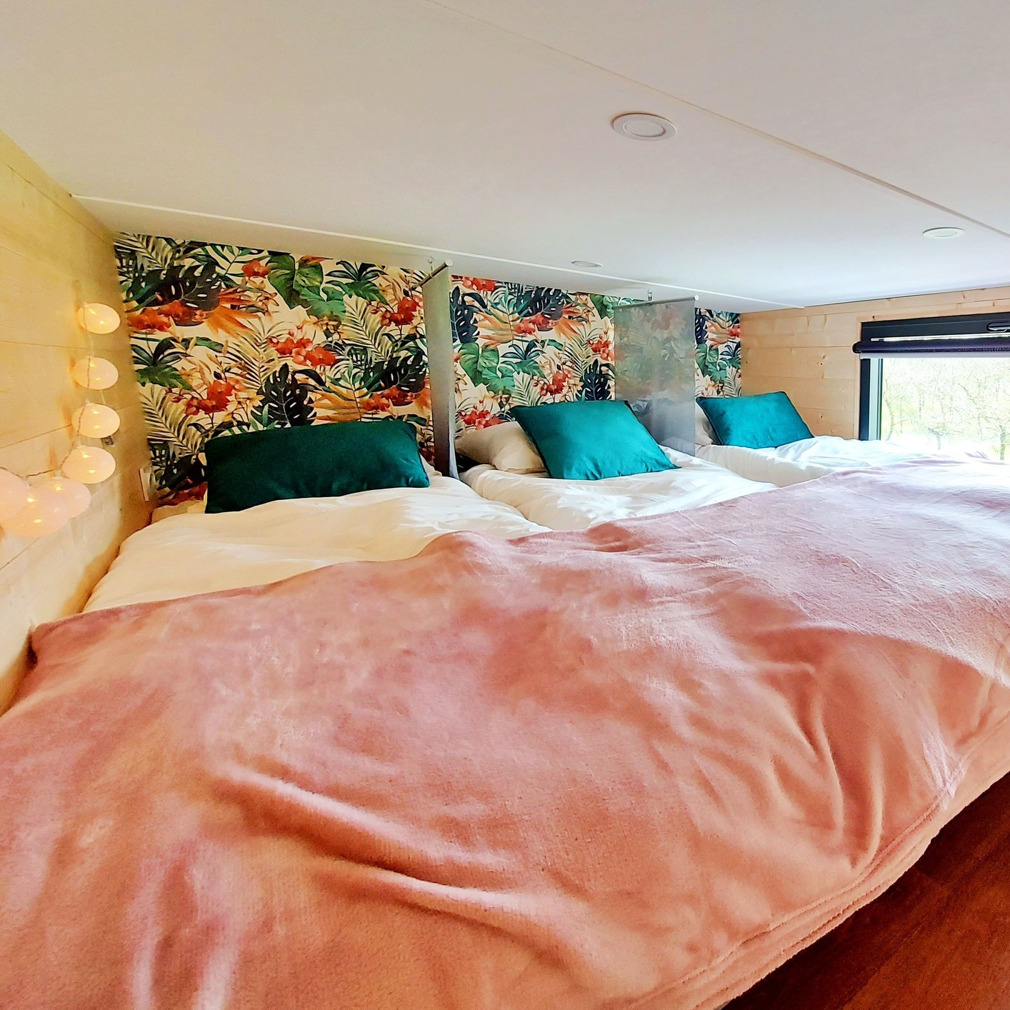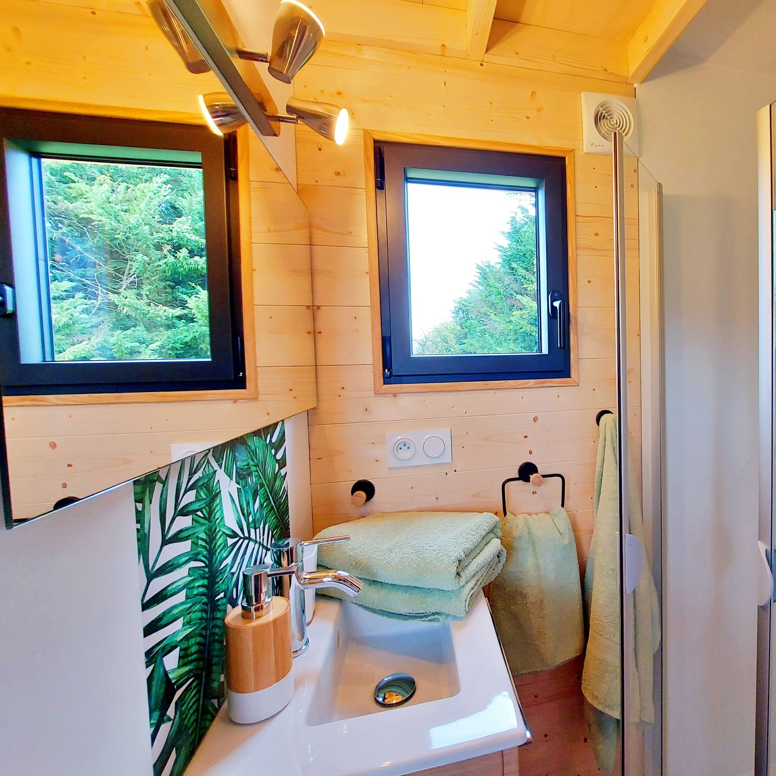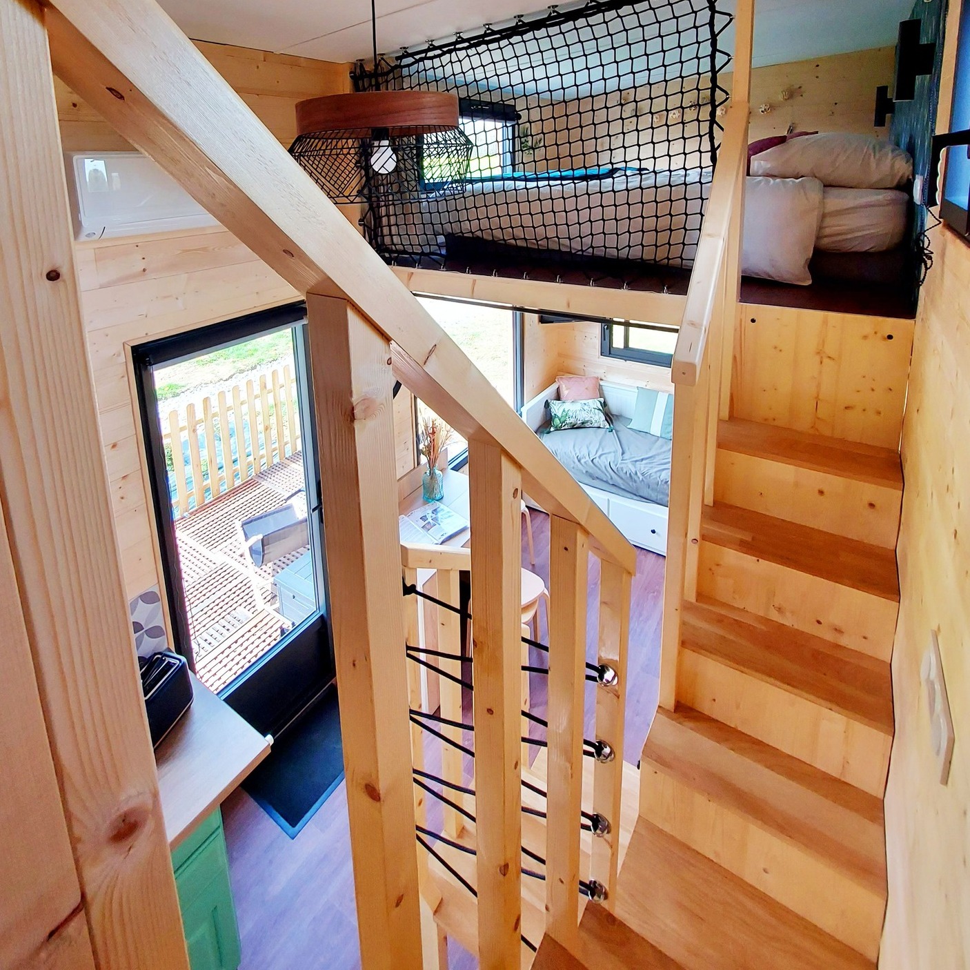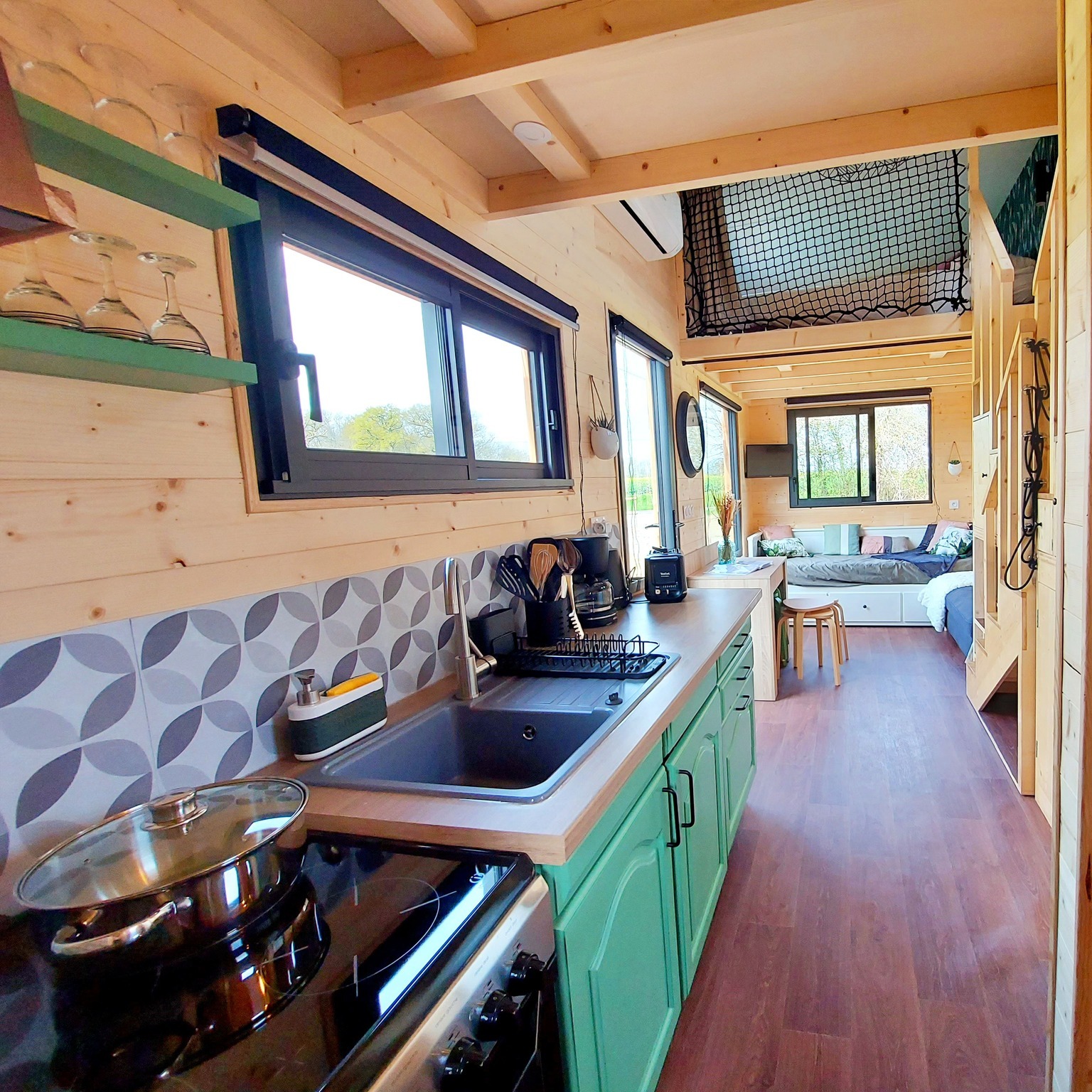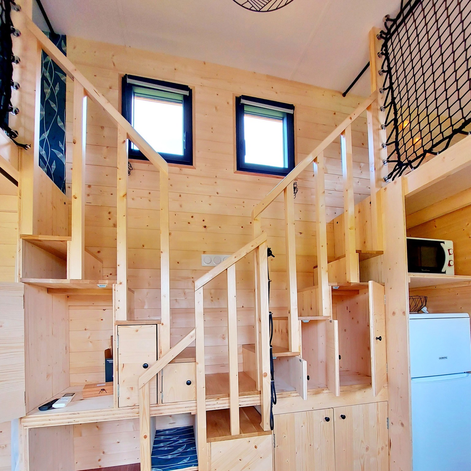 La Tiny, sur 18m² : un espace de vie de 12m² avec un coin cuisine équipée (four, 4 feux vitro, réfrigérateur et compartiment congélateur, grille-pain, cafetière filtre, bouilloire) – espace salon avec banquette – table de repas avec tabourets – rangements – toilettes sèches avec sciure de bois et sac compostable – salle d’eau : douche, lavabo et rangement. En mezzanine : 1 chambre avec 3 matelas 70*200 et 1 chambre avec 2 lits 80*200 – Accès dans la tiny en chaussettes uniquement : rangements de chaussures prévus.