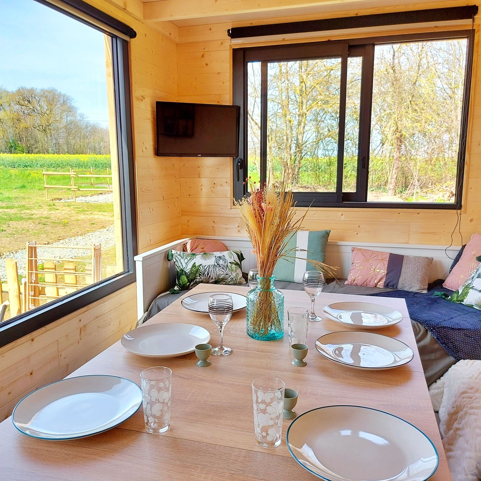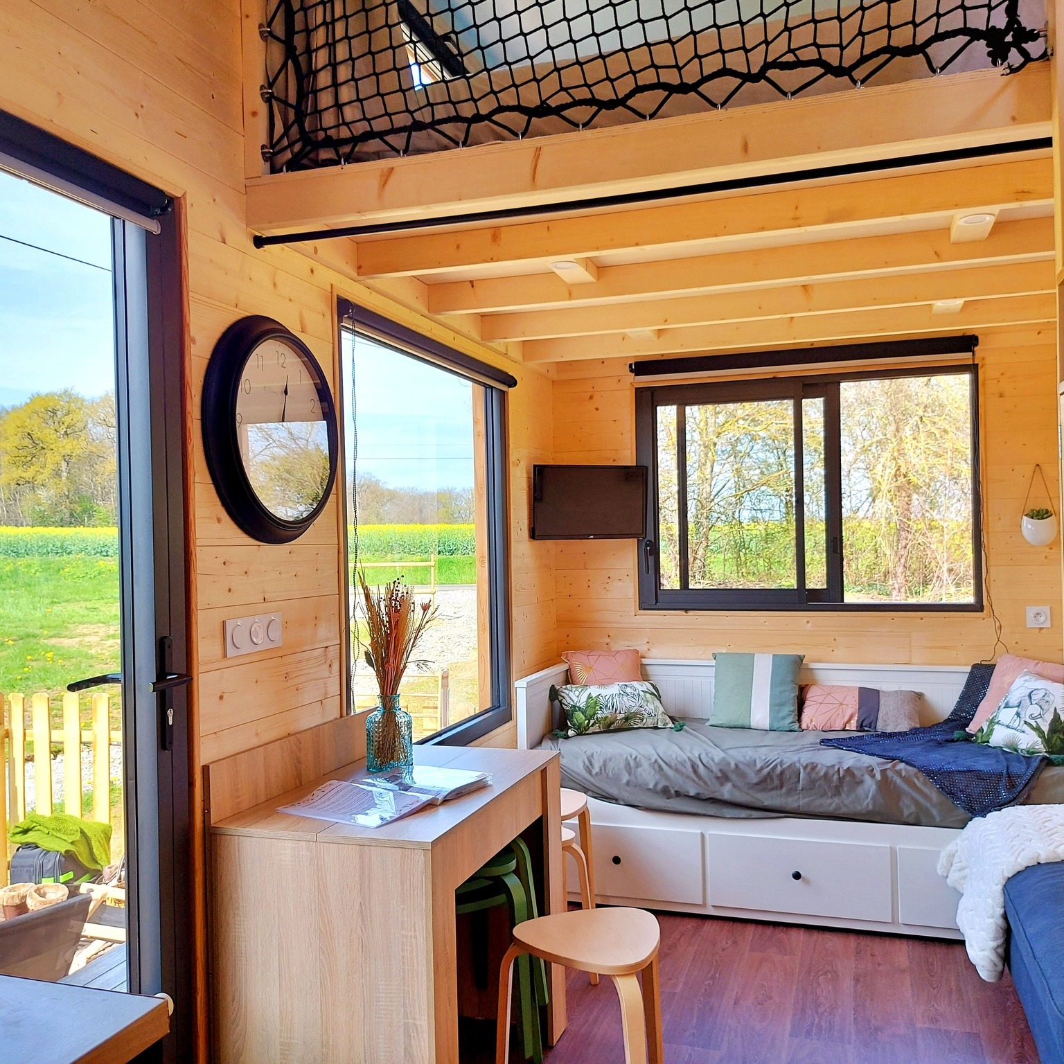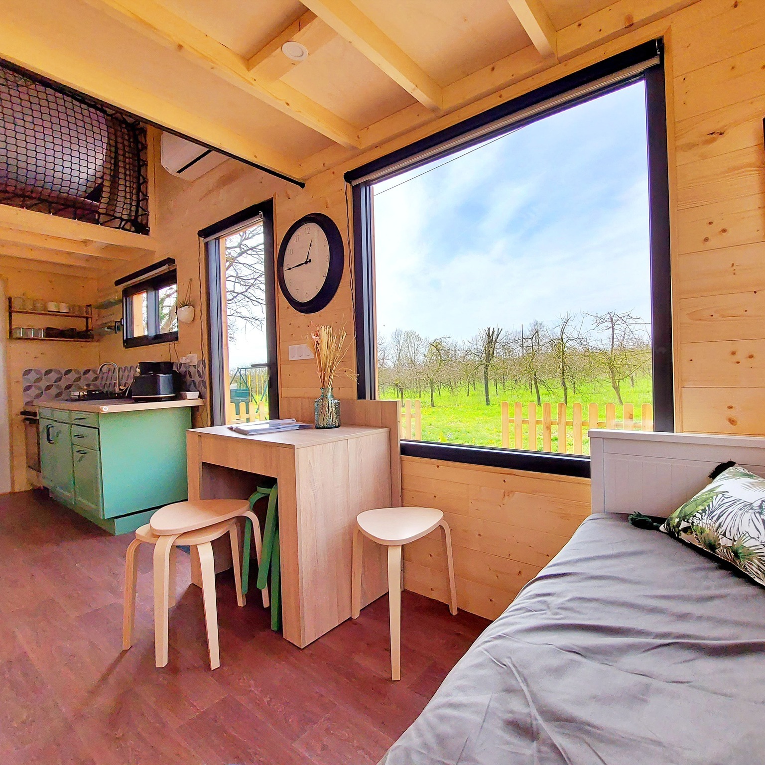 Vous disposez d’un espace privé avec terrasse et espace de jeux avec un portique pour les enfants, les larges baies vitrées de la Tiny donnent sur les vergers et la campagne. Vous pourrez profiter d’un bain nordique installé à l’extérieur et chauffé toute l’année à 32°.