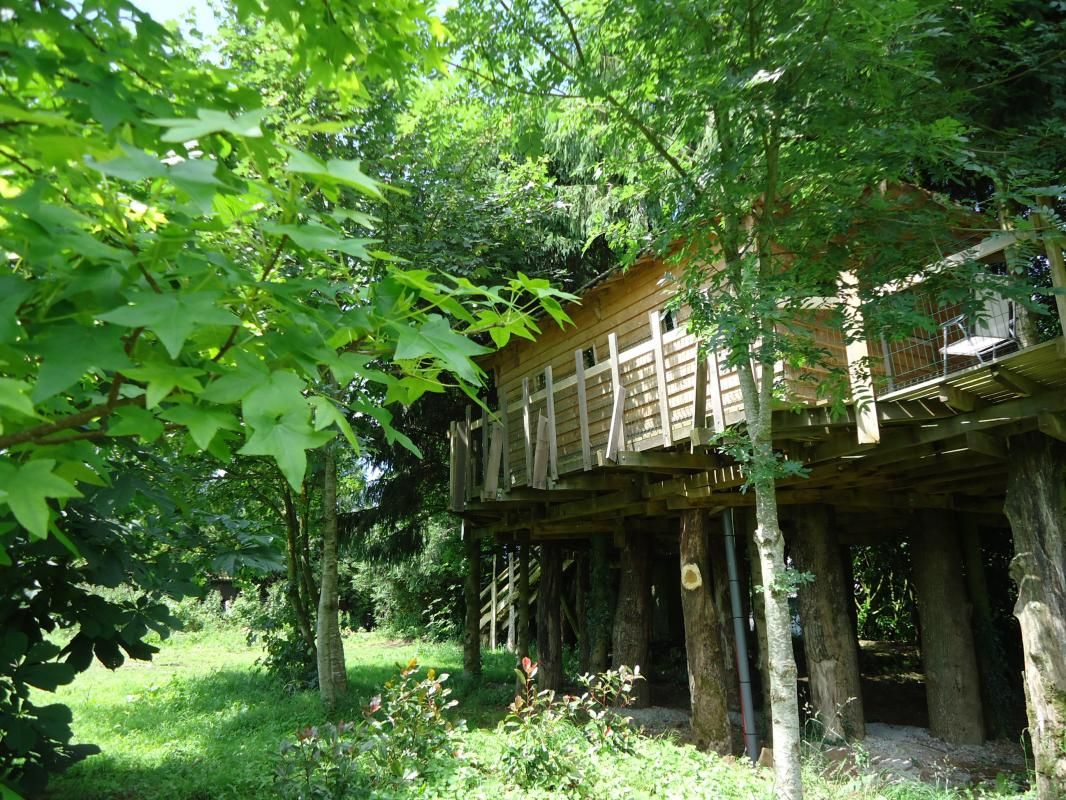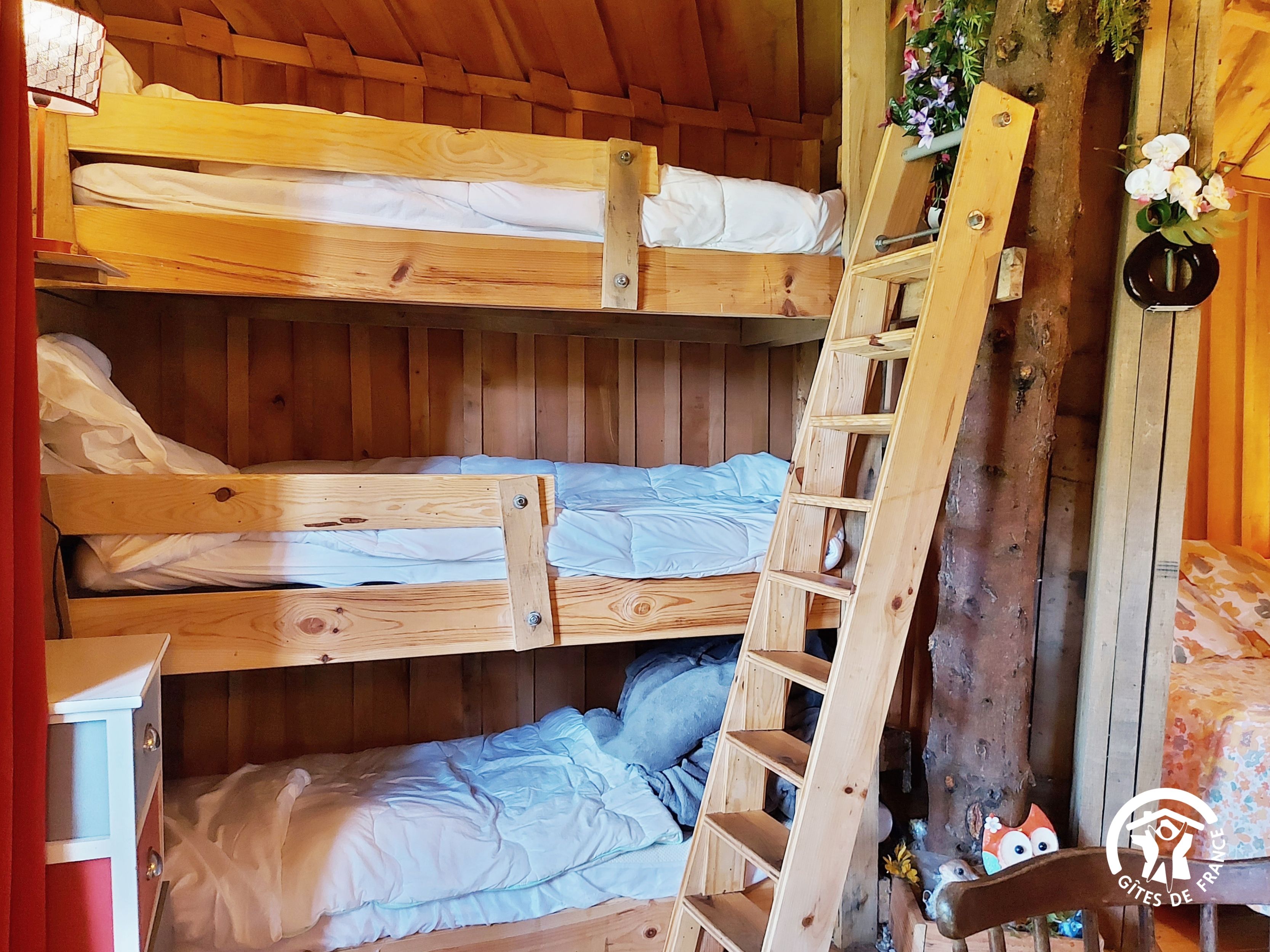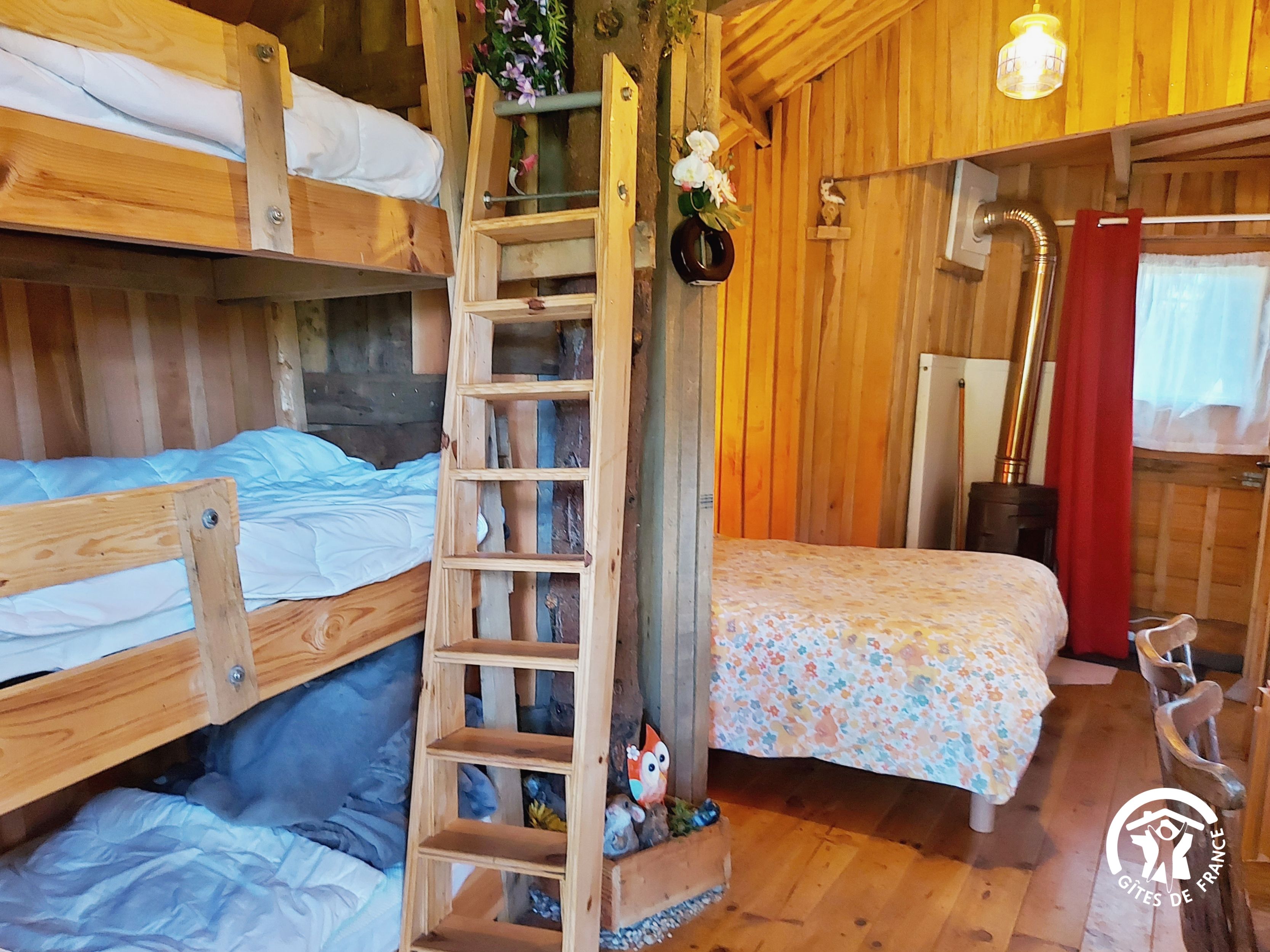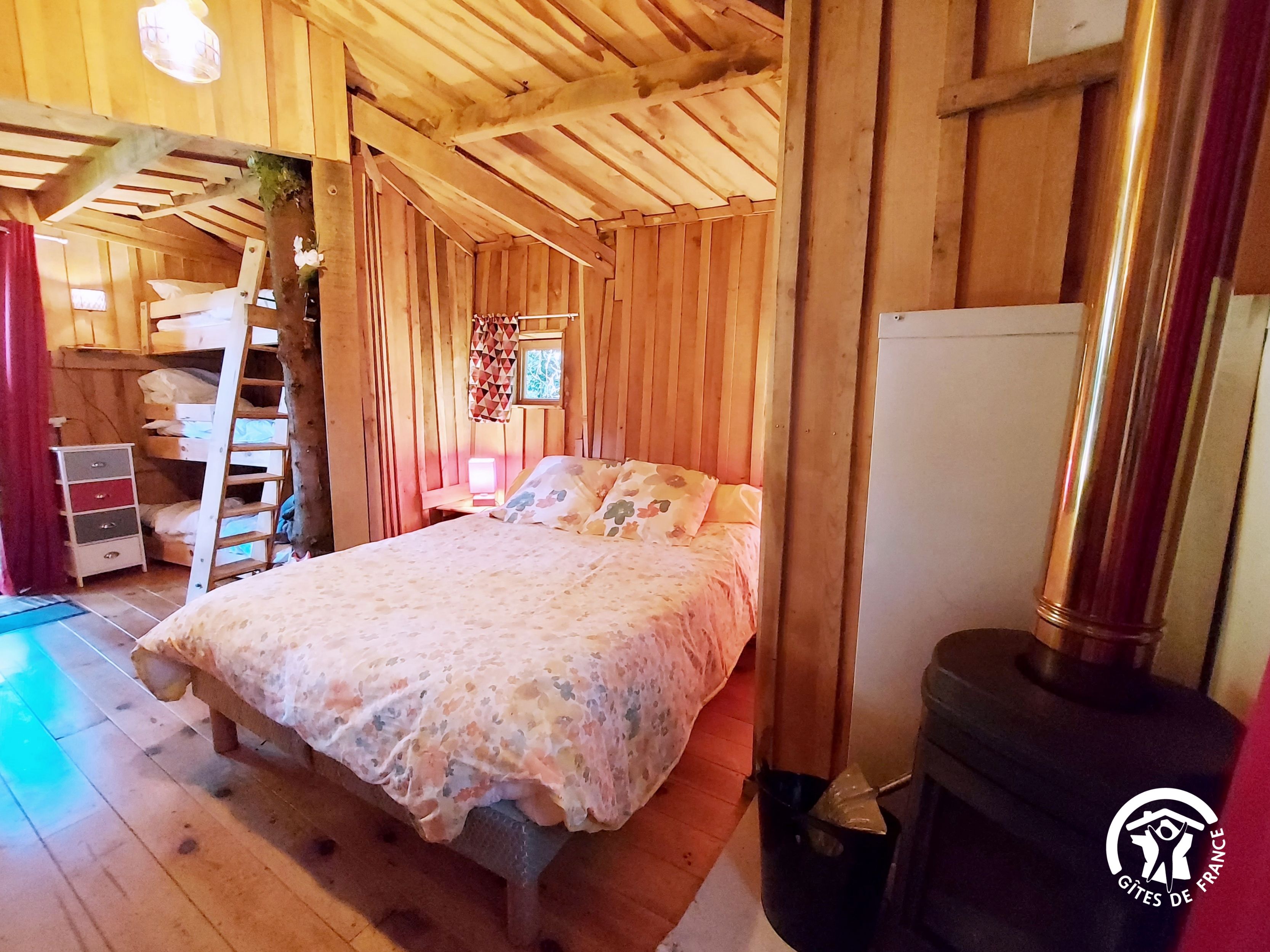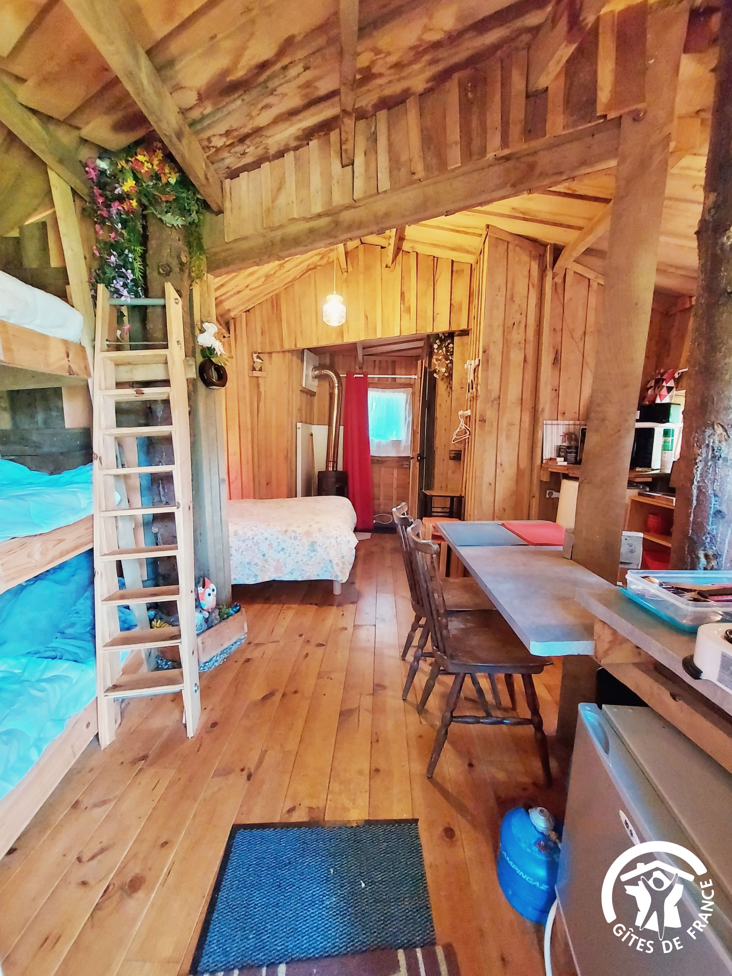 La cabane fait corps avec l’arbre. Elle est rustique et authentique, construite avec du chêne, du châtaigner et du merisier par le propriétaire lui-même.