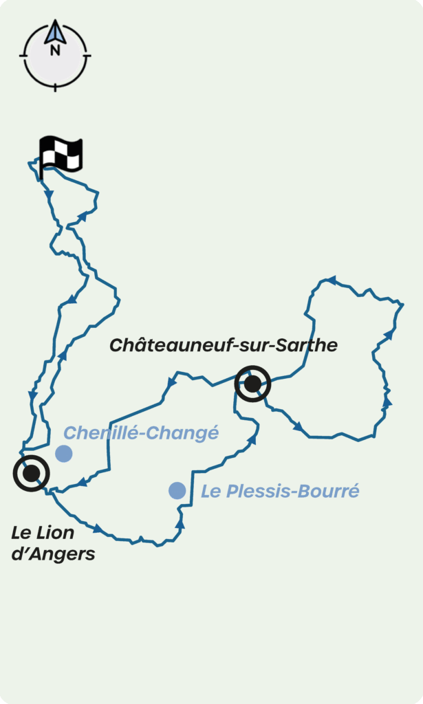 Après le passage au charmant village de Grez-Neuville, bienvenue au Lion-d’Angers, aux abords de l’Isle Briand, magnifique hippodrome empreint d’une atmosphère particulière qui borde la rivière.